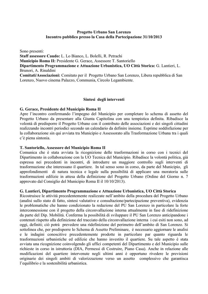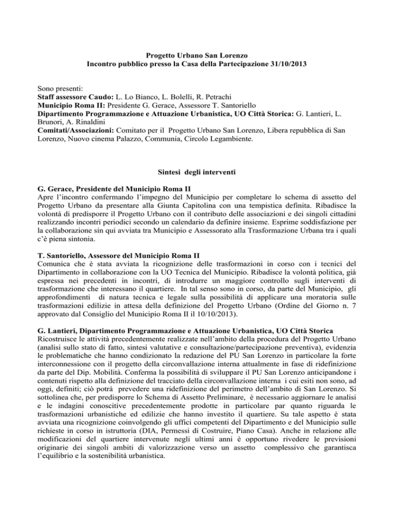 Progetto Urbano San Lorenzo Incontro pubblico presso la Casa della Partecipazione 31/10/2013 Sono presenti: Staff assessore Caudo: L. Lo Bianco, L. Bolelli, R. Petrachi Municipio Roma II: Presidente G. Gerace, Assessore T. Santoriello Dipartimento Programmazione e Attuazione Urbanistica, UO Città Storica: G. Lantieri, L. Brunori, A. Rinaldini Comitati/Associazioni: Comitato per il Progetto Urbano San Lorenzo, Libera repubblica di San Lorenzo, Nuovo cinema Palazzo, Communia, Circolo Legambiente. Sintesi degli interventi G. Gerace, Presidente del Municipio Roma II Apre l’incontro confermando l’impegno del Municipio per completare lo schema di assetto del Progetto Urbano da presentare alla Giunta Capitolina con una tempistica definita. Ribadisce la volontà di predisporre il Progetto Urbano con il contributo delle associazioni e dei singoli cittadini realizzando incontri periodici secondo un calendario da definire insieme. Esprime soddisfazione per la collaborazione sin qui avviata tra Municipio e Assessorato alla Trasformazione Urbana tra i quali c’è piena sintonia. T. Santoriello, Assessore del Municipio Roma II Comunica che è stata avviata la ricognizione delle trasformazioni in corso con i tecnici del Dipartimento in collaborazione con la UO Tecnica del Municipio. Ribadisce la volontà politica, già espressa nei precedenti in incontri, di introdurre un maggiore controllo sugli interventi di trasformazione che interessano il quartiere. In tal senso sono in corso, da parte del Municipio, gli approfondimenti di natura tecnica e legale sulla possibilità di applicare una moratoria sulle trasformazioni edilizie in attesa della definizione del Progetto Urbano (Ordine del Giorno n. 7 approvato dal Consiglio del Municipio Roma II il 10/10/2013). G. Lantieri, Dipartimento Programmazione e Attuazione Urbanistica, UO Città Storica Ricostruisce le attività precedentemente realizzate nell’ambito della procedura del Progetto Urbano (analisi sullo stato di fatto, sintesi valutative e consultazione/partecipazione preventiva), evidenzia le problematiche che hanno condizionato la redazione del PU San Lorenzo in particolare la forte interconnessione con il progetto della circonvallazione interna attualmente in fase di ridefinizione da parte del Dip. Mobilità. Conferma la possibilità di sviluppare il PU San Lorenzo anticipandone i contenuti rispetto alla definizione del tracciato della circonvallazione interna i cui esiti non sono, ad oggi, definiti; ciò potrà prevedere una ridefinizione del perimetro dell’ambito di San Lorenzo. Si sottolinea che, per predisporre lo Schema di Assetto Preliminare, è necessario aggiornare le analisi e le indagini conoscitive precedentemente prodotte in particolare par quanto riguarda le trasformazioni urbanistiche ed edilizie che hanno investito il quartiere. Su tale aspetto è stata avviata una ricognizione coinvolgendo gli uffici competenti del Dipartimento e del Municipio sulle richieste in corso in istruttoria (DIA, Permessi di Costruire, Piano Casa). Anche in relazione alle modificazioni del quartiere intervenute negli ultimi anni è opportuno rivedere le previsioni originarie dei singoli ambiti di valorizzazione verso un assetto complessivo che garantisca l’equilibrio e la sostenibilità urbanistica. G. Gagliardi, Circolo PD San Lorenzo Esprime forti perplessità sull’ipotesi di attuare, così come ipotizzato dal Municipio, una moratoria sulle trasformazioni che interessano il quartiere in attesa di definire il Progetto Urbano San Lorenzo. Non è previsto dalla normativa e nessun atto politico può modificare la normativa vigente. E’ possibile oltre che necessario realizzare una attenta valutazione delle richieste con istruttorie rigorose da parte dei diversi uffici responsabili. In tal senso un atto di indirizzo dell’Assessore può costituire una importante indicazione. Altrettanto necessario ampliare il perimetro delle morfologie urbane della Carta per la Qualità estendendolo all’intero quartiere di San Lorenzo. D. Festa, Libera Repubblica di San Lorenzo Necessario ridefinire e rafforzare il processo di partecipazione recentemente avviato come parte attiva nella definizione del Progetto Urbano San Lorenzo. Introdurre un modello di progettazione partecipata di grande discontinuità rispetto al passato in cui il quartiere, nelle sue diverse realtà, sia protagonista delle scelte progettuali. G. Cultrera, Comitato per il Progetto Urbano San Lorenzo Considera prioritario riprendere i temi generali del PU da sviluppare con incontri tematici su i singoli temi specifici già emersi nelle precedenti riunioni. E’ necessario ridefinire la “soglia” del PU corrispondente a un nuovo livello di vivibilità del quartiere che superi le attuali criticità più volte denunciate dei cittadini. In tal senso è necessario ripensare le previsioni del PRG su gli Ambiti di Valorizzazione. Ribadisce la necessità di una forte volontà politica non solo da parte dell’Amministrazione ma anche dei singoli cittadini. Communia Necessario rivedere i mix funzionali degli Ambiti di Valorizzazione. Esprime pare contrario alla realizzazione dei parcheggi interrati anche in relazione alle criticità idrogeologiche del sottosuolo più volte evidenziate. Ribadisce la presenza eccessiva dell’Università “La Sapienza” all’interno del quartiere con strutture spesso non a servizio degli studenti. In tal senso è necessario salvaguardare la vocazione popolare e abitativa del quartiere anche con la presenza di residenze universitarie. Si propone di eliminare, all’interno del Progetto Urbano, gli incrementi di SUL previsti dalle NTA del PRG (cubatura zero). G. Greccio, Comitato per il Progetto Urbano San Lorenzo - Si ricorda la problematica del recupero degli edifici bombardati, che è stata oggetto di una petizione al Sindaco Marino, affinché siano preservati quale monumento diffuso in memoria del bombardamento del luglio 1943. In tal senso si evidenzia la nec