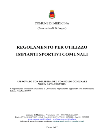 COMUNE DI MEDICINA (Provincia di Bologna) REGOLAMENTO PER UTILIZZO IMPIANTI SPORTIVI COMUNALI APPROVATO CON DELIBERA DEL CONSIGLIO COMUNALE N.83 IN DATA 29/05/2015. Il regolamento sostituisce ed annulla il precedente regolamento, approvato con deliberazione C.C. n. 46 del 31/3/2011. Comune di Medicina - Via Libertà 103 – 40059 Medicina (BO) Partita I.V.A. 00508891207 – Cod. Fisc.00421580374; Tel 051 6979111 – Fax 051 6979222 www.comune.medicina.bo.it - [email protected] Indirizzo di posta elettronica certificata: [email protected] Pagina 1 di 7 TITOLO I: PRINCIPI GENERALI ART. 1 – FINALITA’ L’Amministrazione comunale: ¾ destina prioritariamente i propri impianti sportivi all’attività sportiva anche non agonistica dei minori residenti nel Comune di Medicina; ¾ persegue la promozione dello Sport nei suoi aspetti formativo-ricreativi rispondendo ai bisogni fisici, psichici e sociali dei cittadini, con particolare attenzione alle fasce dell’infanzia, dell’adolescenza e dell’ età anziana; ¾ tende ad assicurare al più ampio numero di cittadini la partecipazione alle attività sportive come occasione di impiego del tempo libero e come momento di formazione e di aggregazione; ¾ favorisce e promuove l’associazionismo e la gestione degli impianti e delle attività sportive , per una gestione aperta ed unitaria delle attività stesse; ¾ opera affinchè siano rispettati , anche nell’utilizzo e nella gestione degli impianti sportivi, criteri di corretto utilizzo e di efficienza economica; ART. 2 – OGGETTO Il presente regolamento ha per oggetto la disciplina delle forme di utilizzo e di gestione degli impianti sportivi di proprietà comunale . Detti impianti possono essere gestiti nelle seguenti forme: ¾ direttamente dall’Amministrazione Comunale, in economia, qualora gli impianti abbiano caratteristiche tali da non consentirne la gestione ottimale con altre modalità; ¾ mediante affidamento della concessione di gestione a soggetti terzi qualora gli impianti, per dimensioni e tipologie, abbiano caratteristiche tali da non poter essere gestiti direttamente dall’Amministrazione Comunale TITOLO II : COMUNALE IMPIANTI GESTITI DIRETTAMENTE DALL’AMMINISTRAZIONE ART. 3 – INDIVIDUAZIONE IMPIANTI Gli impianti a gestione diretta sono: Palestra Scolastica di Via C. Battisti – Palestra Scolastica “G. Zanardi” – Palestra Scolastica di Villa Fontana, Pista di pattinaggio Cappellari, Pista basket di Viale Oberdan, Cartina di Orienteering. ART. 4 – MODALITA’ DI UTILIZZO Le suddette strutture di proprietà comunale vengono concesse periodicamente in uso alle Società, Enti o Associazioni Sportive e ricreative, che ne facciano richiesta, per lo svolgimento delle loro attività di base e ricreative. La concessione è subordinata alle esigenze degli istituti scolastici locali ed ha carattere stagionale, pertanto, non costituisce né precedente, né tanto meno un diritto acquisito. Per stagione sportiva si intende il periodo da Settembre di un anno a Giugno dell’anno seguente. Per consentire la redazione del piano stagionale di utilizzo, gli interessati, entro e non oltre il 31 Agosto di ogni anno, dovranno presentare domanda all’ Ufficio Sport del Comune, utilizzando l’apposito modulo reperibile sul sito e/ o presso l’Ufficio stesso; le eventuali richieste pervenute dopo la scadenza fissata verranno prese in considerazione solo qualora esista una disponibilità residua nelle palestre. Pagina 2 di 7 Il Responsabile Servizi alla Persona, sentita la Consulta dello Sport: ¾ redige il piano di utilizzo stagionale delle palestre; ¾ rilascia le singole concessioni . Eventuali modifiche per quanto riguarda giornate e orari possono essere effettuate unicamente dal Responsabile Servizi alla Persona. L’Amministrazione Comunale si riserva l’uso delle proprie palestre per lo svolgimento di manifestazioni di pubblico interesse, da segnalare con congruo anticipo ( non inferiore a gg. 10) alle Scuole ed alle Società/Associazioni sportive che utilizzano l’impianto. ART. 5 – DIVIETI E’ fatto assoluto divieto di: ¾ subconcedere l’uso, anche parziale, della palestra o utilizzarla per attività diverse da quelle autorizzate; ¾ fare entrare spettatori o, comunque, persone che non prendono parte attiva alla pratica sportiva, fatto salvo, eventualmente, un modesto numero di accompagnatori da individuarsi da parte del concessionario tenendo conto dell’obbligo di garantire la sicurezza di tutti i presenti nel rispetto delle disposizioni di legge vigenti in materia. L’Amministrazione comunale resta sollevata da ogni e qualsiasi responsabilità derivante dalla inosservanza di quanto sopra; ¾ occupare o utilizzare strutture sportive , mobili ed immobili, non autorizzate; ¾ utilizzare le palestre in orari e giornate non autorizzati; ¾ fumare all’interno degli impianti( L. 11/11/1975 , N. 584) ART. 6 – IMPEGNI – OBBLIGHI – RESPONSABILITA’ DEL CONCESSIONARIO Il Concessionario ha l’obbligo di: ¾ garantire la presenza di un responsabile per tutta la durata in cui l’impianto è in uso; ¾ avere il massimo rispetto e cura della struttura concessa in uso e delle attrezzature mobili ivi presenti ; ¾ assumersi ogni responsabilità per quanto accade nelle ore di utilizzo per danni provocati da atleti dirigenti o terzi. Qualora vengano arrecati danni di qualsiasi natura,la Società/Associazione sportiva , individuata come responsabile, dovrà ripristinare il danno arrecato nei tempi concordati con l’Amministrazione Comunale in relazione all’entità del danno stesso. Il mancato ripristino del danno costituisce elemento per la revoca della concessione. ¾ ripristino della palestra al termine di ogni turno di utilizzo; ¾ avere cura che tutti gli utilizzatori accedano alla palestra con calzature idonee al tipo di pavimentazione esistente; ¾ provvedere al pagamento delle tariffe o dei contributi economici indicati nell’atto di concessione. Il mancato paga