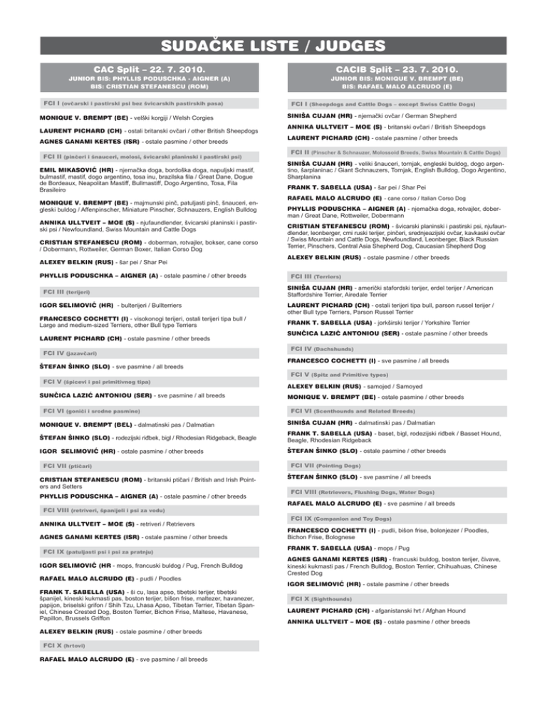 SUDAČKE LISTE / JUDGES CAC Split – 22. 7. 2010. CACIB Split – 23. 7. 2010. JUNIOR BIS: PHYLLIS PODUSCHKA - AIGNER (A) BIS: CRISTIAN STEFANESCU (ROM) JUNIOR BIS: MONIQUE V. BREMPT (BE) BIS: RAFAEL MALO ALCRUDO (E) FCI I (ovčarski i pastirski psi bez švicarskih pastirskih pasa) MONIQUE V. BREMPT (BE) - velški korgiji / Welsh Corgies LAURENT PICHARD (CH) - ostali britanski ovčari / other British Sheepdogs AGNES GANAMI KERTES (ISR) - ostale pasmine / other breeds FCI II (pinčeri i šnauceri, molosi, švicarski planinski i pastirski psi) EMIL MIKASOVIĆ (HR) - njemačka doga, bordoška doga, napuljski mastif, bulmastif, mastif, dogo argentino, tosa inu, brazilska fila / Great Dane, Dogue de Bordeaux, Neapolitan Mastiff, Bullmastiff, Dogo Argentino, Tosa, Fila Brasileiro MONIQUE V. BREMPT (BE) - majmunski pinč, patuljasti pinč, šnauceri, engleski buldog / Affenpinscher, Miniature Pinscher, Schnauzers, English Bulldog ANNIKA ULLTVEIT – MOE (S) - njufaundlender, švicarski planinski i pastirski psi / Newfoundland, Swiss Mountain and Cattle Dogs CRISTIAN STEFANESCU (ROM) - doberman, rotvajler, bokser, cane corso / Dobermann, Rottweiler, German Boxer, Italian Corso Dog ALEXEY BELKIN (RUS) - šar pei / Shar Pei PHYLLIS PODUSCHKA – AIGNER (A) - ostale pasmine / other breeds FCI III (terijeri) IGOR SELIMOVIĆ (HR) - bulterijeri / Bullterriers FRANCESCO COCHETTI (I) - visokonogi terijeri, ostali terijeri tipa bull / Large and medium-sized Terriers, other Bull type Terriers LAURENT PICHARD (CH) - ostale pasmine / other breeds FCI IV (jazavčari) ŠTEFAN ŠINKO (SLO) - sve pasmine / all breeds FCI V (špicevi i psi primitivnog tipa) SUNČICA LAZIĆ ANTONIOU (SER) - sve pasmine / all breeds FCI VI (goniči i srodne pasmine) FCI I (Sheepdogs and Cattle Dogs – except Swiss Cattle Dogs) SINIŠA CUJAN (HR) - njemački ovčar / German Shepherd ANNIKA ULLTVEIT – MOE (S) - britanski ovčari / British Sheepdogs LAURENT PICHARD (CH) - ostale pasmine / other breeds FCI II (Pinscher & Schnauzer, Molossoid Breeds, Swiss Mountain & Cattle Dogs) SINIŠA CUJAN (HR) - veliki šnauceri, tornjak, engleski buldog, dogo argentino, šarplaninac / Giant Schnauzers, Tornjak, English Bulldog, Dogo Argentino, Sharplanina FRANK T. SABELLA (USA) - šar pei / Shar Pei RAFAEL MALO ALCRUDO (E) - cane corso / Italian Corso Dog PHYLLIS PODUSCHKA – AIGNER (A) - njemačka doga, rotvajler, doberman / Great Dane, Rottweiler, Dobermann CRISTIAN STEFANESCU (ROM) - švicarski planinski i pastirski psi, njufaundlender, leonberger, crni ruski terijer, pinčeri, srednjeazijski ovčar, kavkaski ovčar / Swiss Mountain and Cattle Dogs, Newfoundland, Leonberger, Black Russian Terrier, Pinschers, Central Asia Shepherd Dog, Caucasian Shepherd Dog ALEXEY BELKIN (RUS) - ostale pasmine / other breeds FCI III (Terriers) SINIŠA CUJAN (HR) - američki stafordski terijer, erdel terijer / American Staffordshire Terrier, Airedale Terrier LAURENT PICHARD (CH) - ostali terijeri tipa bull, parson russel terijer / other Bull type Terriers, Parson Russel Terrier FRANK T. SABELLA (USA) - jorkširski terijer / Yorkshire Terrier SUNČICA LAZIĆ ANTONIOU (SER) - ostale pasmine / other breeds FCI IV (Dachshunds) FRANCESCO COCHETTI (I) - sve pasmine / all breeds FCI V (Spitz and Primitive types) ALEXEY BELKIN (RUS) - samojed / Samoyed MONIQUE V. BREMPT (BE) - ostale pasmine / other breeds FCI VI (Scenthounds and Related Breeds) MONIQUE V. BREMPT (BEL) - dalmatinski pas / Dalmatian SINIŠA CUJAN (HR) - dalmatinski pas / Dalmatian ŠTEFAN ŠINKO (SLO) - rodezijski riđbek, bigl / Rhodesian Ridgeback, Beagle FRANK T. SABELLA (USA) - baset, bigl, rodezijski riđbek / Basset Hound, Beagle, Rhodesian Ridgeback IGOR SELIMOVIĆ (HR) - ostale pasmine / other breeds ŠTEFAN ŠINKO (SLO) - ostale pasmine / other breeds FCI VII (ptičari) CRISTIAN STEFANESCU (ROM) - britanski ptičari / British and Irish Pointers and Setters PHYLLIS PODUSCHKA – AIGNER (A) - ostale pasmine / other breeds FCI VIII (retriveri, španijeli i psi za vodu) ANNIKA ULLTVEIT – MOE (S) - retriveri / Retrievers AGNES GANAMI KERTES (ISR) - ostale pasmine / other breeds FCI IX (patuljasti psi i psi za pratnju) IGOR SELIMOVIĆ (HR - mops, francuski buldog / Pug, French Bulldog RAFAEL MALO ALCRUDO (E) - pudli / Poodles FRANK T. SABELLA (USA) - ši cu, lasa apso, tibetski terijer, tibetski španijel, kineski kukmasti pas, boston terijer, bišon frise, maltezer, havanezer, papijon, briselski grifon / Shih Tzu, Lhasa Apso, Tibetan Terrier, Tibetan Spaniel, Chinese Crested Dog, Boston Terrier, Bichon Frise, Maltese, Havanese, Papillon, Brussels Griffon ALEXEY BELKIN (RUS) - ostale pasmine / other breeds FCI X (hrtovi) RAFAEL MALO ALCRUDO (E) - sve pasmine / all breeds FCI VII (Pointing Dogs) ŠTEFAN ŠINKO (SLO) - sve pasmine / all breeds FCI VIII (Retrievers, Flushing Dogs, Water Dogs) RAFAEL MALO ALCRUDO (E) - sve pasmine / all breeds FCI IX (Companion and Toy Dogs) FRANCESCO COCHETTI (I) - pudli, bišon frise, bolonjezer / Poodles, Bichon Frise, Bolognese FRANK T. SABELLA (USA) - mops / Pug AGNES GANAMI KERTES (ISR) - francuski buldog, boston terijer, čivave, kineski kukmasti pas / French Bulldog, Boston Terrier, Chihuahuas, Chinese Crested Dog IGOR SELIMOVIĆ (HR) - ostale pasmine / other breeds FCI X (Sighthounds) LAURENT PICHARD (CH) - afganistanski hrt / Afghan Hound ANNIKA ULLTVEIT – MOE (S) - ostale pasmine / other breeds