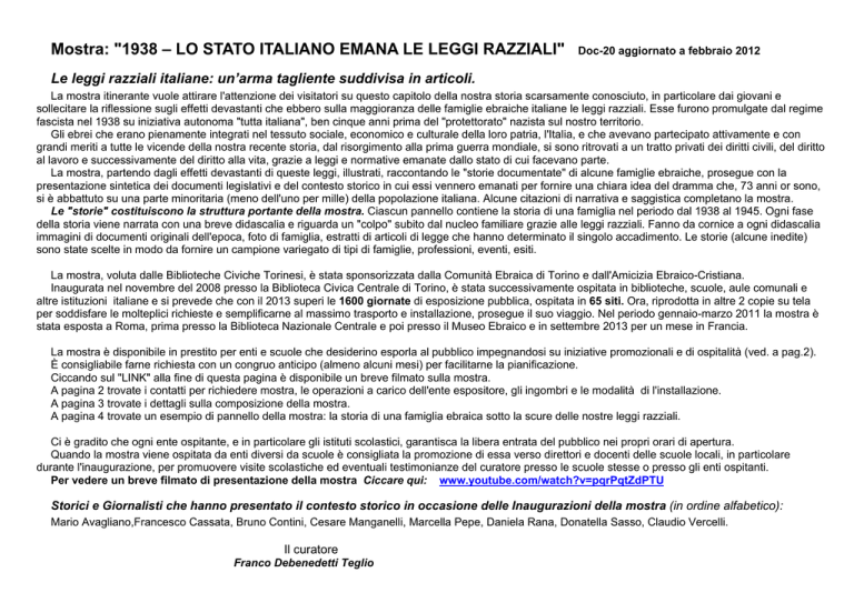 Mostra: "1938 – LO STATO ITALIANO EMANA LE LEGGI RAZZIALI" Doc-20 aggiornato a febbraio 2012 Le leggi razziali italiane: un’arma tagliente suddivisa in articoli. La mostra itinerante vuole attirare l'attenzione dei visitatori su questo capitolo della nostra storia scarsamente conosciuto, in particolare dai giovani e sollecitare la riflessione sugli effetti devastanti che ebbero sulla maggioranza delle famiglie ebraiche italiane le leggi razziali. Esse furono promulgate dal regime fascista nel 1938 su iniziativa autonoma "tutta italiana", ben cinque anni prima del "protettorato" nazista sul nostro territorio. Gli ebrei che erano pienamente integrati nel tessuto sociale, economico e culturale della loro patria, l'Italia, e che avevano partecipato attivamente e con grandi meriti a tutte le vicende della nostra recente storia, dal risorgimento alla prima guerra mondiale, si sono ritrovati a un tratto privati dei diritti civili, del diritto al lavoro e successivamente del diritto alla vita, grazie a leggi e normative emanate dallo stato di cui facevano parte. La mostra, partendo dagli effetti devastanti di queste leggi, illustrati, raccontando le "storie documentate" di alcune famiglie ebraiche, prosegue con la presentazione sintetica dei documenti legislativi e del contesto storico in cui essi vennero emanati per fornire una chiara idea del dramma che, 73 anni or sono, si è abbattuto su una parte minoritaria (meno dell'uno per mille) della popolazione italiana. Alcune citazioni di narrativa e saggistica completano la mostra. Le "storie" costituiscono la struttura portante della mostra. Ciascun pannello contiene la storia di una famiglia nel periodo dal 1938 al 1945. Ogni fase della storia viene narrata con una breve didascalia e riguarda un "colpo" subito dal nucleo familiare grazie alle leggi razziali. Fanno da cornice a ogni didascalia immagini di documenti originali dell'epoca, foto di famiglia, estratti di articoli di legge che hanno determinato il singolo accadimento. Le storie (alcune inedite) sono state scelte in modo da fornire un campione variegato di tipi di famiglie, professioni, eventi, esiti. La mostra, voluta dalle Biblioteche Civiche Torinesi, è stata sponsorizzata dalla Comunità Ebraica di Torino e dall'Amicizia Ebraico-Cristiana. Inaugurata nel novembre del 2008 presso la Biblioteca Civica Centrale di Torino, è stata successivamente ospitata in biblioteche, scuole, aule comunali e altre istituzioni italiane e si prevede che con il 2013 superi le 1600 giornate di esposizione pubblica, ospitata in 65 siti. Ora, riprodotta in altre 2 copie su tela per soddisfare le molteplici richieste e semplificarne al massimo trasporto e installazione, prosegue il suo viaggio. Nel periodo gennaio-marzo 2011 la mostra è stata esposta a Roma, prima presso la Biblioteca Nazionale Centrale e poi presso il Museo Ebraico e in settembre 2013 per un mese in Francia. La mostra è disponibile in prestito per enti e scuole che desiderino esporla al pubblico impegnandosi su iniziative promozionali e di ospitalità (ved. a pag.2). È consigliabile farne richiesta con un congruo anticipo (almeno alcuni mesi) per facilitarne la pianificazione. Ciccando sul "LINK" alla fine di questa pagina è disponibile un breve filmato sulla mostra. A pagina 2 trovate i contatti per richiedere mostra, le operazioni a carico dell'ente espositore, gli ingombri e le modalità di l'installazione. A pagina 3 trovate i dettagli sulla composizione della mostra. A pagina 4 trovate un esempio di pannello della mostra: la storia di una famiglia ebraica sotto la scure delle nostre leggi razziali. Ci è gradito che ogni ente ospitante, e in particolare gli istituti scolastici, garantisca la libera entrata del pubblico nei propri orari di apertura. Quando la mostra viene ospitata da enti diversi da scuole è consigliata la promozione di essa verso direttori e docenti delle scuole locali, in particolare durante l'inaugurazione, per promuovere visite scolastiche ed eventuali testimonianze del curatore presso le scuole stesse o presso gli enti ospitanti. Per vedere un breve filmato di presentazione della mostra Ciccare qui: www.youtube.com/watch?v=pqrPqtZdPTU Storici e Giornalisti che hanno presentato il contesto storico in occasione delle Inaugurazioni della mostra (in ordine alfabetico): Mario Avagliano,Francesco Cassata, Bruno Contini, Cesare Manganelli, Marcella Pepe, Daniela Rana, Donatella Sasso, Claudio Vercelli. Il curatore Franco Debenedetti Teglio Riferimenti e contatti Per organizzare e pianificare l'esposizione della mostra presso scuole, biblioteche, musei o altri enti, per concordare eventuali interventi di presentazione e/o testimonianza contattare il curatore, Franco Debenedetti Teglio - Mail [email protected] - Tel 011.5176332 - Cell 335.6030929 - Fax 011.534769 che provvederà a chiedere l'autorizzazione alla dott. Patrizia Zanetti - Responsabile ufficio attività culturali delle Biblioteche Civiche Torinesi. Per concordare ritiri e rientri della mostra contattare il Centro Rete delle Biblioteche Civiche Torinesi: Gabriella Molino – Mail [email protected] - 338,5672153 Sono a carico e a cura dell'ente espositore: Il trasporto della mostra. Essa è trasportabile anche su una semplice auto berlina con sedili ribaltati, è contenuta in 2 o 3 borse cilindriche. Diametro: 25 cm. - Lunghezza: 145cm. - Peso tot: 11 kg. Ad essa possono essere aggiunti eventuali materiali ausiliari (quaderno visitatori, DVD filmati,bibliografia,filmografia). La promozione e pubblicizzazione della mostra presso possibili visitatori: stampa e diffusione di locandine, inviti, volantini, e.mail e telefonate, passa parola. Siamo a disposizione dell'ente espositore per fornirne i contenuti. La disponibilità di griglie o altre attrezzature per appendere i pannelli del peso di 500 grammi con un gancetto a "S" per ognuno (ved foto qui sotto). L'eventuale organizzazione di eventi quali l'inaugurazione e la presentazione del contesto storico: 