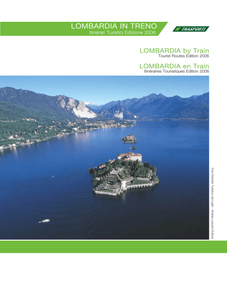 LOMBARDIA IN TRENO Itinerari Turistici Edizione 2006 LOMBARDIA by Train Tourist Routes Edition 2006 LOMBARDIA en Train Itinéraires Touristiques Edition 2006 Foto Distretto Turistico dei Laghi - Andrea Lazzarini Editore LOMBARDIA IN TRENO Ferrovie Nord Milano Trasporti S.r.l. è lieta di presentare LOMBARDIA IN TRENO Il NUOVO CATALOGO TURISTICO propone diversi itinerari da effettuarsi in treno sulle linee F.N.M.T. del ramo Milano e del ramo Brescia-Iseo-Edolo, in abbinamento anche ad altri mezzi di trasporto Per tutte le informazioni di carattere generale sul servizio di trasporto, orari, tariffe, trasporto comitive, trasporto disabili, itinerari turistici, rivolgersi a: CUSTOMER CARE / ACCOGLIENZA CLIENTI Presso la stazione di Milano Cadorna Orario di apertura: lunedì-venerdì dalle 7.00 alle 20.00 sabato, domenica e festivi dalle 8.00 alle 20.00 e-mail: [email protected] oppure telefonare al CALL CENTER FERROVIE NORD 199.151.152* Attivo tutti i giorni 24 ore su 24 *numero a tariffazione specifica: costo di € 0,0836 al minuto + IVA Ferrovie Nord Milano Trasporti S.r.l. is glad to present “LOMBARDIA BY TRAIN” Ferrovie Nord Milano Trasporti S.r.l. vous présent “LOMBARDIA EN TRAIN” The NEW TOURIST CATALOGUE offers a wide range of itineraries by train along the Milano railway network and the Brescia-Iseo-Edolo Network, coupling other means of transport. Le NOUVEAU CATALOGUE TOURISTIQUE vous propose différents itinéraires en train sur le lignes FNMT des réseaux de Milan et Brescia-Iseo-Edolo, associés avec d’autres sociétés de transport. For general information about transport service, timetables, fares, groups transport, disabled people transport, tourist itineraries, contact Pour toute information générales concernant le service de transport, les horaires, le transport des groupes et des handicapés, les itinéraires touristiques, contactez CUSTOMER CARE FNMT Inside Milano Cadorna station CUSTOMER CARE FNMT A l’intérieur de la gare de Milano Cadorna Opening hours: Monday-Friday from 7.00 a.m to 8.00 p.m. Saturday, Sunday and holidays from 8.00 a.m. to 8.00 p.m. e-mail: [email protected] Horaire d'ouverture: Lundi-Vendredi 7.00-20.00 Samedi, Dimanche et jours fériés 8.00-20.00 e-mail: [email protected] CALL CENTER FERROVIE NORD 199.151.152* CALL CENTER FERROVIE NORD 199.151.152* Daily 24 hours a day Tous les jours 24h sur 24h * Special rate number: € 0,0836 per minute+ Vat * Numéro de téléphone à tarif spécial: € 0,0836/minute + TVA PRIMA DI PARTIRE… (guida alla lettura del catalogo) Il catalogo, è diviso in due sezioni: Sezione 1: itinerari e percorsi turistici per l’intera giornata Sezione 2: itinerari e percorsi turistici per 2 o più giorni Per ciascun itinerario vi proponiamo: - gli orari dei treni e degli eventuali mezzi di trasporto in abbinamento - una breve descrizione del sito turistico da visitare - informazioni utili sulla meta scelta Nel Tariffario (pag. 60) sono indicati tutti i prezzi del trasporto e di visita ai siti turistici presentati. FATE ATTENZIONE ALLE PROMOZIONI E ALLE TARIFFE SPECIALI RIVOLTE AI SOLI CLIENTI F.N.M.T. CHE UTILIZZANO IL TRENO PER RAGGIUNGERE LE METE PROPOSTE! GLI ORARI DEI TRENI, DEGLI ALTRI MEZZI DI TRASPORTO IN ABBINAMENTO E LE TARIFFE SONO INDICATIVI E POTREBBERO SUBIRE VARIAZIONI DURANTE IL PERIODO DI VALIDITA’ DEL CATALOGO. SI CONSIGLIA QUINDI PRIMA DI PARTIRE DI VERIFICARE GLI ORARI DEL TRENO SUL LIBRETTO ORARIO AZIENDALE O IL SITO INTERNET (www.ferrovienord.it). PER QUANTO RIGUARDA GLI ALTRI MEZZI DI TRASPORTO LA VERIFICA DELL’ORARIO E DEI PREZZI PUO’ ESSERE EFFETTUATA DIRETTAMENTE IN LOCO. LE COMITIVE DEVONO PRESENTARSI SUL TRENO ALMENO 10 MINUTI PRIMA DELLA PARTENZA, PENA LA DECADENZA DELL’EVENTUALE RISEVAZIONE DEI POSTI. BEFORE LEAVING… (catalogue reading guide) AVANT DE PARTIR… (introduction à la lecture du catalogue) This catalogue is divided in two parts: Le catalogue est composé de deux parties: Part 1: tourist routes for one day Part 2: tourist routes for 2 or more days Partie 1: itinéraires touristiques pour une journée Partie 2: itinéraires touristiques pour 2 ou plusieurs journées For every itinerary you can find: - train and coupled means of transport timetables - a short description about the site to visit - general information about the selected site Pour chaque itinéraire vous pouvez trouver: - les horaires des trains et des autres moyens de transport associés - une brève description du site touristique - informations utiles sur la destination choisie In the Price List (page n. 60) you can find all transport fares and admission fees to tourist sites. La liste des tarifs (page n. 60) indique les prix du transport et les tarifs d’entrée aux sites touristiques. TAKE CARE TO PROMOTIONS OR SPECIAL FARES FOR F.N.M.T. CLIENTS ONLY THAT CATCH OUR TRAINS TO THE SUGGESTED DESTINATIONS! FAITES ATTENTION AUX PROMOTIONS ET AUX TARIFS SPECIAUX RESERVE AUX CLIENTS F.N.M.T. QUI UTILISENT LE TRAIN POUR JOINDRE LES DESTINATIONS CONSEILLEES TRAIN AND COUPLED MEANS OF TRANSPORT TIMETABLES AND FARES ARE JUST AS AN INDICATION AND THEY COULD BE MODIFIED DURING THE PERIOD OF VALIDITY OF THIS CATALOGUE. BEFORE LEAVING PLEASE VERIFY TRAIN TIMETABLES CONSULTING THE F.N.M.T. TIMETABLES BOOK OR THE INTERNET SITE (www.ferrovienord.it); THE OTHERS COUPLED MEANS OF TRANSPORT TIMETABLES AND FARES CAN BE VERIFIED DIRECTLY ON SITE. GROUP MUST BE ON BOARD AT LEAST 10 MIN. BEFORE THE DEPARTURE TO MANTAIN THE SEATS RESERVATION. LES HORAIRES DES TRAINS, DES AUTRES MOYENS DE TRANSPORT ET LES TARIFS SONT INDICATIFS ET ILS PEUVENT ÊTRE MODIFIES AUCOUR DE LA PERIODE DE VALIDITE DU CATALOGUE. AVANT DE PARTIR NOUS VOUS CONSEILLONS DE VERIFIER LES HORAIRES DES TRAINS SUR LE LIVRET DES HORAIRES FNMT OU SUR LE SITE INTERNET (www.ferrovienord.it); POUR LES AUTRES MOYENS DE TRANSPORT, VOUS POUVEZ VERIFIER LES HORAIRES ET LES TARIFS DIRECTEMENT SUR PLACE. LES GROUPES DOIVENT SE PRESENTER AU BORD DU TRAIN 10 MINUTES