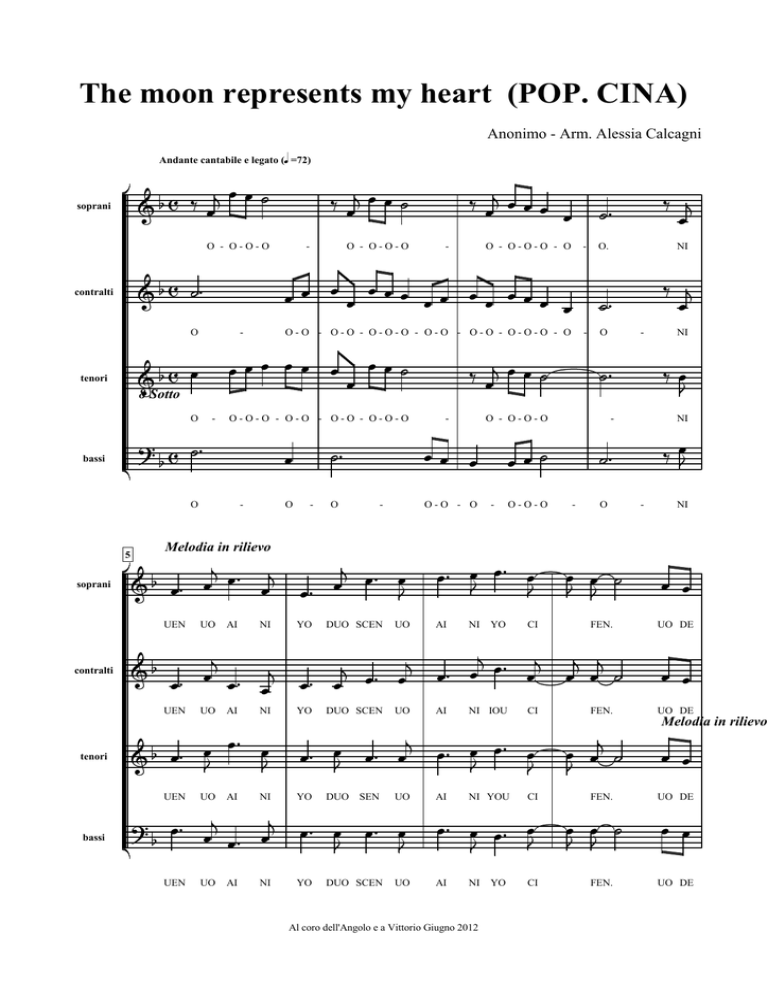 The moon represents my heart (POP. CINA) Anonimo - Arm. Alessia Calcagni G Andante cantabile e legato ( =72) kkj o f s D k a soprani o ks k k j O - O-O-O a f D jz contralti - 8 Sotto jz f D b bassi - soprani contralti O. NI - O - O - UO AI NI YO DUO SCEN UO AI NI kz k k f z k a t t UO AI NI YO DUO SCEN UO - - NI kkj jz - O-O-O kz k kz k t t UO AI NI AI YO DUO SEN UO YO DUO SCEN UO AI NI YO CI NI IOU CI NI YOU CI kz k kz k t t AI NI O - O-O-O - AI O ok t k z kt k z ks k z tk k z k t k z ks k z ks k z k k z k f b t t UEN o s k jz O-O - O UO - - O k k j t t FEN. a f k z ks k z ks k z ks k z ks k z ks k z ks ks ks j UEN bassi - o ks k k j kk k s k z ks s kz k f k k z k z a k t UEN tenori jz k Melodia in rilievo UEN O - O-O-O - O O-O - O-O - O-O-O - O-O - O-O - O-O-O - O O-O-O - O-O - O-O - O-O-O O 5 - kkk kk kk kkj afD k O O - O-O-O k k k k k k k k k k k k k k k jz O tenori - o s k o ks k k k k jz NI Al coro dell'Angolo e a Vittorio Giugno 2012 YO CI FEN. k ks j t FEN. k k j t t FEN. ok t - NI k k UO DE k k UO DE Melodia in rilievo k k UO DE k k UO DE 2 9 soprani s k ks k f z k k a t GIN contralti IE GIEN UO IE GIEN UO IE GIEN UO 12 a f ks ks ks ks k z SIN, BIAO UO DE SIN. contralti DE AI LIAN IE GIEN IE' LIAN DE HAI IE GIEN IE' LIAN k z kt k ks ks DE AI IE GIEN IUE' LIAN k ek DAI k k BIAO UO ks ks e k DA - I fk k BIAO kz DAI DE UO DE ks k k BIAO UO DE i DAI z k k k z s s k z z k k k s k kz k t t ks k z k t Melodia in rilievo NI WEN UO AI NI IOU DUO SCEN UO AI NI YOU CI s a f k k k k k k k k k z ks k z ks k z ks k z ks k z k k z ks a f jz SIN. bassi YE k z ks k ks ks SIN, BIAO UO DE SIN, DE SIN. NI tenori IE GIEN k z ks k ks ks b f k z kt k kt kt GIN soprani AI s a f k z ks k k ks GIN bassi DE a f k z ks k ks ks GIN tenori IE GIEN UO k z k k k ks t t b f jz SIN. WEN UO AI NI IOU DUO SCEN UO AI NI YOU CI NI UEN UO AI NI YOU DUO SCEN UO AI NI YOU CI NI UEN UO AI NI YOU DUO SCEN UO AI NI YOU CI o ks k z k k z k k z k k z ks k z k k z k t t t t t o kt k z ks k z ks k z k k z k k z k k z k t t t t 3 k k j f a t t 16 soprani FEN. contralti UO a f ks ks j UO s a f kt k j UO a f ek DAI contralti tenori a f kz DAI bassi UO k b f kz DAI GIN II UO DE BU II UO DE k z ks k k k DE GIN BIAO BU II UO DE kz k k k k t DE GIN BU II, UO DE k k k k k n fk DE SIN, UO DE SIN. GIN kz k k k k t AI BU BIAN IUE' LIAN k z ks k k kk AI BU BIAN IUE' LIAN k z ks k k k AI BU BIAN IE' LIAN k z kt k k k AI BU BIAN YE' LIAN af i GIN Melodia in rilievo a f k k ek DA - I DE k k FEN. soprani BU k z ks k k k k k k k j bf t t 19 GIN Melodia in rilievo FEN. bassi DE k k FUN. tenori k z ks k k k k k k f k z ks k k k k k a k k fk k BIAO UOR DE SIN, UO DE CIN. GIN GIN ks k k k BIAO UO ks k z BIAO UO DE - E jz - SIN, DE - E YI GE DE - E YI GE - E Attenzione al cambio di chiave k k k k z k k t k bf GIN GIN ks k k k k k k b f k z tk k k k DE SIN, UO DE SIN. GIN GIN DE - I YI GE - E 4 k z ks k k k j f a 22 soprani GE UEN contralti tenori bassi a f jz bf II CIIN DA. k k k z ks k k k k kz k k k t UEN II CIIN DA DON UO DE SIN, GE UEN II CIIN DA k k z s af k k k bassi DUAN GIN, GI - AO DON UO DE kz k t UO a f jz k k GIN, jz GIA - O k k UO GIN. GIA - O UO bf SCEN SIN, GIN tenori k DON UO DE kz k k k k kz k k k bf t t kz k k k k bf t GIN. DUAN GIN. GI - AO SE jz DE SIN. SCE - EN k k k NIAN DA - O NIAN DAO SRU kz k e k k k t SE kz k t UO SE NIAN SCEEN DI DA - O k k k NIAN DAO SRU YI DUAN SCE - EN -II DUAN k z kt k k k SCEN k k SIN, DI k z ks k k kz k k k k t k z ks k k k SE SCEN jz DA jz kz k k k t DE SIN. II CIIN 26 contralti UO UEN UEN soprani kz k j t j DI II DU - AN kz k k k k t SCEN DI YI DU - AN y k k k ks t ks Melodia in riliev rall........ kz SRU y k DA - O SRU CIN. rall........ jz k z f k k k yk t CIN CIN. rall........ jz y k CIN CIN. SRU DA - O SRU rall........ CIN NI 5 29 soprani Tempo primo a f kz UEN ks k z UO AI kz NI YOU Tempo primo contralti WUM C k o bf t WUM kz af 31 AI contralti Ck t WUM WUM Ck t WUM Ck Ck t o t Ck t WUM kC t WUM WUM WUM kC t WUM WUM WUM WUM WUM WUM kC o kC t t k kz t NI YOU bassi kC t Ck o t WUM Ck t WUM WUM C o tk WUM kC t WUM WUM WUM WUM WUM k kk k t tt CI Ck Ck t o t WUM Ck t WUM WUM kC o Ck t t WUM kC t WUM WUM WUM WUM FEN. WUM WUM WUM Ck t kC t o ks k k k n j O - O - O - O- o ks k k k n o o a f Cks Cks Cks o kCs kCs kCs kCs kCs Cks jC WUM WUM WUM WUM WUM WUM tenori UO Ck bf o t WUM WUM Tempo primo soprani SCEN o ks ks ks o ks ks ks C C C C C C WUM bassi DUO k t a f o kCs kCs kCs o kCs kCs kCs Tempo primo tenori ks k z ks WUM. Ck Ck Ck kC kC kC k k k k k z k o o o n f t t t t t t b O - O - O - O- Melodia in rilievo k k kt k t t II SIAN WUM WUM WUM WUM WUM WUM WUM WUM WUM. NI GIU SIAN WUM WUM WUM WUM WUM WUM WUM WUM WUM NI GIU NI GIU Ck Ck Ck o kC kC kC o k k k n k k o kC kC s o kC kC s o k k C C bf t t t t t t t t t t NI GIU SIAN NI GIU SIAN 6 k k j o f s k a 34 soprani tenuto - O - O - O - O - tenuto contralti a f o ks k k j - tenori O - O - O - O kz f b II 37 a f kz SIAN contralti GIU CAN k k II SIAN NI o s s s kC kC kC k k k o f b t af jz O. II SIAN. j k k k DAI BIAO UO DE - E UO DE - E k k SIAN. NI GIU kz k k k k k t - SIN, DE SI - IN. NI GIU - SIN, DE SI - IN. NI GIU k k k BIAO NI GIU jz II - I - I - e jA CAN GIU - k k kz ks k ks ks CAN YI CAN IU - E' kz k k k k k t k z ks k k k LIANG DAI BIAO UO DE- o s s s o o sk ks ks ks ks ks e j kC kC kC C C C C C C A k k k k o b f kt k k k NI GIU SIAN n O - O - O - O bassi GIU ks k NI GIU SIAN, tenori IUE' LIAN NI j kz k k k k t b f o kCs kCs Cks o kCs kCs kCs NI soprani CAN, j O k k t t k k t CAN bassi - Melodia in rilievo O - O - O - O - NI GIU CAN k k j k o t NI GIU CAN, tenuto O - O - O - O - j BIAO UO DE- j ok k k j t - UO DE- O - O - O - O - O. UO tenuto n LIANG k k k j k k k DE - E 7 y y yi k k k k k k k k fk k f k a LEGATISSIMO coda 40 soprani rall........ Rall..... yy y k k k k k k k jk k i a f k kRall..... - SIN. O - O - O - O - O - O - O - O - O - O - O- - yi coda contralti - k k k k k k k k k fyj SIN O - O - O - O - O - O - O - O - O - O coda tenori