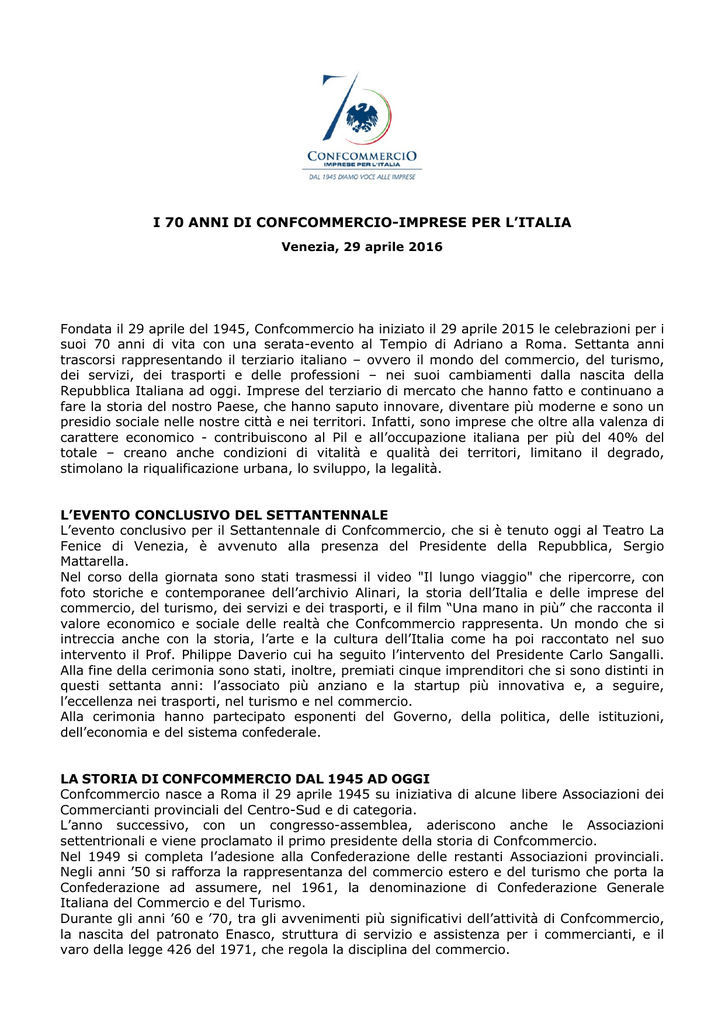 I 70 ANNI DI CONFCOMMERCIO-IMPRESE PER L’ITALIA Venezia, 29 aprile 2016 Fondata il 29 aprile del 1945, Confcommercio ha iniziato il 29 aprile 2015 le celebrazioni per i suoi 70 anni di vita con una serata-evento al Tempio di Adriano a Roma. Settanta anni trascorsi rappresentando il terziario italiano – ovvero il mondo del commercio, del turismo, dei servizi, dei trasporti e delle professioni – nei suoi cambiamenti dalla nascita della Repubblica Italiana ad oggi. Imprese del terziario di mercato che hanno fatto e continuano a fare la storia del nostro Paese, che hanno saputo innovare, diventare più moderne e sono un presidio sociale nelle nostre città e nei territori. Infatti, sono imprese che oltre alla valenza di carattere economico - contribuiscono al Pil e all’occupazione italiana per più del 40% del totale – creano anche condizioni di vitalità e qualità dei territori, limitano il degrado, stimolano la riqualificazione urbana, lo sviluppo, la legalità. L’EVENTO CONCLUSIVO DEL SETTANTENNALE L’evento conclusivo per il Settantennale di Confcommercio, che si è tenuto oggi al Teatro La Fenice di Venezia, è avvenuto alla presenza del Presidente della Repubblica, Sergio Mattarella. Nel corso della giornata sono stati trasmessi il video "Il lungo viaggio" che ripercorre, con foto storiche e contemporanee dell’archivio Alinari, la storia dell’Italia e delle imprese del commercio, del turismo, dei servizi e dei trasporti, e il film “Una mano in più” che racconta il valore economico e sociale delle realtà che Confcommercio rappresenta. Un mondo che si intreccia anche con la storia, l’arte e la cultura dell’Italia come ha poi raccontato nel suo intervento il Prof. Philippe Daverio cui ha seguito l’intervento del Presidente Carlo Sangalli. Alla fine della cerimonia sono stati, inoltre, premiati cinque imprenditori che si sono distinti in questi settanta anni: l’associato più anziano e la startup più innovativa e, a seguire, l’eccellenza nei trasporti, nel turismo e nel commercio. Alla cerimonia hanno partecipato esponenti del Governo, della politica, delle istituzioni, dell’economia e del sistema confederale. LA STORIA DI CONFCOMMERCIO DAL 1945 AD OGGI Confcommercio nasce a Roma il 29 aprile 1945 su iniziativa di alcune libere Associazioni dei Commercianti provinciali del Centro-Sud e di categoria. L’anno successivo, con un congresso-assemblea, aderiscono anche le Associazioni settentrionali e viene proclamato il primo presidente della storia di Confcommercio. Nel 1949 si completa l’adesione alla Confederazione delle restanti Associazioni provinciali. Negli anni ’50 si rafforza la rappresentanza del commercio estero e del turismo che porta la Confederazione ad assumere, nel 1961, la denominazione di Confederazione Generale Italiana del Commercio e del Turismo. Durante gli anni ’60 e ’70, tra gli avvenimenti più significativi dell’attività di Confcommercio, la nascita del patronato Enasco, struttura di servizio e assistenza per i commercianti, e il varo della legge 426 del 1971, che regola la disciplina del commercio. In quegli anni cresce il rilievo della politica europea e, nel 1981, viene costituito l’ufficio di rappresentanza a Bruxelles. Da segnalare, in quel periodo, il varo della BIT (Borsa Internazionale del Turismo), oggi la più importante manifestazione fieristica del settore, nata su iniziativa di Confcommercio e che, nel 1981, vede la sua prima edizione. L’attività della Confederazione negli anni successivi, sempre orientata allo sviluppo del suo ambito di rappresentanza, porta al riconoscimento della rilevanza del terziario nell’ambito dell’economia nazionale. Coerentemente con questo processo, sul finire degli anni ’80, la Confederazione assume la nuova denominazione di Confederazione Generale Italiana del Commercio, del Turismo e dei Servizi. È in questi anni che si fa più forte l’impegno di Confcommercio, proseguito e intensificato anche nel decennio successivo, su temi di particolare rilevanza per le imprese rappresentate e per l’economia nazionale, come le tasse, il Mezzogiorno, la criminalità, il passaggio all’euro, la riforma del mercato del lavoro. Temi affrontati, spesso, con lo svolgimento di importanti iniziative nazionali promosse dalla Confederazione. Nel 1993 Confcommercio è tra i soci fondatori di Eurocommerce, l’Associazione europea del commercio internazionale al dettaglio e all’ingrosso. Nel 1995, con una serie di eventi e iniziative su scala nazionale, si celebra il 50° anniversario della Confederazione e pochi anni più tardi, nel 1998, il Parlamento vara il D.Lgs. 114 – la cosiddetta “riforma Bersani” – che avvia il processo di riforma del settore del commercio. Nel 1999 si svolge la prima edizione del Forum di Cernobbio, che diventerà uno dei maggiori appuntamenti annuali di Confcommercio sui temi economici e sociali. Nel 2000, su iniziativa della Confederazione, nasce Confturismo, struttura di coordinamento per il comparto del turismo, con l’obiettivo di rafforzare la rappresentanza unitaria delle imprese del settore e di far emergere il ruolo strategico del comparto nella crescita economica del nostro Paese. Successivamente Conftrasporto, struttura di coordinamento del trasporto, spedizione e logistica, aderisce a Confcommercio. Nel 2005 Confcommercio istituisce Fondo Est, il più grande fondo sanitario in Italia, che garantisce l’assistenza integrativa ad oltre 1.200.000 lavoratori del terziario e del turismo. Negli anni più recenti, il continuo rafforzamento del ruolo sindacale della Confederazione segue di pari passo la sempre più marcata terziarizzazione dell’economia italiana. E cresce anche l’esigenza di valorizzare la rappresentanza unitaria del mondo delle Pmi e dell’impresa diffusa che, nel 2006, insieme a Casartigiani, CNA, Confartigianato e Confesercenti, porta alla nascita del “Patto del Capranica”, coordinamento tra le cinque principali Co