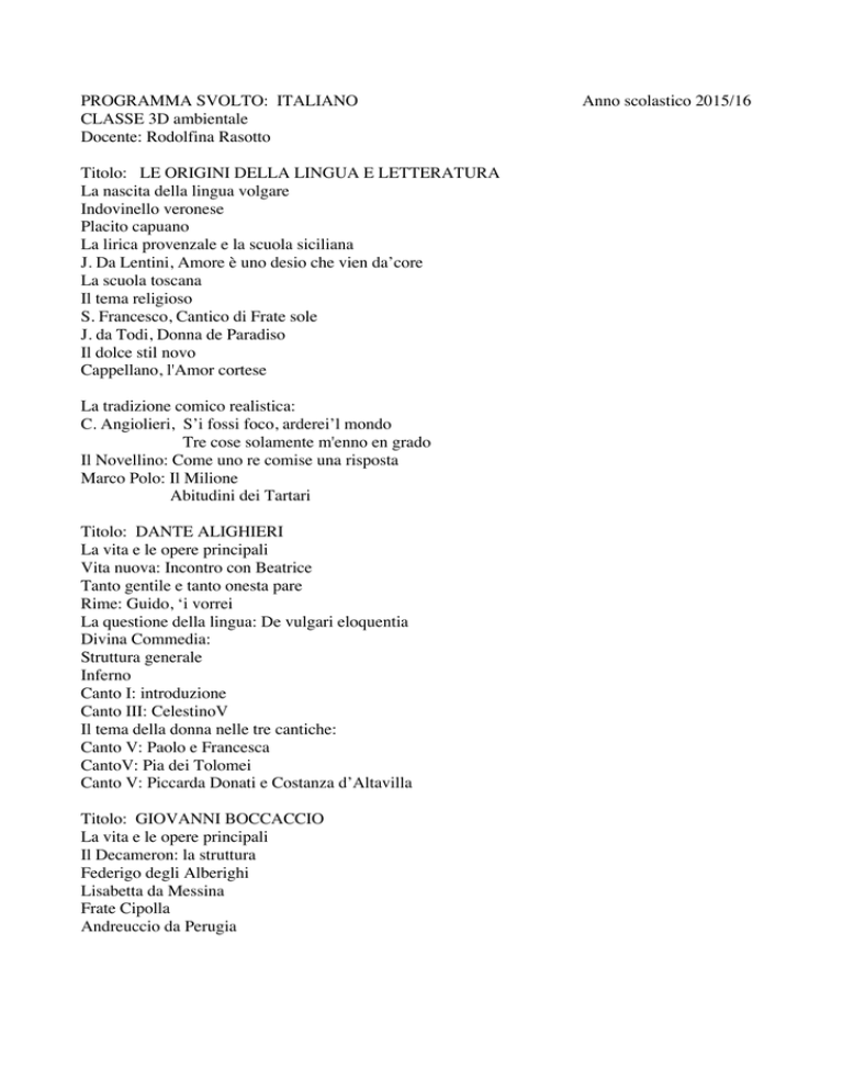PROGRAMMA SVOLTO: ITALIANO CLASSE 3D ambientale Docente: Rodolfina Rasotto Titolo: LE ORIGINI DELLA LINGUA E LETTERATURA La nascita della lingua volgare Indovinello veronese Placito capuano La lirica provenzale e la scuola siciliana J. Da Lentini, Amore è uno desio che vien da’core La scuola toscana Il tema religioso S. Francesco, Cantico di Frate sole J. da Todi, Donna de Paradiso Il dolce stil novo Cappellano, l'Amor cortese La tradizione comico realistica: C. Angiolieri, S’i fossi foco, arderei’l mondo Tre cose solamente m'enno en grado Il Novellino: Come uno re comise una risposta Marco Polo: Il Milione Abitudini dei Tartari Titolo: DANTE ALIGHIERI La vita e le opere principali Vita nuova: Incontro con Beatrice Tanto gentile e tanto onesta pare Rime: Guido, ‘i vorrei La questione della lingua: De vulgari eloquentia Divina Commedia: Struttura generale Inferno Canto I: introduzione Canto III: CelestinoV Il tema della donna nelle tre cantiche: Canto V: Paolo e Francesca CantoV: Pia dei Tolomei Canto V: Piccarda Donati e Costanza d’Altavilla Titolo: GIOVANNI BOCCACCIO La vita e le opere principali Il Decameron: la struttura Federigo degli Alberighi Lisabetta da Messina Frate Cipolla Andreuccio da Perugia Anno scolastico 2015/16 Titolo: FRANCESCO PETRARCA La vita e le opere L’ascesa al monte ventoso Il Canzoniere Movesi vecchirel canuto e bianco Voi ch'ascoltate in rime sparse il suono Solo e pensoso i più deserti campi Zefiro torna e’l bel tempo rimena Erano i capei d'oro a l'aura sparsi Chiare, fresche e dolci acque Titolo: LA CULTURA UMANISTICA Il pertarchismo Gaspara Stampa, Voi ch’ascoltate Classicismo A. Poliziano, I' mi svegliai fanciulle Lorenzo de Medici, Canzone di Bacco P. Bembo, Il cortigiano Anticlassicismo: Burchiello, Aretino, Folengo, Ruzzante (cenni) Rabelais, L’infanzia di Gargantua Titolo: LA TRATTATISTICA Machiavelli: la vita e le opere Lettera a Francesco Vettori La mandragola (cenni) I Principati Il Principe: le virtù del principe Le milizie mercenarie Guicciardini, I Ricordi 6, 110, 189, 30 15, 16, 17, 117, 118, 161, 125 Titolo: LUDOVICO ARIOSTO I poemi epico cavallereschi: le radici storiche La vita e le opere minori (cenni) L’Orlando furioso: Proemio La pazzia di Orlando Astolfo sulla Luna Titolo: TORQUATO TASSO La vita e le opere minori (cenni) La Gerusalemme liberata: Proemio Il combattimento di Clorinda e Tancredi Le opere minori (cenni) Espressione scritta: Analisi guidata di articoli di giornale L’Europa sotto attacco Analisi del testo Calvino: Il sentiero dei nidi di ragno Petrarca: O cameretta, che già fosti un porto Saggio breve: la struttura L’amicizia, con percorso di lavoro guidato Il possesso della Terra; La scienza: il ruolo dello scienziato La non violenza; La biodiversità Tema storico: La concezione della Terra in epoca medievale Tema: Commentare una notizia di cronaca; D. Grossman, Con gli occhi del nemico Tipologia B: storia e letteratura, domande a risposta breve RECUPERO: P. Levi, Titanio (analisi del testo) Vicenza, 30 maggio 2016 L’insegnante R. Rasotto COMPITI PER LE VACANZE ITALIANO E STORIA Letture obbligatorie: Bertolt Brecht, Vita di Galileo Lia Levi, Una bambina e basta Letture facoltative: Due libri a scelta Dal testo L’attualità della letteratura le seguenti letture Il giullare da pag. 1010 Il teatro Olimpico da pag.1028 Attori di mestiere da pag. 1030 Fascicolo di approfondimento consegnato a scuola Dal testo in adozione di storia: Il Seicento pag. 308-309 con esercizi I negrieri pag. 302-303 Il capitalismo pag. 262-264 con esercizi Approfondimenti obbligatori per chi ha il giudizio sospeso: Testi consigliati: AA.VV., La costituzione per capire il presente, Ed. Palumbo Laboratorio delle competenze (fascicolo in adozione col testo di letteratura): Esercitazione guidata pp. 136,137,138 Dal testo L’attualità della letteratura: Machiavelli es. pag. 778, da 1 a 9; pag. 810, da 1 a 7; Competenze: pp. 864,865, svolgimento guidato del saggio breve Guicciardini es. pag. 879 n. 1,2,3,8 ESAME DI RECUPERO DEL DEBITO La prova di fine agosto sarà scritta e comprenderà: - Analisi del testo - Saggio breve o tema in base al tempo stabilito per le classi del triennio
