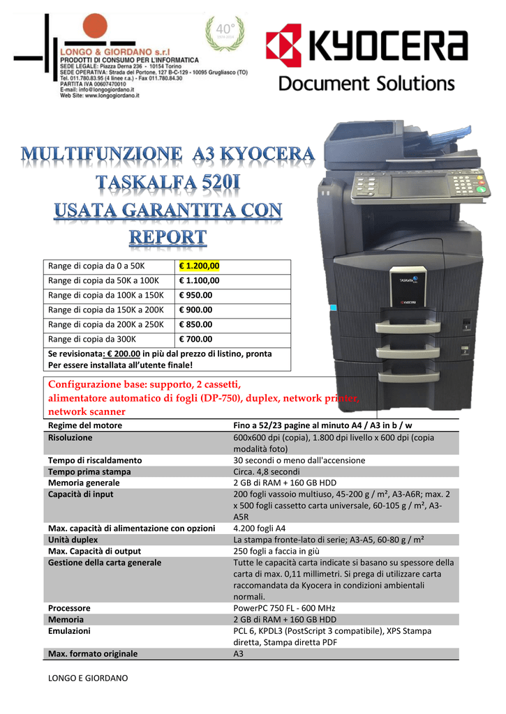 Range di copia da 0 a 50K € 1.200,00 Range di copia da 50K a 100K € 1.100,00 Range di copia da 100K a 150K € 950.00 Range di copia da 150K a 200K € 900.00 Range di copia da 200K a 250K € 850.00 Range di copia da 300K € 700.00 Se revisionata: € 200.00 in più dal prezzo di listino, pronta Per essere installata all’utente finale! Configurazione base: supporto, 2 cassetti, alimentatore automatico di fogli (DP-750), duplex, network printer, network scanner Regime del motore Risoluzione Tempo di riscaldamento Tempo prima stampa Memoria generale Capacità di input Max. capacità di alimentazione con opzioni Unità duplex Max. Capacità di output Gestione della carta generale Processore Memoria Emulazioni Max. formato originale LONGO E GIORDANO Fino a 52/23 pagine al minuto A4 / A3 in b / w 600x600 dpi (copia), 1.800 dpi livello x 600 dpi (copia modalità foto) 30 secondi o meno dall'accensione Circa. 4,8 secondi 2 GB di RAM + 160 GB HDD 200 fogli vassoio multiuso, 45-200 g / m², A3-A6R; max. 2 x 500 fogli cassetto carta universale, 60-105 g / m², A3A5R 4.200 fogli A4 La stampa fronte-lato di serie; A3-A5, 60-80 g / m² 250 fogli a faccia in giù Tutte le capacità carta indicate si basano su spessore della carta di max. 0,11 millimetri. Si prega di utilizzare carta raccomandata da Kyocera in condizioni ambientali normali. PowerPC 750 FL - 600 MHz 2 GB di RAM + 160 GB HDD PCL 6, KPDL3 (PostScript 3 compatibile), XPS Stampa diretta, Stampa diretta PDF A3