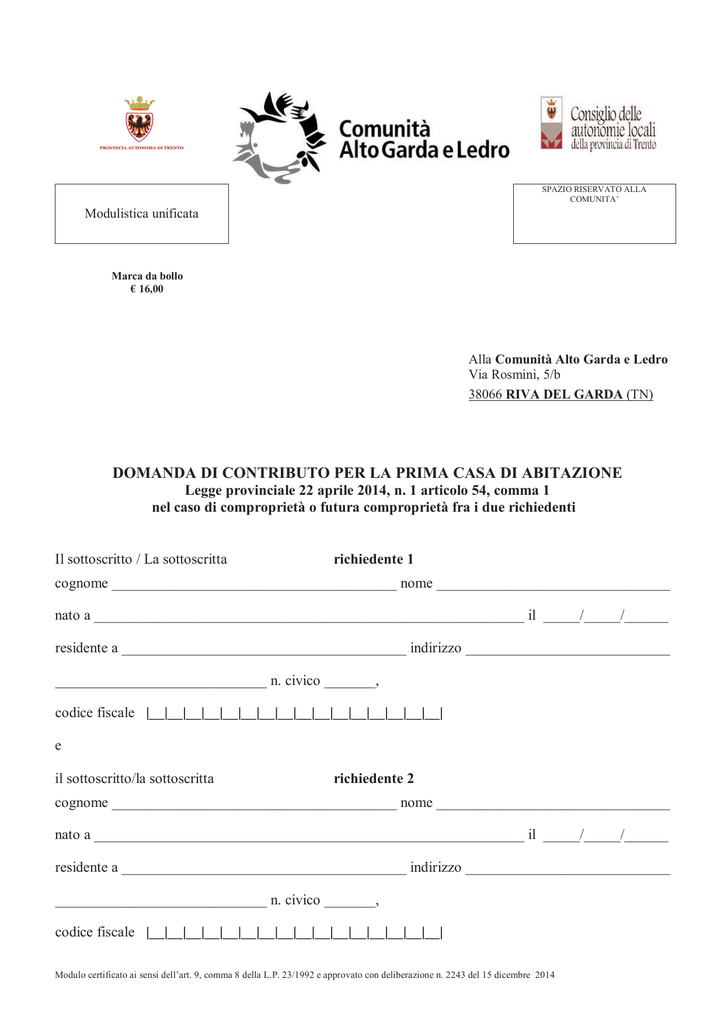 SPAZIO RISERVATO ALLA COMUNITA’ Modulistica unificata Marca da bollo € 16,00 Alla Comunità Alto Garda e Ledro Via Rosmini, 5/b 38066 RIVA DEL GARDA (TN) DOMANDA DI CONTRIBUTO PER LA PRIMA CASA DI ABITAZIONE Legge provinciale 22 aprile 2014, n. 1 articolo 54, comma 1 nel caso di comproprietà o futura comproprietà fra i due richiedenti Il sottoscritto / La sottoscritta richiedente 1 cognome _______________________________________ nome ________________________________ nato a ___________________________________________________________ il _____/_____/______ residente a _______________________________________ indirizzo ____________________________ _____________________________ n. civico _______, codice fiscale |__|__|__|__|__|__|__|__|__|__|__|__|__|__|__|__| e il sottoscritto/la sottoscritta richiedente 2 cognome _______________________________________ nome ________________________________ nato a ___________________________________________________________ il _____/_____/______ residente a _______________________________________ indirizzo ____________________________ _____________________________ n. civico _______, codice fiscale |__|__|__|__|__|__|__|__|__|__|__|__|__|__|__|__| Modulo certificato ai sensi dell’art. 9, comma 8 della L.P. 23/1992 e approvato con deliberazione n. 2243 del 15 dicembre 2014 CHIEDONO il contributo previsto dalla legge provinciale indicata in oggetto per l’intervento del costo complessivo presunto di euro __________________ per: acquisto acquisto e risanamento risanamento della prima casa di abitazione, ubicata/sita nel comune di __________________________________ p.ed. _______, p.m. ___________, nel comune catastale di __________________________ (se già in proprietà o individuata) A tal fine, DICHIARANO cancellare con una riga la parte che non interessa: che l’alloggio oggetto di domanda sarà / è destinato a residenza del nucleo familiare; che l’alloggio oggetto di domanda sarà / è ubicato nell’ambito del centro storico; che il nucleo che andrà ad occupare / che occupa l’alloggio, sarà / è composto dal sottoscritto / dalla sottoscritta e dai seguenti componenti: Parentela Cognome e nome Luogo di nascita Data di nascita di voler contrarre matrimonio. Chiedono che ogni comunicazione sia inviata a: - __________________________________________________________________________________ (cognome e nome) __________________________________________________________________________________ (via, piazza, ecc… n. civico, c.a.p e comune) - telefono n. _____________________________________________ fax ____________________________________ casella di posta elettronica (e-mail) ______________________________________ casella di posta elettronica certificata (PEC): __________________________________________________________________________________ Modulo certificato ai sensi dell’art. 9, comma 8 della L.P. 23/1992 e approvato con deliberazione n. 2243 del 15 dicembre 2014 ALLEGANO dichiarazione sostitutiva di certificazione e dell’atto di notorietà a firma di _______________________; (cognome e nome) dichiarazione sostitutiva di certificazione e dell’atto di notorietà a firma di _______________________; (cognome e nome) attestazione dell’indicatore della condizione economico patrimoniale del proprio / futuro nucleo familiare; piantina quotata in scala 1:50 dell’alloggio, se già individuato; preventivo sommario del costo complessivo dell’intervento a firma del richiedente e di un tecnico abilitato (solo nel caso di interventi di risanamento o acquisto e risanamento); documentazione fotografica attestante lo stato dell’alloggio prima dell’esecuzione inizio lavori, nel caso non sia già stato individuato la predetta documentazione andrà presentata in fase di ammissione ad istruttoria (solo nel caso di interventi di risanamento o acquisto e risanamento); contratto preliminare di compravendita o contratto di compravendita, qualora già stipulato, (in copia conforme all’originale ai sensi dell'art. 18 del d.P.R. n. 445/00 oppure, nei soli casi in cui il contratto sia già depositato presso un ufficio pubblico, in copia semplice accompagnata da dichiarazione sostitutiva dell’interessato che ne attesta la conformità all’originale e con indicazione dell’ufficio pubblico presso il quale l'originale è depositato ai sensi dell'art. 19 del d.P.R. n. 445/00). Informativa ai sensi del decreto legislativo n. 196/2003, articolo 13: - i dati forniti verranno trattati esclusivamente con riferimento al procedimento per il quale è stata presentata la documentazione; - il trattamento sarà effettuato con supporto cartaceo e/o informatico; - il conferimento dei dati è obbligatorio per dar corso alla procedura; - titolare del trattamento è la Comunità Alto Garda e Ledro; - responsabile del trattamento è l’architetto Gianfranco Zolin; - in ogni momento potranno essere esercitati nei confronti del titolare del trattamento i diritti di cui all'art. 7 del D.Lgs.n. 196/2003. _____________________________ Luogo e data ________________________________ Firma ________________________________ Firma Ai sensi dell’articolo 38 del d.P.R. 445 del 28 dicembre 2000, la presente dichiarazione è stata: sottoscritta, previa identificazione del/i richiedente/i, ____________________________________________; (indicare in stampatello il nome del dipendente) in presenza del dipendente addetto sottoscritta e presentata unitamente a copia fotostatica non autenticata di un documento di identità del/i sottoscrittore/i Modulo certificato ai sensi dell’art. 9, comma 8 della L.P. 23/1992 e approvato con deliberazione n. 2243 del 15 dicembre 2014 DICHIARAZIONE SOSTITUTIVA DI CERTIFICAZIONE E DELL’ATTO DI NOTORIETA’ Il sottoscritto / La sottoscritta cognome _____________________________________ nome _________________________________ nato a ___________________________________________________________ il ____/____/_______ residente a _______________________ indirizzo ___