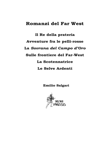 Romanzi del Far West Il Re della prateria Avventure fra le pelli-rosse La Sovrana del Campo d’Oro Sulle frontiere del Far-West La Scotennatrice Le Selve Ardenti Emilio Salgari Romanzi del Far-West Emilio Salgari Tutto Salgari: Volume 10 An omnibus compilation of seven titles: Il Re della prateria First published in Italian in 1896 Il figlio del Cacciatore d’orsi First published in Italian in 1899 Avventure fra le pellirosse First published in Italian in 1900 La Sovrana del Campo d’Oro First published in Italian in 1905 Sulle frontiere del Far-West First published in Italian in 1908 La Scotennatrice First published in Italian in 1909 Le Selve Ardenti First published in Italian in 1910 All Rights Reserved. Published internationally by ROH Press. No part of this book may be reproduced or transmitted in any form or by any means, graphic, electronic, or mechanical, including photocopying, recording, taping, or by any information storage retrieval system, without the written permission of the publisher. http://www.rohpress.com/ Cover: A Dash for the Timber, Frederic Remington, 1889 Modificazioni dei testi originali: l’ortografia dei nomi di città, animali, personaggi, e parole straniere sono stati corretti e aggiornati. Un ringraziamento al salgarologo Vittorio Sarti per i suoi consigli ed il suo supporto. Curato da Nico Lorenzutti Proprietà letteraria e artistica riservata © 2016 by ROH Press I titoli della collana Tutto Salgari Cinque avventure in ogni titolo! Per la prima volta tutti i romanzi e tutti i racconti salgariani in versione electronica. I grandi romanzi che vi hanno emozionato e fatto sognare. Da Sandokan al Corsaro Nero: duelli, battaglie, misteri e avventure di jungla e di mare. Storie Rosse Racconti Eroi ed eroine (il ‘starter pack’ salgariano) Romanzi russi Romanzi storici Romanzi di lotta Romanzi di mare Romanzi d’Africa Romanzi tra i ghiacci Romanzi del Far-West Romanzi di sopravvivenza Romanzi d’India e d’Oriente Romanzi di corsari e marinai Romanzi di viaggi straordinari Romanzi d’Africa e del deserto Romanzi di tesori e città perdute Tutte le avventure di Sandokan Tutte le avventure del Corsaro Nero Il figlio del Cacciatore d’orsi Capitolo 1 Una traccia misteriosa IN UNA DI quelle vaste praterie che si trovano un po’ all’ovest della specie d’angolo formato dalla riunione dei tre Stati dell’America del Nord: il Dakota, il Nebraska ed il Wyoming, due uomini cavalcavano di gran galoppo come se avessero fretta di giungere a qualche appuntamento od a qualche accampamento. A prima vista si riconoscevano per europei, quantunque indossassero dei costumi assai strani che non si vedono in alcuna regione del nostro vecchissimo continente. Quanta differenza fra quei due tipi!... L’uno era altissimo di statura, spaventosamente magro, una specie di Don Chisciotte; l’altro invece era rotondo come una botte, e si poteva rassomigliarlo al servitore dell’errante cavaliere spagnuolo, a Sancio Panza. Nondimeno, malgrado tanta differenza di statura, le loro teste si tenevano allo stesso livello, perché l’uomo piccolo e rotondo montava un cavallone ossuto e dalle gambe smisurate e che non doveva di certo appartenere alle vigorosa razza andalusa che popola le praterie americane; il più magro invece montava un piccolo mulo, tanto basso anzi che le lunghe gambe del cavaliere quasi quasi toccavano il suolo. Avendo due cavalcature così differenti, si comprenderà facilmente come in sella quei due uomini fossero egualmente alti. Abbiamo detto in sella, ma dobbiamo dire che abbiamo errato, poiché nessuno di quei due uomini sembrava che ci tenesse ad un così comodo arnese. Il piccolo si era infatti accontentato d’una vecchia pelle di montone, l’altro d’una coperta tutta strappi, che non avrebbe potuto servire nemmeno da tenda. A prima vista quei due singolari individui si potevano scambiare per due vecchi cacciatori di prateria provenienti da un lunghissimo viaggio, ed infatti lo stato miserando delle loro vesti lo indicava chiaramente. Il più magro portava dei pantaloni che non erano stati certamente tagliati sulla sua misura, troppo larghi ma contemporaneamente troppo corti per quelle gambe così lunghe, giungendogli a malapena al ginocchio; lo spesso strato di grasso che copriva sopratutto le parti anteriori, dimostrava l’abitudine che aveva il suo proprietario di far servire quei poveri panni da salvietta. Le gambe del cavaliere poi, sparivano entro un paio di stivaloni antidiluviani, che giammai avevano conosciuta alcuna specie di lucido, assumendo così una tinta assolutamente impossibile a precisare. Una camicia di cotone grossolano, d’un colore cremastro, priva di bottoni, copriva il magro petto del cavaliere, lasciando a nudo le braccia secche ma nervose, non essendovi traccia di maniche. Una cravatta di lana che gl’imprigionava il collo, una cravatta che un giorno poteva essere stata bianca o nera, gialla o rossa, verde od azzurra, ma che ora non si poteva più conoscere con precisione ed un cappellaccio a larghe tese completavano il costume del nostro eroe. Sarebbe però necessario dirvi che quel cappello era in uno stato non certo migliore delle vesti, sdrucito, unto e scolorito al pari della cravatta. Forse un giorno aveva coperta la testa di qualche nobile lord o di qualche ricco yankee degli Stati dell’Unione, ma il primo proprietario non avrebbe di certo potuto più riconoscerlo sul capo del cacciatore di prateria. Quale età, poi aveva quell’uomo? Sarebbe stato impossibile a precisarlo. Il suo viso magro, angoloso, conservava qualche traccia di freschezza: l’espressione però dei suoi occhi azzurri, la barba un po’ brizzolata, i suoi capelli che cominciavano ad incanutire, dicevano che il magro cavaliere doveva aver varcata la trentina da più lustri. Il suo compagno invece pareva assai più giovane. Era un uomo dalla fisonomia franca e simpatica, scrupolosamente rasato, dagli occhi piccoli, bruni e vivaci, dalle lab