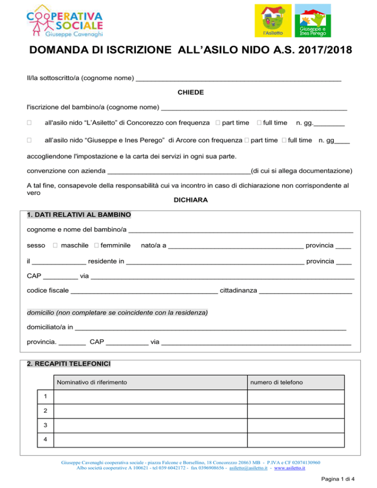 DOMANDA DI ISCRIZIONE ALL’ASILO NIDO A.S. 2017/2018 Il/la sottoscritto/a (cognome nome) _____________________________________________________ CHIEDE l'iscrizione del bambino/a (cognome nome) ________________________________________________ all'asilo nido “L’Asiletto” di Concorezzo con frequenza part time all’asilo nido “Giuseppe e Ines Perego” di Arcore con frequenza full time part time n. gg.________ full time n. gg____ accogliendone l'impostazione e la carta dei servizi in ogni sua parte. convenzione con azienda _____________________________________(di cui si allega documentazione) A tal fine, consapevole della responsabilità cui va incontro in caso di dichiarazione non corrispondente al vero DICHIARA 1. DATI RELATIVI AL BAMBINO cognome e nome del bambino/a __________________________________________________________ sesso maschile femminile nato/a a ___________________________________ provincia ____ il ______________ residente in ______________________________________________ provincia ____ CAP _________ via ____________________________________________________________________ codice fiscale ______________________________________ cittadinanza ________________________ domicilio (non completare se coincidente con la residenza) domiciliato/a in ______________________________________________________________________ provincia. _______ CAP ___________ via _________________________________________________ 2. RECAPITI TELEFONICI Nominativo di riferimento numero di telefono 1 2 3 4 Giuseppe Cavenaghi cooperativa sociale - piazza Falcone e Borsellino, 18 Concorezzo 20863 MB - P.IVA e CF 02074130960 Albo società cooperative A 100621 - tel 039 6042172 - fax 0396908656 - [email protected] - www.asiletto.it Pagina 1 di 4 segue domanda di iscrizione all’asilo nido 3. NUCLEO FAMILIARE parentela nome e cognome data di nascita città di nascita codice fiscale 4. DATI RELATIVI ALLA MADRE cognome e nome ____________________________________________________________________ nata a _______________________________________________________ il ___________________ residente in ___________________________________________________ provincia. ____________ CAP _______ via ____________________________________________________________________ codice fiscale ______________________________________ cittadinanza ______________________ professione ________________________________ tel. lavoro ________________________________ cellulare_______________________ e-mail _______________________________________________ 5. DATI RELATIVI AL PADRE cognome e nome _____________________________________________________________________ nata a _______________________________________________________ il ___________________ residente in ____________________________________________________ provincia. ____________ CAP _______ via ____________________________________________________________________ codice fiscale ______________________________________ cittadinanza ______________________ professione ________________________________ tel. lavoro ________________________________ cellulare_______________________ e-mail _______________________________________________ Giuseppe Cavenaghi cooperativa sociale - piazza Falcone e Borsellino, 18 Concorezzo 20863 MB - P.IVA e CF 02074130960 Albo società cooperative A 100621 - tel 039 6042172 - fax 0396908656 - [email protected] - www.asiletto.it Pagina 2 di 4 segue domanda di iscrizione all’asilo nido 6. INFORMAZIONI SANITARIE E ALIMENTARI gruppo sanguigno del bambino _________________________________________________________ Dati del pediatra cognome e nome ____________________________________________________________________ studio in ___________________________________________________________________________ via _________________________________________________ prov. _______ CAP ___________ tel. studio _______________________________ cellulare _________________ _________________ Vaccinazioni eseguite Vaccinazione Data Vaccinazione 1 DTP (Antidifterico-tetanica-pertosse) 6 Pneumo-meningococco 2 Ep.B (Antiepatite B) 7 Varicella 3 Hib (Antiemofilo B) 8 4 IPV (Antipoliomelitico iniettabile) 9 5 MPR (Antimorbillo-parotite-rosolia) Data 10 Intolleranze alimentari Alimento Note Ulteriori informazioni sanitarie ____________________________________________________________________________________ ____________________________________________________________________________________ ____________________________________________________________________________________ Giuseppe Cavenaghi cooperativa sociale - piazza Falcone e Borsellino, 18 Concorezzo 20863 MB - P.IVA e CF 02074130960 Albo società cooperative A 100621 - tel 039 6042172 - fax 0396908656 - [email protected] - www.asiletto.it Pagina 3 di 4 segue domanda di iscrizione all’asilo nido 7. PERSONE AUTORIZZATE AD ACCOMPAGNARE/RITIRARE IL BAMBINO Entrambi i genitori autorizzano, salvo revoca, le seguenti persone ad accompagnare e ritirare il bambino presso l'asilo nido: nome e cognome data nascita n. carta identità rilasciata dal comune di Il personale educativo non è autorizzato a consegnare il bambino a persone che non siano state espressamente delegate dai genitori. 8. ORARI DI FREQUENZA I genitori per la frequenza del proprio figlio/a all’asilo nido dichiarano di scegliere il seguente orario: entrata ___________________ uscita ____________________ 9. FOTOGRAFIE E RIPRESE VIDEO L’utilizzo dell’immagine del proprio figlio/a per la realizzazione di: • servizi fotografici e video per uso interno è autorizzato non è autorizzato • servizi fotografici e video realizzati per il nostro sito è autorizzato non è autorizzato • servizi fotografici e video per social è autorizzato non è autorizzato _______________________________ _______________________________ firma del padre firma della madre IL/LA SOTTOSCRITTO/A PADRE/MADRE (i cui dati anagrafici compaiono nell’apposita sezione del presente modulo) DICHIARA • che è consapevole della