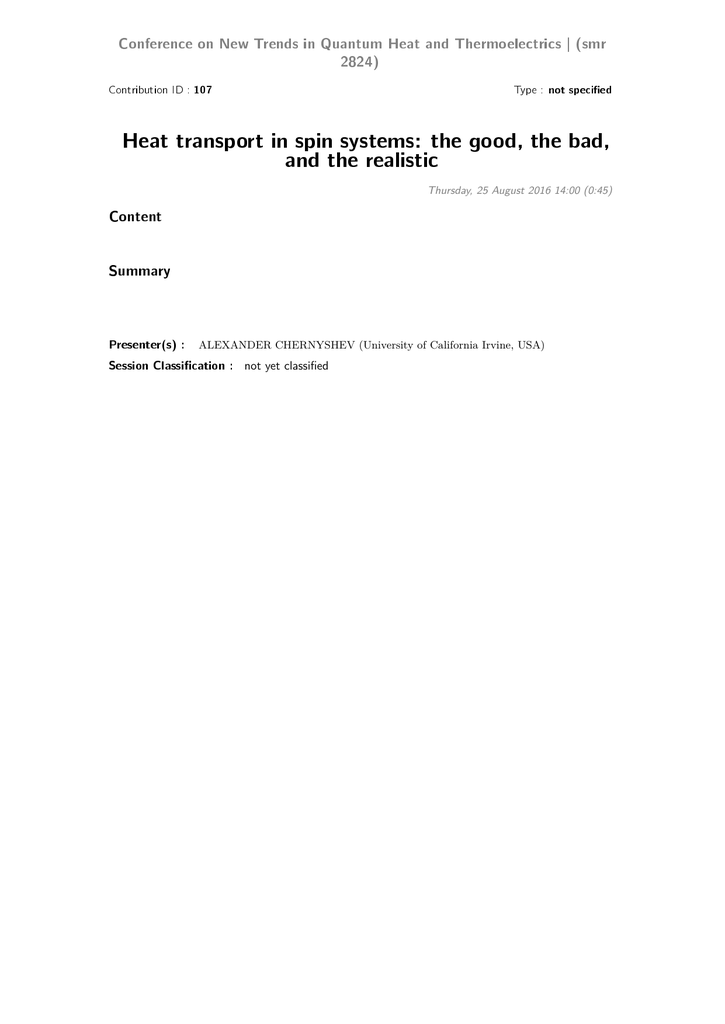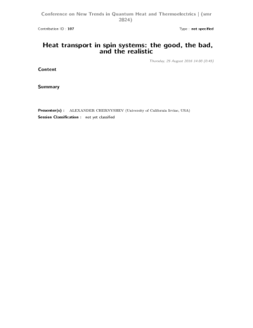 Conference on New Trends in Quantum Heat and Thermoelectrics | (smr 2824) Contribution ID : 107 Type : not specied Heat transport in spin systems: the good, the bad, and the realistic Thursday, 25 August 2016 14:00 (0:45) Content Summary Presenter(s) : ALEXANDER CHERNYSHEV (University of California Irvine, USA) Session Classication : not yet classified