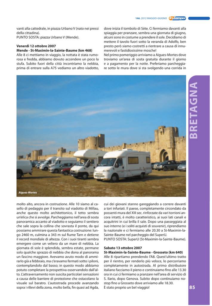 146. 2012 MAGGIO-GIUGNO vanti alla cattedrale, in piazza Urbano V (nato nei pressi della cittadina). PUNTO SOSTA: piazza Urbano V (Mende). BRETAGNA Venerdì 12 ottobre 2007 Mende - St-Maximin-la-Sainte-Baume (km 468) Alle 8 ci mettiamo in viaggio, la nottata è stata rumorosa e fredda, abbiamo dovuto accendere un poco la stufa. Subito fuori della città incontriamo la nebbia, prima di entrare sulla A75 vediamo un altro viadotto, dove inizia il tombolo di Sète. Ci fermiamo davanti alla spiaggia per pranzare, sembra una giornata di giugno, alcuni sono in costume a prendere il sole. Decidiamo di mettere il tavolo fuori sotto la veranda di Adolfo, ben presto però siamo costretti a rientrare a causa di innumerevoli e fastidiosissime mosche! Nel primo pomeriggio arriviamo a Aigues-Mortes dove troviamo un’area di sosta gratuita durante il giorno e a pagamento per la notte. Preferiamo parcheggiare sotto le mura dove si sta svolgendo una corrida in Aigues-Mortes molto alto, ancora in costruzione. Alle 10 siamo al casello di pedaggio per il transito sul viadotto di Millau, anche questo molto architettonico, il tetto sembra un’elica che si avvolge. Parcheggiamo nell’area di sosta panoramica accanto al viadotto e seguiamo il sentiero che sale sopra la collina che sovrasta il ponte, da qui possiamo ammirare questa fantastica costruzione: lungo 2460 m, culmina a 343 m sul fiume Tarn e detiene il record mondiale di altezza. Con i suoi tiranti sembra emergere come un veliero da un mare di nebbia. La giornata di sole è splendida, sembra estate, permane solo qualche sprazzo di nebbia che dona al panorama un fascino maggiore. Avevamo avuto modo di ammirarlo già a febbraio, ma c’eravamo fermati sotto i piloni, contemplandolo dal basso; in questo modo abbiamo potuto completare la prospettiva osservandolo dall’alto. L’attraversamento non suscita particolari sensazioni a causa delle barriere di protezione che ostacolano la visuale sul baratro. L’autostrada procede avanzando sopra i rilievi della zona, molto bella, fin quasi ad Agda, cui dei giovani stanno gareggiando a correre davanti a tori infuriati. Il paese, completamente circondato da possenti mura del XIII sec. rinforzate da vari torrioni ancora intatti, è molto caratteristico, ai suoi lati canali e acquitrini in cui brilla il sale. Dopo una passeggiata al suo interno (e i soliti acquisti di souvenir), riprendiamo la nazionale e ci fermiamo alle 20.30 a St-Maximin-laSainte-Baume nel parcheggio del SuperU. PUNTO SOSTA: SuperU (St-Maximin-la-Sainte-Baume). Sabato 13 ottobre 2007 St-Maximin-la-Sainte-Baume - Grosseto (km 640) Alle 8 ripartiamo prendendo l’A8. Quest’ultimo tratto per il rientro, per renderlo più veloce, lo percorriamo completamente in autostrada. Al primo distributore italiano facciamo il pieno e continuiamo fino alle 13.30 ora in cui ci fermiamo a pranzare nell’area di servizio di S. Ilario, dopo Genova. Subito dopo continuiamo nostop fino a Grosseto dove arriviamo alle 18.30. È stato proprio un bel viaggio! 85 85 85
