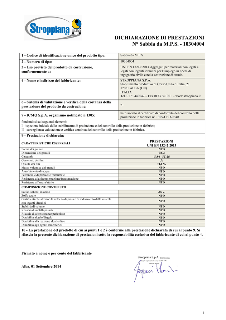 DICHIARAZIONE DI PRESTAZIONI N° Sabbia da M.P.S. - 10304004 1 - Codice di identificazione unico del prodotto tipo: Sabbia da M.P.S. 2 - Numero di tipo: 3 - Uso previsto del prodotto da costruzione, conformemente a: 10304004 4 - Nome e indirizzo del fabbricante: STROPPIANA S.P.A. Stabilimento produttivo di Corso Unità d’Italia, 21 12051 ALBA (CN) ITALIA Tel. 0173 440042 – Fax 0173 361001 – www.stroppiana.it UNI EN 13242:2013 Aggregati per materiali non legati e legati con leganti idraulici per l’impiego in opere di ingegneria civile e nella costruzione di strade. 6 - Sistema di valutazione e verifica della costanza della prestazione del prodotto da costruzione: 2+ 7 - ICMQ S.p.A. organismo notificato n 1305: ha rilasciato il certificato di conformità del controllo della produzione in fabbrica n° 1305-CPD-0640 fondandosi sui seguenti elementi: I - ispezione iniziale dello stabilimento di produzione e del controllo della produzione in fabbrica; II - sorveglianza valutazione e verifica continua del controllo della produzione in fabbrica. 9 - Prestazione dichiarata: CARATTERISTICHE ESSENZIALI Forma dei granuli Dimensione dei granuli Categoria Contenuto dei fini Qualità dei fini Massa volumica dei granuli Assorbimento di acqua Percentuale di particelle frantumate Resistenza alla frammentazione/frantumazione Resistenza all’usura/attrito PRESTAZIONI UNI EN 13242:2013 NPD 0/6,3 GF80 GTF25 f3 71,1 % NPD NPD NPD NPD NPD COMPOSIZIONE CONTENUTO Solfati solubili in acido Zolfo totale Costituenti che alterano la velocità di presa e di indurimento delle miscele con leganti idraulici Stabilità di volume Rilascio di metalli pesanti Rilascio di altre sostanze pericolose Durabilità al gelo/disgelo Durabilità alla reazione alcali-silice Durabilità agli agenti atmosferici AS 0.2 NPD NPD NPD NPD NPD NPD NPD NPD 10 - La prestazione del prodotto di cui ai punti 1 e 2 è conforme alla prestazione dichiarata di cui al punto 9. Si rilascia la presente dichiarazione di prestazioni sotto la responsabilità esclusiva del fabbricante di cui al punto 4. Firmato a nome e per conto del fabbricante Stroppiana S.p.A. Unipersonale Legale rappresentante e responsabile FPC Maurizio Begani Alba, 01 Settembre 2014 1