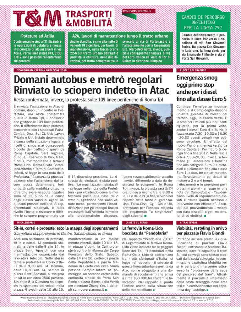 CAMBIO DI PERCORSO DEFINITIVO PER LA LINEA 792 Potature ad Acilia Continueranno sino al 31 dicembre le operazioni di potatura e messa in sicurezza di alcuni alberi in via Acilia. Per le linee di bus 013, 013D e 017 sono possibili rallentamenti sui percorsi. A24, lavori di manutenzione lungo il tratto urbano Anche stanotte, e sino alla notte di venerdi 16 dicembre, per lavori di manutenzione, nella fascia oraria 22-6 sul tratto urbano dell’A24 è prevista la chiusura, nelle due direzioni, del tratto compreso tra lo svincolo di via di Portonaccio e l’allacciamento con la Tangenziale Est. Mercoledì notte, invece, pulizia e conseguente chiusura di via del Foro Italico da viale di Tor di Quinto in direzione Olimpico. SCONGIURATA L’ULTIMA AGITAZIONE 2016 Cambia definitivamente il percorso la linea 792 verso il capolinea di via San Giovanni Eudes. Da piazza San Giovanni in Laterano, la linea devia per via Emanuele Filiberto e via di Porta San Giovanni. BLOCCO DEL TRAFFICO Domani autobus e metrò regolari Rinviato lo sciopero indetto in Atac Resta confermata, invece, la protesta sulle 109 linee periferiche di Roma Tpl Emergenza smog oggi primo stop anche per i diesel fino alla classe Euro 5 È rinviata l’agitazione in Atac di domani, dopo un incontro in Prefettura, ma resta confermata quella in Roma Tpl, il consorzio che gestisce le 109 linee periferiche. Il differimento della protesta, concordato con i sindacati FaisaConfail, Orsa, Sul-Ct, Usb-Lavoro Privato e Utl, è stato determinato a causa della situazione legata ai livelli di smog e ai conseguenti blocchi del traffico disposti da Roma Capitale. Sarà regolare, dunque, il servizio di bus, tram, filobus, metropolitane e ferrovie Roma-Lido, Roma-Civita Castellana-Viterbo e Termini-Centocelle. Infatti, si legge in una nota della Prefettura, “è emersa la preoccupazione che l'astensione dal lavoro possa determinare forti criticità sulla mobilita cittadina oltre che avere ricadute negative sulla salute pubblica, a causa degli elevati valori di agenti inquinanti presenti nell’aria, Ai rappresentanti sindacali, è stato rivolto l'invito a revocare o differire lo sciopero programmato per Continua l’emergenza inquinamento e il Campidoglio dispone un’altra giornata di blocco del traffico, oggi, in Fascia Verde. E lo stop per i veicoli più inquinanti riguarda, per la prima volta, anche i diesel Euro 4 e 5. Nelle fasce orarie 7,30 -10,30 e 16,30 - 20,30 questi veicoli non possono circolare. Un’effetto del nuovo Piano anti-smog varato da Roma Capitale. Per l’Euro 6 deroga fino a fine 2017. Nella fascia oraria 7,30-20,30, invece, si fermano gli autoveicoli a benzina fino alla categoria Euro 2 e motocicli e ciclomotori fino alla classe Euro 1. a due, tre e quattro ruote, indifferentemente se dotati di motore a 2 o a 4 tempi. I rilevamenti e le previsioni per i prossimi giorni - si legge in una nota del Campidoglio - “evidenziano livelli di inquinamento elevati e risulta quindi necessario intervenire con efficacia”. Esentati dal provvedimento i veicoli con pass disabili, a gpl, metano, ibridi ed elettrici il 14 dicembre prossimo. La risposta dei sindacati è stata positiva. “Le organizzazioni sindacali - si legge nella nota della Prefettura - pur ribadendo come le motivazioni poste alla base dello stato di agitazione non siano venute meno, permanendo l'insoddisfazione per gli impegni fino ad ora assunti dall'Azienda in merito alle problematiche discusse, IN CALENDARIO hanno responsabilmente accolto l'invito, differendo a data da destinarsi lo sciopero”. In Roma Tpl, invece, la protesta sarà di 24 ore. Linee a rischio tra le 8,30 e le 17 e dalle 20 a fine servizio nel rispetto delle fasce di garanzia. Usb, Faisa-Cisal, Cgil, Cisl e Uil, protestano per l’annosa vicenda del pagamento “a singhiozzo” degli stipendi LA RETE SU FERRO A TRASTEVERE Sit-in, cortei e proteste: ecco la mappa degi appuntamenti La ferrovia Roma-Lido bocciata da “Pendolaria” Stamattina doppio evento in Centro. Sabato sfilano in 5mila Viabilità, restyling in arrivo per piazzale Flavio Biondi Sarà una settimana di proteste, sit-in e cortei. Si comincia stamattina dalle dalle 9 alle 14, in piazza Santi Apostoli con una manifestazione organizzata dai lavoratori Telecom. Sullo stesso tema si protesterà in Corso d’Italia dalle 9,30 alle 14. Domani, dalle 10,30 alle 14, sempre in piazza Santi Apostoli, si svolgerà un sit-in con circa 2500 persone. Sin dalle 8 la Questura ha disposto lo sgombero dei veicoli nella piazza. Giovedì, dalle 10 alla 15, Potrebbe arrivare presto la riqualificazione di piazzale Flavio Biondi, antistante la stazione Trastevere, dove fa capolinea il tram 3, i cui convogli sono spesso bloccati dalla sosta selvaggia. In commissione capitolina Mobilità ieri si è parlato d’intervenire attraverso la “protezione della sede del percorso del tram”. Attualmente il piazzale è interessato dalla sosta selvaggia nelle aree taxi e in corrispondenza del capolinea degli autobus manifestazione in via Molise mentre venerdì, dalle 10 alle 13, in piazza Vidoni, la Cgil protesterà contro la riforma del Corpo Forestale dello Stato. Sabato, dalle 14 alle 20, corteo da piazza della Repubblica a piazza Madonna di Loreto con circa 5mila persone. Sempre sabato, nel pomeriggio, un secondo corteo della comunità cinese da Porta San Paolo a piazza Bocca della Verità per ricordare Zhang Yao. I dettagli su muoversiaroma.it Nel rapporto “Pendolaria 2016” di Legambiente la ferrovia RomaLido viene indicata tra le peggiori linee del Tpl. “I pendolari della Roma-Ostia Lido si confermano tra i più sfortunati d'Italia- si legge nel rapporto - il servizio di questa linea suburbana gestita da Atac non è adeguato a una domanda di spostamenti che arriva a circa 100.000 tra studenti e lavoratori”. Nel rapporto si punta l’indice anche sulla situazione delle metropolitane www.muoversiaroma.it - Trasporti&Mobilità a cura di Roma Servizi per la M