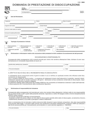 COD. SR05 DOMANDA DI PRESTAZIONE DI DISOCCUPAZIONE Sede INPS di Istituto Nazionale Previdenza Sociale Modello DOMANDA n. DS21 Dati del Richiedente Quadro A Nome Cognome Data di nascita M/F Codice fiscale Cognome del marito Comune o stato estero di nascita Prov. Comune di residenza/Domicilio Indirizzo Prov. C.A.P. Telefono Cittadinanza E-mail Tipologia di prestazione richiesta Quadro B Disoccupazione ordinaria Trattamento speciale edile Tavola Disoccupazione con requisiti ridotti Assegno per nucleo familiare Indennità di mobilità Indennità per rimpatriati Trattamento economico più favorevole Indennità per frontalieri Indennità convenzione U.E. (ex CEE) Altro (indicare) Dichiarazioni e informazioni relative alla concessione delle prestazioni ed alle condizioni di accertamento dei dati personali 1 DICHIARAZIONE DI RESPONSABILITA' Consapevole delle conseguenze civili e penali previste per coloro che rendono attestazioni false, dichiaro di aver reso dichiarazione di immediata disponibilità al lavoro al: CENTRO PER L'IMPIEGO DEL COMUNE DI Firma del richiedente In data Data IL DIRITTO E' SALVO SOLO SE IL RICHIEDENTE RISULTA DISOCCUPATO Il richiedente dovrà comunicare entro 5 giorni la data in cui si verifica un qualsiasi evento che influisce sulla Sua condizione di disoccupato. Con il modello DS56 bis dovrà inoltre - in presenza di trattamenti diversi dell'indennità di mobolità, requisiti ridotti, trattamenti speciali edili di durata superiore a 90 giorni - dichiarare la Sua condizione ininterrotta di disoccupato, dopo la scadenza del termine massimo pagabile. Si sottolinea l'obbligo della restituzione del modello DS56 bis che consentirà al richiedente di ottenere il saldo dell'indennità di disoccupazione ed il riconoscimento della contribuzione figurativa. Tavola Dichiarazione di responsabilità del richiedente 2 Consapevole delle conseguenze civili previste per coloro che rendono false attestazioni, dichiaro sotto la mia responsabilità che le notizie fornite in tutti i quadri della presente domanda, rispondono a verità. Mi impegno inoltre a fornire tempestivamente all'INPS notizie inerenti: - Eventuale impugnativa dell'atto di licenziamento; - Qualsiasi evento che possa influire sul mio stato di disoccupato (perdita dello stato di disoccupato, avviamento al lavoro, trasferimento all'estero) e sul diritto a percepire il relativo trattamento. Sono a conoscenza che la mancata o tardiva denuncia delle situazioni sopra indicate comporterà, oltre alle responsabilità civili previste dalla legge, il recupero delle somme che risulteranno percepite indebitamente. Autorizzo l'INPS ad utilizzare i dati forniti esclusivamente per il procedimento amministrativo in corso (decreto legislativo n. 196/2003). Firma del richiedente Data Modello DS21 Quadro C Codice fiscale Cognome Dati relativi al primo / ultimo rapporto di lavoro dipendente Fornire le informazioni richieste Data iniziale del rapporto di lavoro dipendente (X) (X) Riportare la data iniziale del primo rapporto di lavoro dipendente nell'arco della vita lavorativa Non compilare i seguenti dati se la domanda interessa la disoccupazione con requisiti ridotti Data INIZIALE dell'ultimo rapporto di lavoro Rivestivo la qualifica di: Cessato per: Data FINALE dell'ultimo rapporto di lavoro Operaio Impiegato Licenziamento Dimissioni Quadro Dirigente Apprendista Sospensione Rimpatrio in data Denominazione dell'ultimo datore di lavoro Comune Quadro D Indirizzo Prov. C.A.P. Dati relativi al periodo di contribuzione / assicurazione da attività lavorativa Fornire le informazioni richieste A Nel caso di domanda di disoccupazione con requisiti ridotti, devono essere dichiarati tutti i rapporti di lavoro intervenuti nell'anno solare precedente. B Nel caso di domanda che interessa qualsiasi altra indennità di cui al quadro B, considerare i due anni precedenti la data di interruzione del rapporto di lavoro Settore nel quale è stata svolta l'attività 1 Denominazione del datore di lavoro 2 Periodo di attività dal / al Motivo d'interruzione 3 1) Indicare se: Agricolo, non agricolo, domestico, frontaliero, marittimo, stagionale, all'estero, in progetto LSU/LPU, a domicilio, attività autonoma, socio di coperativa, collaborazioni coordinatecontinuative etc. 2) Indicare se: Azienda, Ente, Stato Estero presso cui è stata svolta l'attività. 3) Indicare se: per licenziamento, dimissioni, sospensione. N.B.: Se insegnante allegare eventuale certificato di servizio. Quadro E Dati relativi alla situazione soggettiva Considerare l'anno o gli anni secondo le indicazioni [ A ] e [ B ] del Quadro D Malattia SI NO Inizio periodo Fine periodo Maternità (obbligatoria, facoltativa) SI NO Inizio periodo Fine periodo Infortunio SI NO Inizio periodo Fine periodo Servizio militare di leva (o equiparato) SI NO Inizio periodo Fine periodo SI NO Inizio periodo Fine periodo Indennità di disoccupazione (precedentemente percepita) SI NO Inizio periodo Fine periodo Sospensione di attività lavorativa SI NO Inizio periodo Fine periodo Passaggio in ruolo (per insegnanti) SI NO Inizio periodo Fine periodo Attività autonoma / Collaborazione SI NO Inizio periodo Fine periodo SI NO Inizio periodo Fine periodo Integrazione salariale(CIG - CIGS) Altro Modello DS21 Quadro F Cognome Codice fiscale Dati relativi alla titolarità di pensione Fornire le informazioni richieste e barrare le caselle di specifico interesse Ha fatto richiesta ovvero beneficia di pensione Tipo pensione: Diretta SI NO Con decorrenza Indiretta Pensione INPS Rendita per infortunio Altro Ente o Stato Estero Invalidità civile Indicare Ente erogatore di pensione Quadro G Dati relativi all'assegno di incollocabilità Fornire le informazioni richieste e barrare le caselle di specifico interesse E' stata fatta richiesta PER Beneficia dell'assegno di incollocabilità Denominazione Ente o Stato Estero Quadro Mutilati o invalidi di guerra Mutilati o invalidi di servizio Con decorrenza Dichiarazione di opzione (PENSIONE