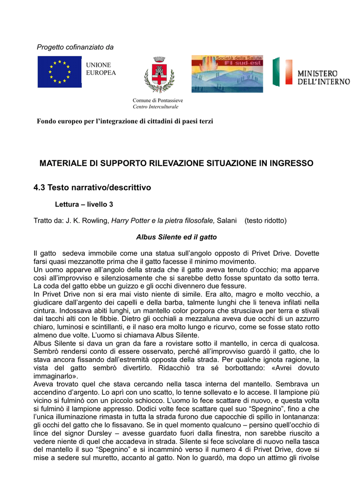 Progetto cofinanziato da UNIONE EUROPEA Comune di Pontassieve Centro Interculturale Fondo europeo per l’integrazione di cittadini di paesi terzi MATERIALE DI SUPPORTO RILEVAZIONE SITUAZIONE IN INGRESSO 4.3 Testo narrativo/descrittivo Lettura – livello 3 Tratto da: J. K. Rowling, Harry Potter e la pietra filosofale, Salani (testo ridotto) Albus Silente ed il gatto Il gatto sedeva immobile come una statua sull’angolo opposto di Privet Drive. Dovette farsi quasi mezzanotte prima che il gatto facesse il minimo movimento. Un uomo apparve all’angolo della strada che il gatto aveva tenuto d’occhio; ma apparve così all’improvviso e silenziosamente che si sarebbe detto fosse spuntato da sotto terra. La coda del gatto ebbe un guizzo e gli occhi divennero due fessure. In Privet Drive non si era mai visto niente di simile. Era alto, magro e molto vecchio, a giudicare dall’argento dei capelli e della barba, talmente lunghi che li teneva infilati nella cintura. Indossava abiti lunghi, un mantello color porpora che strusciava per terra e stivali dai tacchi alti con le fibbie. Dietro gli occhiali a mezzaluna aveva due occhi di un azzurro chiaro, luminosi e scintillanti, e il naso era molto lungo e ricurvo, come se fosse stato rotto almeno due volte. L’uomo si chiamava Albus Silente. Albus Silente si dava un gran da fare a rovistare sotto il mantello, in cerca di qualcosa. Sembrò rendersi conto di essere osservato, perché all’improvviso guardò il gatto, che lo stava ancora fissando dall’estremità opposta della strada. Per qualche ignota ragione, la vista del gatto sembrò divertirlo. Ridacchiò tra sé borbottando: «Avrei dovuto immaginarlo». Aveva trovato quel che stava cercando nella tasca interna del mantello. Sembrava un accendino d’argento. Lo aprì con uno scatto, lo tenne sollevato e lo accese. Il lampione più vicino si fulminò con un piccolo schiocco. L’uomo lo fece scattare di nuovo, e questa volta si fulminò il lampione appresso. Dodici volte fece scattare quel suo “Spegnino”, fino a che l’unica illuminazione rimasta in tutta la strada furono due capocchie di spillo in lontananza: gli occhi del gatto che lo fissavano. Se in quel momento qualcuno – persino quell’occhio di lince del signor Dursley – avesse guardato fuori dalla finestra, non sarebbe riuscito a vedere niente di quel che accadeva in strada. Silente si fece scivolare di nuovo nella tasca del mantello il suo “Spegnino” e si incamminò verso il numero 4 di Privet Drive, dove si mise a sedere sul muretto, accanto al gatto. Non lo guardò, ma dopo un attimo gli rivolse la parola. «Che combinazione! Anche lei qui, professoressa McGranitt?» Si voltò verso il soriano con un sorriso, ma quello era scomparso. Al suo posto, davanti a lui c’era una donna dall’aspetto piuttosto severo, che portava un paio di occhiali squadrati dalla forma identica ai segni che il gatto aveva intorno agli occhi. Albus Silente e il gatto Poate că domnul Dursley se cufundase într-un somn adânc dar motanul de pe gard nu dădea niciun semn de oboseală. Stătea nemişcat ca o statuie, cu ochii aţintiţi spre capătul cel mai îndepărtat al aleii. Nici măcar nu clipi când se auzi uşa unei maşini trântindu-se sau când, pe deasupra capului său, zburară două bufniţe. De-abia pe la miezul nopţii dădu semne de viaţă. La capătul aleii supravegheate de motan îşi făcu apariţia un bărbat. Apăruse atât de neaşteptat, de parcă ar fi ieşit din pământ. Coada motanului se mişcă, iar ochii i se îngustară. Nimeni nu mai văzuse un individ aşa ciudat prin acele locuri. Era înalt, subţire şi foarte bătrân, dacă era să te iei după albul părului şi al bărbii, care îi atârnau până la mijloc. Avea o robă lungă şi o pelerină purpurie, care mătura pământul, iar în picioare avea cizme cu catarame si tocuri înalte. Ochii, de un albastru luminos, îi sclipeau sub ochelari, iar nasul era lung şi părea să fi fost spart de cel puțin două ori. Numele omului era Albus Dumbledore. Albus Dumbledore nu părea să-şi fi dat seama deloc că ajunsese într-un loc unde persoana lui, de la nume la cizme, era nedorită. Scotoci prin buzunarele pelerinei, căutând ceva. Brusc, îşi dădu seama că era urmărit şi îşi îndreptă privirile spre motanul de la celălalt capăt al aleii. Dintr-un motiv anume, imaginea motanului păru să-l amuze, fiindcă începu să chicotească şi murmură: - Trebuia să-mi închipui! Găsi, în sfârşit, ce căuta. Părea să fie o brichetă argintie. O deschise, o ridică în aer şi o aprinse. Cel mai apropiat bec de pe stradă se stinse cu un mic zgomot. Mai aprinse o dată bricheta şi se stinse următorul bec, şi tot aşa, până când aleea se cufundă în beznă, singurele două luminiţe fiind ochii motanului care nu-şi dezlipea privirea de la noul venit. Dacă cineva, eventual doamna Dursley, cu privirea ei scrutătoare, s-ar fi uitat de după perdele, nu ar fi desluşit nimic din ce se petrecea atunci pe alee. Albus Dumbledore puse bricheta la loc, în buzunar, şi îşi continuă drumul până la casa de la numărul 4. Se opri la gard, lângă motan. Nu îl privi, dar îi vorbi: - Ciudat că vă văd aici, doamnă profesoară McGonagalI. Înălţă capul şi îi zâmbi motanului, dar acesta se făcuse nevăzut. În iocul lui stătea o femeie cu o înfăţişare severă şi cu nişte ochelari pătraţi, întocmai ca semnele din jurul ochilor motanului. Domande di comprensione del testo: 1. I personaggi del racconto sono… ț un uomo anziano e il signor Dursley ț un uomo anziano e una professoressa con le sembianze di gatto ț un uomo anziano e Harry Potter 2. L’uomo anziano indossa… ț un abito lungo e un mantello ț un pigiama con la cintura d’argento ț pantaloni lunghi e una giacca con fibbia 3. Il racconto si svolge… ț in una scuola ț accanto a un muretto, in un giardino ț in una strada di un quartiere residenziale 4. Il