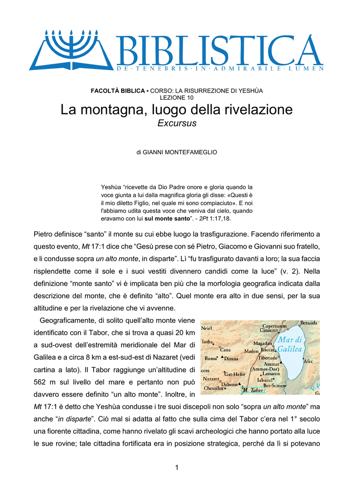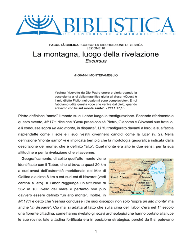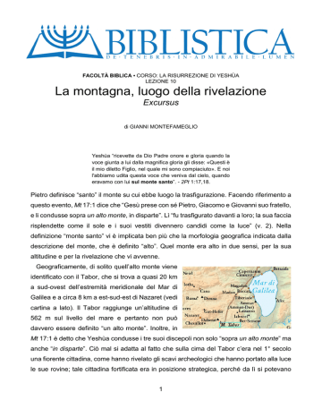 FACOLTÀ BIBLICA • CORSO: LA RISURREZIONE DI YESHÙA LEZIONE 10 La montagna, luogo della rivelazione Excursus di GIANNI MONTEFAMEGLIO Yeshùa “ricevette da Dio Padre onore e gloria quando la voce giunta a lui dalla magnifica gloria gli disse: «Questi è il mio diletto Figlio, nel quale mi sono compiaciuto». E noi l'abbiamo udita questa voce che veniva dal cielo, quando eravamo con lui sul monte santo”. - 2Pt 1:17,18. Pietro definisce “santo” il monte su cui ebbe luogo la trasfigurazione. Facendo riferimento a questo evento, Mt 17:1 dice che “Gesù prese con sé Pietro, Giacomo e Giovanni suo fratello, e li condusse sopra un alto monte, in disparte”. Lì “fu trasfigurato davanti a loro; la sua faccia risplendette come il sole e i suoi vestiti divennero candidi come la luce” (v. 2). Nella definizione “monte santo” vi è implicata ben più che la morfologia geografica indicata dalla descrizione del monte, che è definito “alto”. Quel monte era alto in due sensi, per la sua altitudine e per la rivelazione che vi avvenne. Geograficamente, di solito quell’alto monte viene identificato con il Tabor, che si trova a quasi 20 km a sud-ovest dell’estremità meridionale del Mar di Galilea e a circa 8 km a est-sud-est di Nazaret (vedi cartina a lato). Il Tabor raggiunge un’altitudine di 562 m sul livello del mare e pertanto non può davvero essere definito “un alto monte”. Inoltre, in Mt 17:1 è detto che Yeshùa condusse i tre suoi discepoli non solo “sopra un alto monte” ma anche “in disparte”. Ciò mal si adatta al fatto che sulla cima del Tabor c’era nel 1° secolo una fiorente cittadina, come hanno rivelato gli scavi archeologici che hanno portato alla luce le sue rovine; tale cittadina fortificata era in posizione strategica, perché da lì si potevano 1 osservare i movimenti nella valle di Izreel, sovrastata dal Tabor. Posto quindi ben poco adatto per stare “in disparte”. Pochi giorni prima della trasfigurazione, a Cesarea di Filippo Yeshùa aveva attestato di essere il cristo (messia, consacrato) di Dio (Mt 16:13-20); solo “sei giorni dopo, Gesù prese con sé Pietro, Giacomo e Giovanni suo fratello, e li condusse sopra un alto monte, in disparte” (Mt 17:1). Quell’“alto monte” era molto probabilmente l’Ermon, che raggiunge un’altezza di 2814 m sul livello del mare e che quindi si può definire davvero “un alto monte”. Cesarea di Filippo (in latino Caesarea Philippi) è oggi un sito archeologico siriano, chiamato Baniyas, situato sulle pendici del monte Ermon, e attualmente sotto controllo militare israeliano. Il monte Ermon oggigiorno L’“alto monte” su cui avvenne trasfigurazione non è semplicemente un punto geografico. Esso va considerato alla luce della Sacra Scrittura, nella quale le montagne sono luoghi sublimi in cui avvengono le grandi teofanie. I monti sono i luoghi della rivelazione di Dio. Fu su un monte, al Sinày, che Dio si rivelò a Israele stabilendo un patto di alleanza eterna. Dio “forma i monti” (Am 4:13) e “le altezze dei monti sono sue” (Sl 95:4), ma certi monti particolari sono chiamati “montagna di Dio” (Es 3:1) o “monte del Signore”. - Nm 10:33; Sl 24:3. L’esperienza che gli ebrei fecero al monte Sinày fu tremenda e lasciò il segno. “Ed ecco, al giorno fissato, sul far del mattino, sul monte ci furono tuoni, lampi, e una nube fitta. Si udì anche un fortissimo suono di tromba. Nell'accampamento il popolo tremava di paura. Allora Mosè li fece uscire dall'accampamento per avvicinarsi a Dio. Essi si fermarono ai piedi del monte. Il Sinai era tutto fumante, perché su di esso era sceso il Signore come un fuoco. Il fumo saliva come quello di una fornace, e tutto il monte era scosso come da un terremoto. Il suono della tromba divenne sempre più forte. Quando Mosè gli parlava, Dio rispondeva con il tuono. Il Signore scese dunque sulla cima del monte Sinai”. – Es 19:16-20, TILC. “Tutti gli Israeliti sentivano i tuoni e il suono del corno e vedevano i lampi e il monte fumante. Allora furono presi da paura e si tennero lontani”. – Es 20:18, TILC. 2 Gli ebrei ne furono così impressionati che nel linguaggio biblico ricorrono espressioni figurative che ne risentono, come in Is 64:1: “Oh, squarciassi tu i cieli, e scendessi! Davanti a te sarebbero scossi i monti”, o come in Sl 114:4-7: “I monti saltellarono come montoni, i colli come agnelli … E voi, monti, perché saltellaste come montoni, e voi, colli, come agnelli? Trema, o terra, alla presenza del Signore”. Nel simbolismo della Bibbia i monti possono raffigurare regni e governi che sono al potere (cfr. Dn 2:35,44,45; Is 41:15; Ap 17:9-11,18), ma Dio è più potente e Sl 76:4 inneggia: “Tremendo sei tu, o Potente, quando ritorni dalle montagne della preda”. Con tutta probabilità, quando il re Davide cantò in Sl 30:7: “O Signore, per la tua benevolenza avevi reso forte il mio monte”, si riferiva al consolidamento del suo regno narrato in 2Sam 5:12: “Davide riconobbe che il Signore lo stabiliva saldamente come re d'Israele e rendeva grande il suo regno per amore del suo popolo Israele”. Il Regno di Dio è paragonato ad una pietra che stritola tutti gli altri regni e poi diventa una grande montagna che riempie tutta la terra: “Una pietra si staccò, ma non spinta da una mano, e colpì i piedi di ferro e d'argilla della statua e li frantumò. Allora si frantumarono anche il ferro, l'argilla, il bronzo, l'argento e l'oro e divennero come la pula sulle aie d'estate. Il vento li portò via e non se ne trovò più traccia; ma la pietra che aveva colpito la statua diventò un gran monte che riempì tutta la terra” (Dn 2:34,35); “Al tempo di questi re, il Dio del cielo farà sorgere un regno, che non sarà mai distrutto e che non cadrà sotto il dominio d'un altro popolo. Spezzerà e annienterà tutti quei regni, ma esso durerà per sempre”. - Dn 2:44. Non stupisce quindi che in Is 25:6 si parli fig