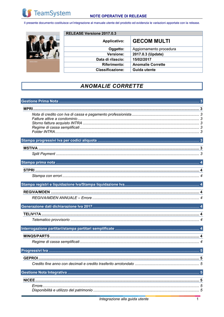 NOTE OPERATIVE DI RELEASE Il presente documento costituisce un’integrazione al manuale utente del prodotto ed evidenzia le variazioni apportate con la release. ANOMALIE CORRETTE RELEASE Versione 2017.0.3 Applicativo: Oggetto: Versione: Data di rilascio: Riferimento: Classificazione: GECOM MULTI Aggiornamento procedura 2017.0.3 (Update) 15/02/2017 Anomalie Corrette Guida utente ANOMALIE CORRETTE Gestione Prima Nota ....................................................................................................................................... 3 MPRI ................................................................................................................................................................ 3 Nota di credito con Iva di cassa e pagamento professionista ................................................................. 3 Fatture attive a condominio ..................................................................................................................... 3 Storno fattura acquisto INTRA ................................................................................................................ 3 Regime di cassa semplificati ................................................................................................................... 3 Folder INTRA ........................................................................................................................................... 3 Stampa progressivi Iva per codici aliquota .................................................................................................. 3 MSTIVA ........................................................................................................................................................... 3 Split Payment .......................................................................................................................................... 3 Stampa prima nota .......................................................................................................................................... 4 STPRI .............................................................................................................................................................. 4 Stampa con errori .................................................................................................................................... 4 Stampa registri e liquidazione Iva/Stampa liquidazione Iva........................................................................ 4 REGIVA/MDEN ............................................................................................................................................... 4 REGIVA/MDEN ANNUALE – Errore ....................................................................................................... 4 Generazione dati dichiarazione Iva 2017....................................................................................................... 4 TELIV17A ........................................................................................................................................................ 4 Telematico provvisorio ............................................................................................................................ 4 Interrogazione partitari/stampa partitari semplificate ................................................................................. 4 MINQS/PARTS ................................................................................................................................................ 4 Regime di cassa semplificati ................................................................................................................... 4 Progressivi Iva ................................................................................................................................................. 5 GEPROI ........................................................................................................................................................... 5 Credito fine anno con decimali e credito trasferito arrotondato .............................................................. 5 Gestione Nota Integrativa ............................................................................................................................... 5 NICEE .............................................................................................................................................................. 5 Errore ....................................................................................................................................................... 5 Disponibilità e utilizzo del patrimonio ...................................................................................................... 5 Integrazione alla guida utente 1 NOTE OPERATIVE DI RELEASE Il presente documento costituisce un’integrazione al manuale utente del prodotto ed evidenzia le variazioni apportate con la release. Gestione modello Iva 2017.............................................................................................................................. 6 GIVA17 ............................................................................................................................................................ 6 Controllo telematico Iva di gruppo ........................................................................................................... 6 Quadro VJ ............................................................................................................................................... 6 Ricalcolo Rate ......................................................................................................................................... 6 Integrazione alla guida utente 2 MULTI –ANOMALIE CORRETTE MULTI Gestione Prima Nota MPRI Nota di credito con Iva di cassa e pagamento professionista Con la precedente versione si verificava un’anomalia in presenza