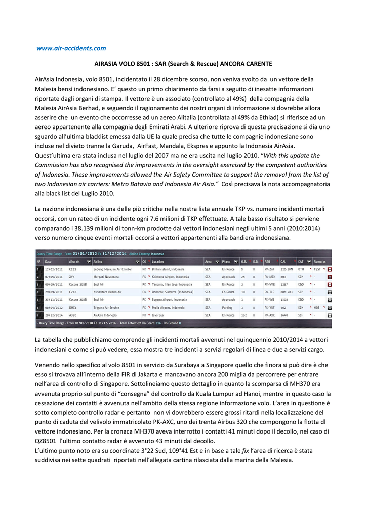www.air-accidents.com AIRASIA VOLO 8501 : SAR (Search & Rescue) ANCORA CARENTE AirAsia Indonesia, volo 8501, incidentato il 28 dicembre scorso, non veniva svolto da un vettore della Malesia bensì indonesiano. E’ questo un primo chiarimento da farsi a seguito di inesatte informazioni riportate dagli organi di stampa. Il vettore è un associato (controllato al 49%) della compagnia della Malesia AirAsia Berhad, e seguendo il ragionamento dei nostri organi di informazione si dovrebbe allora asserire che un evento che occorresse ad un aereo Alitalia (controllata al 49% da Ethiad) si riferisce ad un aereo appartenente alla compagnia degli Emirati Arabi. A ulteriore riprova di questa precisazione si dia uno sguardo all’ultima blacklist emessa dalla UE la quale precisa che tutte le compagnie indonesiane sono incluse nel divieto tranne la Garuda, AirFast, Mandala, Ekspres e appunto la Indonesia AirAsia. Quest’ultima era stata inclusa nel luglio del 2007 ma ne era uscita nel luglio 2010. “With this update the Commission has also recognised the improvements in the oversight exercised by the competent authorities of Indonesia. These improvements allowed the Air Safety Committee to support the removal from the list of two Indonesian air carriers: Metro Batavia and Indonesia Air Asia.” Così precisava la nota accompagnatoria alla black list del Luglio 2010. La nazione indonesiana è una delle più critiche nella nostra lista annuale TKP vs. numero incidenti mortali occorsi, con un rateo di un incidente ogni 7.6 milioni di TKP effettuate. A tale basso risultato si perviene comparando i 38.139 milioni di tonn-km prodotte dai vettori indonesiani negli ultimi 5 anni (2010:2014) verso numero cinque eventi mortali occorsi a vettori appartenenti alla bandiera indonesiana. La tabella che pubblichiamo comprende gli incidenti mortali avvenuti nel quinquennio 2010/2014 a vettori indonesiani e come si può vedere, essa mostra tre incidenti a servizi regolari di linea e due a servizi cargo. Venendo nello specifico al volo 8501 in servizio da Surabaya a Singapore quello che finora si può dire è che esso si trovava all’interno della FIR di Jakarta e mancavano ancora 200 miglia da percorrere per entrare nell’area di controllo di Singapore. Sottolineiamo questo dettaglio in quanto la scomparsa di MH370 era avvenuta proprio sul punto di “consegna” del controllo da Kuala Lumpur ad Hanoi, mentre in questo caso la cessazione dei contatti è avvenuta nell’ambito della stessa regione informazione volo. L’area in questione è sotto completo controllo radar e pertanto non vi dovrebbero essere grossi ritardi nella localizzazione del punto di caduta del velivolo immatricolato PK-AXC, uno dei trenta Airbus 320 che compongono la flotta dl vettore indonesiano. Per la cronaca MH370 aveva interrotto i contatti 41 minuti dopo il decollo, nel caso di QZ8501 l’ultimo contatto radar è avvenuto 43 minuti dal decollo. L’ultimo punto noto era su coordinate 3°22 Sud, 109°41 Est e in base a tale fix l’area di ricerca è stata suddivisa nei sette quadrati riportati nell’allegata cartina rilasciata dalla marina della Malesia. Trasponendo il punto di ultimo contatto nell’ambito delle carte che mostrano le Aree Informazioni Volo (FIR) della zona, si può osservare come l’are di scomparsa non fosse affatto “isolata”: I primi rottami dell’A320 sono stati individuati al terzo giorno di ricerche,nel pomeriggio del 30 dicembre, nello stretto di Karimata a sud-ovest di Pangkalanbun nel mar di Java quindi nell’area di interruzione del contatto, tuttavia anche questo incidente ha confermato la vulnerabilità del sistema aviazione nell’ambito del settore SAR, ovverosia l’individuazione dei rottami ed eventuali superstiti nell’immediatezza dell’evento catastrofico quando in teoria qualcuno degli occupanti del velivolo potrebbe essere ancora in vita e necessitare di immediata assistenza. E’ questo un punto dolente venuto alla ribalta nel caso di MH370, così come pure in AF447 del giugno 2009, ed ora riconfermato nell’incidente del volo AirAsia. E se per MH370 si poteva vantare l’attenuante della deliberata scomparsa del velivolo e cioè l’averlo voluto portare in una area di difficile individuazione fuori degli spazi controllati, nel caso di AirAsia 8501 l’aereo è scomparso durante il volo in una aerovia controllata (M635) sotto il pieno controllo radar, ma duole annotare che anche in questo ennesimo incidente la localizzazione del punto di impatto è giunta in ritardo. E se è vero quel che ci dicono gli esperti che in caso di incidenti in mare il miglior sensore rimane l’occhio umano, allora sarà veramente il caso di considerare il potenziamento dei localizzatori di emergenza dei quali fra l’altro nell’immediatezza della sciagura di AirAsia nessuno ha parlato, quasi che su di essi non si potesse affatto contare. AAR- Safety Newsletter (13/14), 31 Dicembre 2014