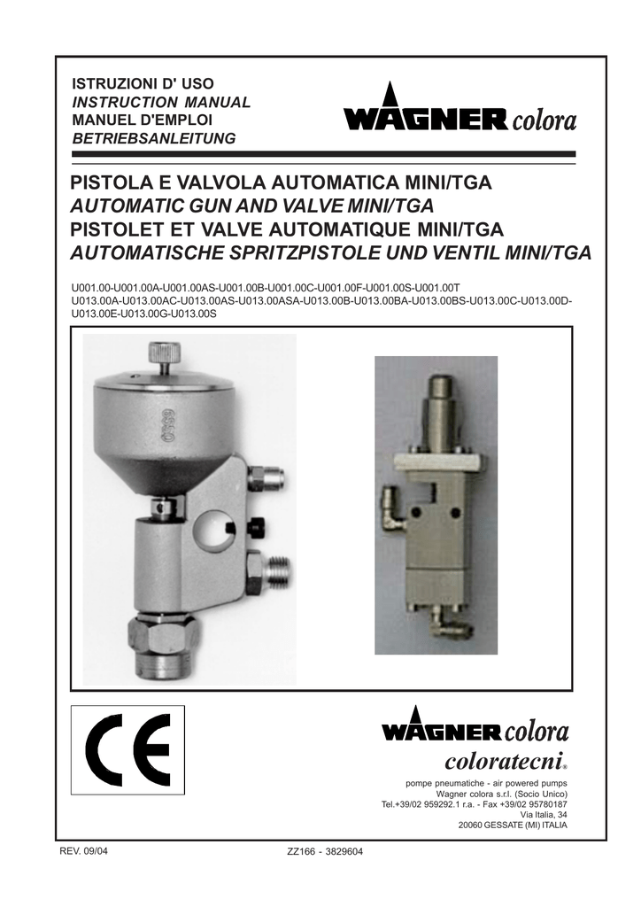 ISTRUZIONI D' USO INSTRUCTION MANUAL MANUEL D'EMPLOI BETRIEBSANLEITUNG PISTOLA E VALVOLA AUTOMATICA MINI/TGA AUTOMATIC GUN AND VALVE MINI/TGA PISTOLET ET VALVE AUTOMATIQUE MINI/TGA AUTOMATISCHE SPRITZPISTOLE UND VENTIL MINI/TGA U001.00-U001.00A-U001.00AS-U001.00B-U001.00C-U001.00F-U001.00S-U001.00T U013.00A-U013.00AC-U013.00AS-U013.00ASA-U013.00B-U013.00BA-U013.00BS-U013.00C-U013.00DU013.00E-U013.00G-U013.00S coloratecni ® pompe pneumatiche - air powered pumps Wagner colora s.r.l. (Socio Unico) Tel.+39/02 959292.1 r.a. - Fax +39/02 95780187 Via Italia, 34 20060 GESSATE (MI) ITALIA REV. 09/04 ZZ166 - 3829604 INDICE 1. 1.1 1.2 1.3 1.4 DATI IDENTIFICATIVI Lettera alla consegna Identificazione Garanzia Centri assistenza Pag. 4 Pag. 4 Pag. 4 Pag. 6 Pag. 8 1. 1.1 1.2 1.3 1.4 IDENTIFICATION DATA Letter to the customer Identification Guarantee Service centres Page 4 Page 4 Page 4 Page 6 Page 8 2. 2.1 NORME GENERALI Prescrizioni di sicurezza e rischi residui Rischi residui Istruzioni di sicurezza Pag. 10 2. 2.1 2.2 2.3 GENERAL SAFETY Safety measures and residul risks Remaining risks Safety instructions Page 10 Page 10 Page 12 Page 16 3. Page 24 Page 26 Page 28 Page 28 Page 28 Page 28 2.2 2.3 Pag. 10 Pag. 12 Pag. 16 3.1 3.2 3.3 3.4 3.5 DESCRIZIONE E CARATTERISTICHE TECNICHE Caratteristiche tecniche Rumorosità Ricambi Messa fuori servizio Immagazzinamento Pag. 24 Pag. 26 Pag. 28 Pag. 28 Pag. 28 Pag. 28 3.1 3.2 3.3 3.4 3.5 DESCRIPTION AND TECHNICAL CHARACTERISTICS TECHNICAL DESCRIPTION Technical characteristics Noise level Spare parts Equipment dismantling Storage 4. 4.1 4.2 PULIZIA E MANUTENZIONE Pulizia Manutenzione Pag. 30 Pag. 30 Pag. 30 4. 4.1 4.2 CLEANING AND MAINTENANCE Cleaning Manutenzione Page 30 Page 30 Page 30 5. RICERCA GUASTI Pag. 38 5. TROUBLESHOOTING Page 38 6. CATALOGO PARTI DI RICAMBIO Pag. 40 6. SPARE PARTS CATALOGUE Page 40 3. 2 INDEX ZZ166 INDEX INHALTSVERZEICHNIS 1. 1.1 1.2 1.3 1.4 DONNEES D' IDENTIFICATION Lettre à la livraison Identification Garantie Centres d'assistance Page 4 Page 4 Page 4 Page 6 Page 8 1. 1.1 1.2 1.3 1.4 ANGABEN ZUR ANLAGE Begleitschreiben Identifizierung Garantie Kundendienstzentren Seite 5 Seite 5 Seite 5 Seite 7 Seite 9 2. 2.1 NORMES GENERALES Prescriptions de sécurité et risques résiduels Risques résiduels Instructions de securite Page 10 2. 2.1 ALLGEMEINE VORSCHRIFTEN Sicherheitsvorschriften und Restrisiken Restrisiken Sicherheitshinweise Seite 11 Seite 11 Seite 13 Seite 17 3.1 3.2 3.3 3.4 3.5 BESCHREIBUNG DER ANLAGE UND TECHNISCHE DATEN Technische Daten Schallpegel Ersatzteile Stillegung Lagerung Seite 25 Seite 26 Seite 29 Seite 29 Seite 29 Seite 29 4. 4.1 4.2 REINIGUNG UND WARTUNG Reinigung Wartung Seite 31 Seite 31 Seite 31 5. STÖRUNGSSUCHE Seite 39 6. ERSATZTEILKATALOG Seite 41 2.2 2.3 3. Page 10 Page 12 Page 16 3.1 3.2 3.3 3.4 3.5 DESCRIPTION ET CARACTERISQTIQUES TECHNIQUES Caractéristiques techniques Nuisance sonore Pièces de rechange Mise au rebut Stockage Page 24 Page 26 Page 28 Page 28 Page 28 Page 28 4. 4.1 4.2 NETTOYAGE ET ENTRETIEN Nettoyage Entretien Page 30 Page 30 Page 30 5. DETECTION DES PANNES Page 39 6. CATALOGUE DES PIECES DE RECHANGE 2.2 2.3 3. Page 40 ZZ166 3 1. DONNES D' IDENTIFICATION DE LA MACHINE 1.1 LETTRE A LA LIVRAISON 1. DATI IDENTIFICATIVI 1. IDENTIFICATION DATA 1.1 LETTERA ALLA CONSEGNA 1.1 LETTER TO THE CUSTOMER Egregio Signore, Questo apparecchio è stato fabbricato utilizzando i materiali migliori e le tecniche costruttive più moderne. Le ricordiamo che una buona conoscenza dell’apparecchiatura ne facilita sensibilmente I’uso e che un impiego corretto consente di evitare molti problemi, migliora il rendimento e prolunga la durata. Legga quindi attentamente le istruzioni che seguono prima di mettere in funzione I’apparecchiatura. La mancata osservanza delle indicazioni riportate in questo fascicolo o I’uso improprio dell’ apparecchiatura da parte di personale non qualificato e non autorizzato può provocare dei rischi alle persone o all’ambiente causati da fluidi in pressione. II nostro Servizio Tecnico di Assistenza é a Sua completa disposizione: per ogni dubbio o problema ci interpelli, anche telefonicamente. Dear sir, this equipment was manufactured using the best materials and most modern manufacturing techniques. We remind you that a good knowledge of the equipment makes its use much easier while a proper use allows you to prevent many problems, improves the performance of the machine and extends its working life. Therefore read carefully the following instructions before operating the equipment. The non-observance of the instructions contained in this booklet or the improper use of the equipment by unskilled or non-authorised staff, can cause risks to people or to the environment, provoked by fluids under pressure Our Technical Assistance Service is at your full disposal: for any doubt or problem, please contact us, even by a phone-call. Monsieur, Cet appareil a été fabriqué avec les meilleurs matériaux et à l’aide des techniques de fabrication les plus modernes. Nous vous rappelons que la bonne connaissance de l’appareillage facilite nettement l’utilisation de la machine et qu’un emploi correct de cette dernière permet d’éviter de nombreux problèmes, d’en améliorer le rendement et d’en prolonger la durée. Avant de mettre l’appareil en marche, veuillez donc lire attentivement les instructions qui suivent. La non-observation des indications présentées dans ce fascicule ou l’utilisation impropre de l’appareil de la part de personnes non qualifiées et non autorisées à ce faire peut impliquer des risques subis par les personnes ou par le milieu, à cause de la fuite de liquides sous pression. Notre Service d’Assistance Technique est à votre complète disposition. N’hésitez pas à le contacter, même par téléphone, en cas de doutes ou de problèmes WAGNER colora S.r.l. WAGNER colora Sr.l. WAGNER colora Sr.l. 1.2 IDENTIFICAZIONE 1.2 IDENTIFICATION 1.2 I