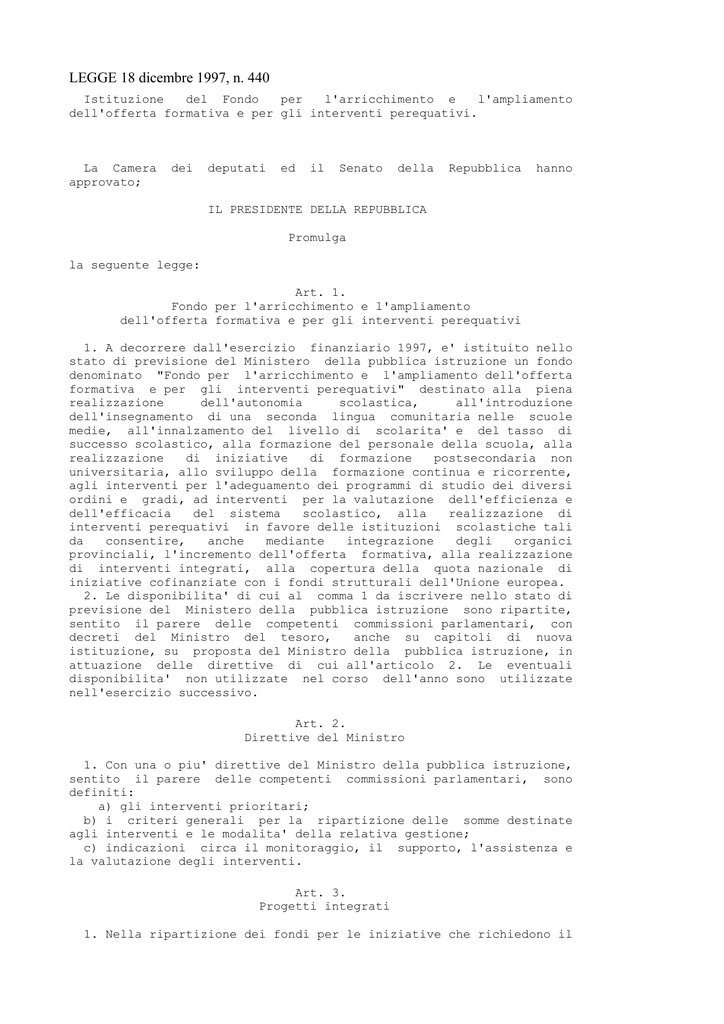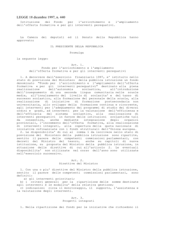 LEGGE 18 dicembre 1997, n. 440 Istituzione del Fondo per l'arricchimento e l'ampliamento dell'offerta formativa e per gli interventi perequativi. La Camera approvato; dei deputati ed il Senato della Repubblica hanno IL PRESIDENTE DELLA REPUBBLICA Promulga la seguente legge: Art. 1. Fondo per l'arricchimento e l'ampliamento dell'offerta formativa e per gli interventi perequativi 1. A decorrere dall'esercizio finanziario 1997, e' istituito nello stato di previsione del Ministero della pubblica istruzione un fondo denominato "Fondo per l'arricchimento e l'ampliamento dell'offerta formativa e per gli interventi perequativi" destinato alla piena realizzazione dell'autonomia scolastica, all'introduzione dell'insegnamento di una seconda lingua comunitaria nelle scuole medie, all'innalzamento del livello di scolarita' e del tasso di successo scolastico, alla formazione del personale della scuola, alla realizzazione di iniziative di formazione postsecondaria non universitaria, allo sviluppo della formazione continua e ricorrente, agli interventi per l'adeguamento dei programmi di studio dei diversi ordini e gradi, ad interventi per la valutazione dell'efficienza e dell'efficacia del sistema scolastico, alla realizzazione di interventi perequativi in favore delle istituzioni scolastiche tali da consentire, anche mediante integrazione degli organici provinciali, l'incremento dell'offerta formativa, alla realizzazione di interventi integrati, alla copertura della quota nazionale di iniziative cofinanziate con i fondi strutturali dell'Unione europea. 2. Le disponibilita' di cui al comma 1 da iscrivere nello stato di previsione del Ministero della pubblica istruzione sono ripartite, sentito il parere delle competenti commissioni parlamentari, con decreti del Ministro del tesoro, anche su capitoli di nuova istituzione, su proposta del Ministro della pubblica istruzione, in attuazione delle direttive di cui all'articolo 2. Le eventuali disponibilita' non utilizzate nel corso dell'anno sono utilizzate nell'esercizio successivo. Art. 2. Direttive del Ministro 1. Con una o piu' direttive del Ministro della pubblica istruzione, sentito il parere delle competenti commissioni parlamentari, sono definiti: a) gli interventi prioritari; b) i criteri generali per la ripartizione delle somme destinate agli interventi e le modalita' della relativa gestione; c) indicazioni circa il monitoraggio, il supporto, l'assistenza e la valutazione degli interventi. Art. 3. Progetti integrati 1. Nella ripartizione dei fondi per le iniziative che richiedono il coinvolgimento degli enti locali e' data la precedenza a progetti conseguenti ad accordi nei quali gli enti locali abbiano dato la concreta disponibilita' ad assolvere agli obblighi loro spettanti per legge, ovvero a quelli deliberati da reti di scuole. Art. 4. Dotazione del fondo 1. La dotazione del fondo di cui all'articolo 1 e' determinata in lire 100 miliardi per l'anno 1997, in lire 400 miliardi per l'anno 1998 e in lire 345 miliardi annue a decorrere dall'anno 1999. All'onere relativo agli anni 1997, 1998 e 1999 si provvede mediante corrispondente riduzione dello stanziamento iscritto, ai fini del bilancio triennale 1997-1999, al capitolo 6856 dello stato di previsione del Ministero del tesoro per l'anno 1997, all'uopo parzialmente utilizzando, per lire 100 miliardi per ciascuno degli anni 1997, 1998 e 1999, l'accantonamento relativo al Ministero della pubblica istruzione e per lire 300 miliardi per l'anno 1998 e lire 245 miliardi per l'anno 1999, l'accantonamento relativo alla Presidenza del Consiglio dei Ministri. ((1)) 2. Il Ministro del tesoro e' autorizzato ad apportare, con propri decreti, le occorrenti variazioni di bilancio. La presente legge, munita del sigillo dello Stato, sara' inserita nella Raccolta ufficiale degli atti normativi della Repubblica italiana. E' fatto obbligo a chiunque spetti di osservarla e di farla osservare come legge dello Stato. Data a Roma, addi' 18 dicembre 1997 SCALFARO Visto, il Guardasigilli: Flick Prodi, Presidente del Consiglio dei Ministri Berlinguer, Ministro della pubblica istruzione e dell'universita' e della ricerca scientifica e tecnologica ----------------AGGIORNAMENTO (1) La L. 22 marzo 2000, n. 69 ha disposto (con l'art. 1, comma 1) "Il Fondo di cui alla legge 18 dicembre 1997, n. 440, e' incrementato della somma di lire 25.369 milioni per il 2000 e lire 21.273 milioni annue a decorrere dal 2001, destinati al potenziamento ed alla qualificazione dell'offerta di integrazione scolastica degli alunni in situazioni di handicap, con particolare attenzione per quelli con handicap sensoriali."