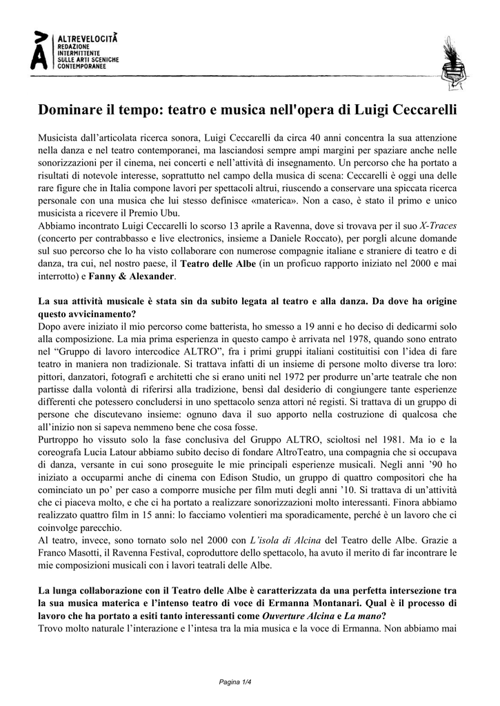 Dominare il tempo: teatro e musica nell'opera di Luigi Ceccarelli Musicista dall’articolata ricerca sonora, Luigi Ceccarelli da circa 40 anni concentra la sua attenzione nella danza e nel teatro contemporanei, ma lasciandosi sempre ampi margini per spaziare anche nelle sonorizzazioni per il cinema, nei concerti e nell’attività di insegnamento. Un percorso che ha portato a risultati di notevole interesse, soprattutto nel campo della musica di scena: Ceccarelli è oggi una delle rare figure che in Italia compone lavori per spettacoli altrui, riuscendo a conservare una spiccata ricerca personale con una musica che lui stesso definisce «materica». Non a caso, è stato il primo e unico musicista a ricevere il Premio Ubu. Abbiamo incontrato Luigi Ceccarelli lo scorso 13 aprile a Ravenna, dove si trovava per il suo X-Traces (concerto per contrabbasso e live electronics, insieme a Daniele Roccato), per porgli alcune domande sul suo percorso che lo ha visto collaborare con numerose compagnie italiane e straniere di teatro e di danza, tra cui, nel nostro paese, il Teatro delle Albe (in un proficuo rapporto iniziato nel 2000 e mai interrotto) e Fanny & Alexander. La sua attività musicale è stata sin da subito legata al teatro e alla danza. Da dove ha origine questo avvicinamento? Dopo avere iniziato il mio percorso come batterista, ho smesso a 19 anni e ho deciso di dedicarmi solo alla composizione. La mia prima esperienza in questo campo è arrivata nel 1978, quando sono entrato nel “Gruppo di lavoro intercodice ALTRO”, fra i primi gruppi italiani costituitisi con l’idea di fare teatro in maniera non tradizionale. Si trattava infatti di un insieme di persone molto diverse tra loro: pittori, danzatori, fotografi e architetti che si erano uniti nel 1972 per produrre un’arte teatrale che non partisse dalla volontà di riferirsi alla tradizione, bensì dal desiderio di congiungere tante esperienze differenti che potessero concludersi in uno spettacolo senza attori né registi. Si trattava di un gruppo di persone che discutevano insieme: ognuno dava il suo apporto nella costruzione di qualcosa che all’inizio non si sapeva nemmeno bene che cosa fosse. Purtroppo ho vissuto solo la fase conclusiva del Gruppo ALTRO, scioltosi nel 1981. Ma io e la coreografa Lucia Latour abbiamo subito deciso di fondare AltroTeatro, una compagnia che si occupava di danza, versante in cui sono proseguite le mie principali esperienze musicali. Negli anni ’90 ho iniziato a occuparmi anche di cinema con Edison Studio, un gruppo di quattro compositori che ha cominciato un po’ per caso a comporre musiche per film muti degli anni ’10. Si trattava di un’attività che ci piaceva molto, e che ci ha portato a realizzare sonorizzazioni molto interessanti. Finora abbiamo realizzato quattro film in 15 anni: lo facciamo volentieri ma sporadicamente, perché è un lavoro che ci coinvolge parecchio. Al teatro, invece, sono tornato solo nel 2000 con L’isola di Alcina del Teatro delle Albe. Grazie a Franco Masotti, il Ravenna Festival, coproduttore dello spettacolo, ha avuto il merito di far incontrare le mie composizioni musicali con i lavori teatrali delle Albe. La lunga collaborazione con il Teatro delle Albe è caratterizzata da una perfetta intersezione tra la sua musica materica e l’intenso teatro di voce di Ermanna Montanari. Qual è il processo di lavoro che ha portato a esiti tanto interessanti come Ouverture Alcina e La mano? Trovo molto naturale l’interazione e l’intesa tra la mia musica e la voce di Ermanna. Non abbiamo mai Pagina 1/4 fatto sforzi, né abbiamo mai messo in atto discussioni o particolari teorizzazioni. Abbiamo sempre interagito in modo molto spontaneo. Trovo che la sua voce si adatti benissimo alla mia musica, ne è anzi il punto di contatto ideale con il teatro, ed evidentemente lei si trova a suo agio in questa sinergia. Non c’è alcun lavoro ideologico o artificiale sotto; ci siamo trovati subito bene e abbiamo trovato che le cose andassero perfettamente, sin dal nostro primo incontro per L'isola di Alcina. [Ermanna Montanari ne L'isola di Alcina_ph Enrico Fedrigoli] Nella musica per le arti sceniche, esistono delle soglie raggiungibili solo dalla musica, oppure solo dal corpo e dalla voce dell’attore? Inizierei a rispondere partendo dal cinema, dove l’immagine e il suono sono più distaccati tra loro. Nel cinema, quando immagine e suono funzionano, la musica apparentemente passa in secondo piano, poiché ciò che lo spettatore ricorda meglio è l’immagine. Tuttavia, a mio parere l’importanza dei due elementi è identica. Oggettivamente ci si ricorda dell’immagine, ma è il suono a dare all’immagine la sua forza evocativa ed emotiva. Senza musica l’immagine non ha forza, e rischia di essere percepita in maniera alterata. Il suono cambia la percezione e aumenta le sensazioni dello spettatore, agendo nel campo dell’inconscio e dell’emotività. Al cinema è molto facile rendersi conto di questo: basta togliere il sonoro a un film per fargli perdere tutta la sua potenza. E questo vale anche per il teatro, dove però il discorso è più complicato. Anche nel teatro gli spettatori legano il ricordo all’immagine o al testo, ma è in realtà la musica che contribuisce in modo sostanziale alla percezione profonda ed emotiva di uno spettacolo complesso. Inoltre, in teatro c’è la presenza dal vivo dell’attore/performer che, quando è capace, è una presenza davvero significativa, molto più che nel cinema: a teatro l’attore può già da sé contribuire all’emotività dello spettatore, mentre in un film l’immagine non può fare lo stesso senza la musica. Nel teatro e nella danza, dunque, la musica ha un ruolo più fluido e sottile, meno diretto, che dunque permette esplorazioni laterali e autonome per una maggiore pienezza. I suoi lavori sono tra i rari esempi in cui la musica per le arti sceniche ha una notevole forza narrativa, tanto da avere una propria 