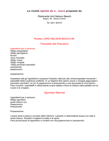 Le ricette tipiche da a…mare proposte da Ristorante lord Nelson Beach Bagno. 69 - Marina Centro Tel. 0541 393737 Ricette LORD NELSON BEACH 69 Passatelli alla Pescatora ingredienti per 4 persone: 400gr pangrattato200gr parmigiano6uovanoce moscata300gr cozze 300gr vongole 150gr pomodori pendolini prezzemolo peperoncino preparazione: impastare tutti gli ingredienti e passare l'impasto ottenuto allo schiacciapatate ricavando i passatelli della lunghezza preferita. In un tegame fare aprire cozze e vongole,aggiungere i pomodori pendolini, un po' di peperoncino e prezzemolo e una spruzzata di vino bianco. Fare cuocere i passatelli in abbondante acqua salata e finire la cottura nella padella con le cozze e le vongole.. Sgomberi Marinati Ingredienti per 4 persone: 800gr sgomberi aceto bianco q.b. Peperoncino Prezzemolo Preparazione Lavare bene il pesce e privarlo delle interiora. Lessarlo in abbondante acqua con sale e aceto bianco. Scolarlo e togliere la pelle e le spine. Fare piccoli pezzi di sgombero e condirli con olio,peperoncino e prezzemolo. Sardoncini alla Griglia INGREDIENTI PER 4 PERSONE 1kg sardoncini freschi pangrattato prezzemolo olio extravergine sale e pepe q.b. Togliere la testa e le interiora ai sardoncini, lavarli bene e farli scolare. Preparare del pane grattuggiato e condirlo con olio,sale,pepe e prezzemolo. Condire i sardoncini,formare gli spiedini e cuocerli sulla griglia. Vi aspettiamo tutti i ma rtedì sera dal 2 6 giugno al 2 8 agosto per fa rvi gustare i migliori piatti tipici del nostro ter ritorio.