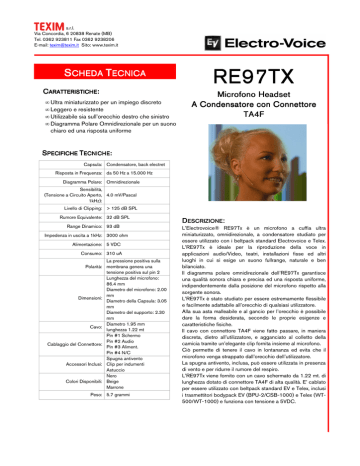 s.r.l. Via Concordia, 6 20838 Renate (MB) Tel. 0362 923811 Fax 0362 9238206 E-mail: [email protected] Sito: www.texim.it SCHEDA TECNICA CARATTERISTICHE: • • • • Ultra miniaturizzato per un impiego discreto Leggero e resistente Utilizzabile sia sull’orecchio destro che sinistro Diagramma Polare Omnidirezionale per un suono chiaro ed una risposta uniforme RE9 RE97TX Microfono Headset A Condensatore con Connettore TA4F SPECIFICHE PECIFICHE T ECNICHE: Capsula: Condensatore, back electret Risposta in Frequenza: da 50 Hz a 15.000 Hz Diagramma Polare: Omnidirezionale Sensibilità, (Tensione a Circuito Aperto, 4.0 mV/Pascal 1kHz): Livello di Clipping: > 125 dB SPL Rumore Equivalente: 32 dB SPL Range Dinamico: 93 dB Impedenza in uscita a 1kHz: 3000 ohm Alimentazione: 5 VDC Consumo: 310 uA La pressione positiva sulla Polarità: membrana genera una tensione positiva sul pin 2 Lunghezza del microfono: 86.4 mm Diametro del microfono: 2.00 mm Dimensioni: Diametro della Capsula: 3.05 mm Diametro del supporto: 2.30 mm Diametro 1.95 mm Cavo: lunghezza 1.22 mt Pin #1 Schermo Pin #2 Audio Cablaggio del Connettore: Pin #3 Aliment. Pin #4 N/C Spugna antivento Accessori Inclusi: Clip per indumenti Astuccio Nero Colori Disponibili: Beige Marrone Peso: 5.7 grammi D ESCRIZIONE: L’Electrovoice® RE97Tx è un microfono a cuffia ultra miniaturizzato, omnidirezionale, a condensatore studiato per essere utilizzato con i beltpack standard Electrovoice e Telex. L’RE97Tx è ideale per la riproduzione della voce in applicazioni audio/Video, teatri, installazioni fisse ed altri luoghi in cui si esige un suono fullrange, naturale e ben bilanciato. Il diagramma polare omnidirezionale dell’RE97Tx garantisce una qualità sonora chiara e precisa ed una risposta uniforme, indipendentemente dalla posizione del microfono rispetto alla sorgente sonora. L’RE97Tx è stato studiato per essere estremamente flessibile e facilmente adattabile all’orecchio di qualsiasi utilizzatore. Alla sua asta malleabile e al gancio per l’orecchio è possibile dare la forma desiderata, secondo le proprie esigenze e caratteristiche fisiche. Il cavo con connettore TA4F viene fatto passare, in maniera discreta, dietro all’utilizzatore, e agganciato al colletto della camicia tramite un’elegante clip fornita insieme al microfono. Ciò permette di tenere il cavo in lontananza ed evita che il microfono venga strappato dall’orecchio dell’utilizzatore. La spugna antivento, inclusa, può essere utilizzata in presenza di vento e per ridurre il rumore del respiro. L’RE97Tx viene fornito con un cavo schermato da 1.22 mt. di lunghezza dotato di connettore TA4F di alta qualità. E’ cablato per essere utilizzato con beltpack standard EV e Telex, inclusi i trasmettitori bodypack EV (BPU-2/CSB-1000) e Telex (WT500/WT-1000) e funziona con tensione a 5VDC.
