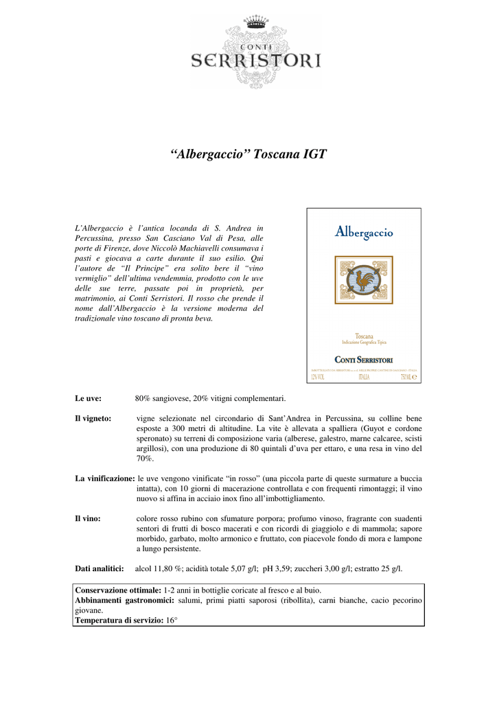 “Albergaccio” Toscana IGT L’Albergaccio è l’antica locanda di S. Andrea in Percussina, presso San Casciano Val di Pesa, alle porte di Firenze, dove Niccolò Machiavelli consumava i pasti e giocava a carte durante il suo esilio. Qui l’autore de “Il Principe” era solito bere il “vino vermiglio” dell’ultima vendemmia, prodotto con le uve delle sue terre, passate poi in proprietà, per matrimonio, ai Conti Serristori. Il rosso che prende il nome dall’Albergaccio è la versione moderna del tradizionale vino toscano di pronta beva. Le uve: 80% sangiovese, 20% vitigni complementari. Il vigneto: vigne selezionate nel circondario di Sant’Andrea in Percussina, su colline bene esposte a 300 metri di altitudine. La vite è allevata a spalliera (Guyot e cordone speronato) su terreni di composizione varia (alberese, galestro, marne calcaree, scisti argillosi), con una produzione di 80 quintali d’uva per ettaro, e una resa in vino del 70%. La vinificazione: le uve vengono vinificate “in rosso” (una piccola parte di queste surmature a buccia intatta), con 10 giorni di macerazione controllata e con frequenti rimontaggi; il vino nuovo si affina in acciaio inox fino all’imbottigliamento. Il vino: colore rosso rubino con sfumature porpora; profumo vinoso, fragrante con suadenti sentori di frutti di bosco macerati e con ricordi di giaggiolo e di mammola; sapore morbido, garbato, molto armonico e fruttato, con piacevole fondo di mora e lampone a lungo persistente. Dati analitici: alcol 11,80 %; acidità totale 5,07 g/l; pH 3,59; zuccheri 3,00 g/l; estratto 25 g/l. Conservazione ottimale: 1-2 anni in bottiglie coricate al fresco e al buio. Abbinamenti gastronomici: salumi, primi piatti saporosi (ribollita), carni bianche, cacio pecorino giovane. Temperatura di servizio: 16°