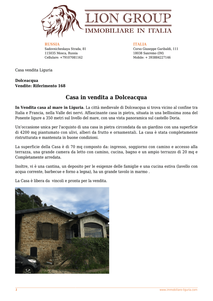 RUSSIA ITALIA Sadovnicheskaya Strada, 81 115035 Mosca, Russia Cellulare: +79107081162 Corso Giuseppe Garibaldi, 111 18038 Sanremo (IM) Mobile: + 393884227146 Casa vendita Liguria Dolceacqua Vendite: Riferimento 168 Casa in vendita a Dolceacqua In Vendita casa al mare in Liguria. La città medievale di Dolceacqua si trova vicino al confine tra Italia e Francia, nella Valle dei nervi. Affascinante casa in pietra, situata in una bellissima zona del Ponente ligure a 350 metri sul livello del mare, con una vista panoramica sul castello Doria. Un’occasione unica per l'acquisto di una casa in pietra circondata da un giardino con una superficie di 4200 mq piantumato con ulivi, alberi da frutto e ornamentali. La casa è stata completamente ristrutturata e mantenuta in buone condizioni. La superficie della Casa è di 70 mq composto da: ingresso, soggiorno con camino e accesso alla terrazza, una grande camera da letto con camino, cucina, bagno e un ampio terrazzo di 20 mq e Completamente arredata. Inoltre, vi è una cantina, un deposito per le esigenze delle famiglie e una cucina estiva (lavello con acqua corrente, barbecue e forno a legna), ha un grande tavolo in marmo . La Casa è libera da vincoli e pronta per la vendita. 1 www.immobiliare-liguria.com Caratteristiche principali: ● ● ● ● ● ● ● ● ● ● Data annuncio:29/05/2016 Contratto:Vendite Città:Dolceacqua Riferimento:168 Superficie:70 Mq Camere:2 Bagni:1 Classe energetica:G EPI:329,74 kWh/m² Prezzo:€ 225.000 Dettagli: ● ● ● ● ● ● ● ● ● ● ● ● Terrazza Armadi a muro Cantina Bagno Doccia Posto auto Giardino Vista montagne Vista mare Barbecue Camino Internet Fai una domanda +(39)01841894316 +(39)3884227146 2 www.immobiliare-liguria.com