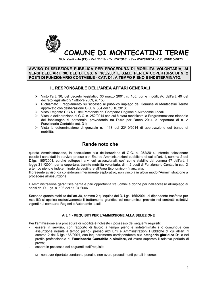 COMUNE DI MONTECATINI TERME Viale Verdi n.46 (PT) – CAP 51016 – Tel.05729181 – Fax 0572918264 – C.F. 00181660473 AVVISO DI SELEZIONE PUBBLICA PER PROCEDURA DI MOBILITÀ VOLONTARIA, AI SENSI DELL’ART. 30, DEL D. LGS. N. 165/2001 E S.M.I., PER LA COPERTURA DI N. 2 POSTI DI FUNZIONARIO CONTABILE - CAT. D1, A TEMPO PIENO E INDETERMINATO. IL RESPONSABILE DELL’AREA AFFARI GENERALI Visto l’art. 30, del decreto legislativo 30 marzo 2001, n. 165, come modificato dall’art. 49 del decreto legislativo 27 ottobre 2009, n. 150; Richiamato il regolamento sull’accesso al pubblico impiego del Comune di Montecatini Terme approvato con deliberazione G.C. n. 304 del 10.10.2013; Visto il vigente C.C.N.L. del Personale del Comparto Regione e Autonomie Locali; Viste la deliberazione di G.C. n. 252/2014 con cui è stata modificata la Programmazione triennale del fabbisogno di personale, prevedendo tra l’altro per l’anno 2014 la copertura di n. 2 Funzionario Contabile cat. D1; Vista la determinazione dirigenziale n. 1118 del 23/10/2014 di approvazione del bando di mobilità; Rende noto che questa Amministrazione, in esecuzione alla deliberazione di G.C. n. 252/2014, intende selezionare possibili candidati in servizio presso altri Enti ed Amministrazioni pubbliche di cui all’art. 1, comma 2 del D.lgs. 165/2001, purchè sottoposti a vincoli assunzionali, così come stabilito dal comma 47 dell’art. 1 legge 311/2004, per la copertura, tramite mobilità volontaria, di n. 2 posti di Funzionario Contabile cat. D a tempo pieno e indeterminato da destinare all’Area Economico - finanziaria. Il presente avviso, da considerarsi meramente esplorativo, non vincola in alcun modo l'Amministrazione a procedere all'assunzione. L’Amministrazione garantisce parità e pari opportunità tra uomini e donne per nell’accesso all’impiego ai sensi del D. Lgs. n. 198 del 11.04.2006. Secondo quanto stabilito dall’art.30, comma 2 quinquies del D. Lgs. 165/2001, al dipendente trasferito per mobilità si applica esclusivamente il trattamento giuridico ed economico, previsto nei contratti collettivi vigenti nel comparto Regioni e Autonomie locali. Art. 1 - REQUISITI PER L’AMMISSIONE ALLA SELEZIONE Per l’ammissione alla procedura di mobilità è richiesto il possesso dei seguenti requisiti: essere in servizio, con rapporto di lavoro a tempo pieno e indeterminato ( o comunque con assunzione iniziale a tempo pieno), presso altri Enti e Amministrazioni Pubbliche di cui all’art. 1 comma 2 del D.lgs 165/2001, con inquadramento corrispondente alla categoria giuridica D1 e nel profilo professionale di Funzionario Contabile o similare, ed avere superato il relativo periodo di prova; essere in possesso dei seguenti titoli/requisiti: non aver riportato condanne penali e non avere procedimenti penali in corso; 1 di non aver riportato, nei due anni precedenti la data di scadenza del presente avviso, sanzioni disciplinari superiori alla censura, né avere procedimenti disciplinari per fatti che prevedono l’applicazione di sanzioni disciplinari superiori a quella della censura; possedere idoneità psicofisica all’espletamento delle mansioni da svolgere; Art. 2 - CONTENUTO, TERMINI E MODALITÀ DI PRESENTAZIONE DELLE DOMANDE DI AMMISSIONE ALLA SELEZIONE La domanda di partecipazione dovrà essere redatta compilando il modello allegato al presente bando di concorso (all. A) contenere le dichiarazioni in esso riportate e correlata da curriculum professionale, datato e firmato. La domanda di partecipazione dovrà essere firmata per esteso e in originale a pena di esclusione dalla selezione. La firma non è soggetta ad autenticazione e l’omissione, in allegato alla domanda, della copia del proprio documento d’identità comporta esclusione dalla selezione. Ai fini della presente selezione non verranno prese in considerazione le domande di mobilità già in possesso del Comune di Montecatini Terme. Pertanto tutti coloro che abbiano già presentato domanda di mobilità e siano tuttora interessati, dovranno presentare una nuova domanda secondo le indicazioni previste nel presente avviso. La mancanza o l'incompletezza delle dichiarazioni previste nello schema di domanda, fatta eccezione per le cause di esclusione di cui al successivo art. 3, può essere sanata dal candidato entro 5 giorni dal ricevimento della richiesta di regolarizzazione da parte di questa Amministrazione. La mancata regolarizzazione entro il termine predetto determina l'esclusione dalla selezione. La domanda può essere presentata: direttamente presso l’ufficio protocollo del Comune di Montecatini Terme con orario di apertura al pubblico dal lun. al ven. 8.30/13.00, mart. e giov. 14.30/17.00; tramite spedizione a mezzo di raccomandata con avviso di ricevimento al Comune di Montecatini Terme – Viale Verdi n. 46 - 51016 Montecatini Terme (PT); La busta contenente le domande di ammissione ed i documenti deve riportare, sulla facciata in cui è riportato l'indirizzo, l'indicazione: "CONTIENE DOMANDA PER MOBILITÀ VOLONTARIA, PER LA COPERTURA DI POSTI DI FUNZIONARIO CONTABILE”. Mediante PEC (posta elettronica certificata) personale del partecipante al seguente indirizzo: [email protected] In quest’ultimo caso farà fede la data e l’ora di arrivo al gestore di posta elettronica certificata dell’ente (ricevuta di avvenuta consegna), quest’informazione sarà inviata automaticamente alla casella di PEC del mittente, dal gestore di PEC dell’Ente al momento del deposito del messaggio di PEC del mittente nella casella dell’Ente. Tutti i documenti allegati (compreso il modulo della domanda) e inviati tramite PEC devono essere sottoscritti con firma digitale utilizzando un certificato di firma digitale in corso di validità, rilasciato da un organismo incluso nell’elenco pubblico dei certificatori tenuto dal CNIPA ( previsto dall’art. 29 comma 1 del D. Lgs. 82/2005) generato mediante un dispositivo per la creazione di una firma sicura, ai sensi