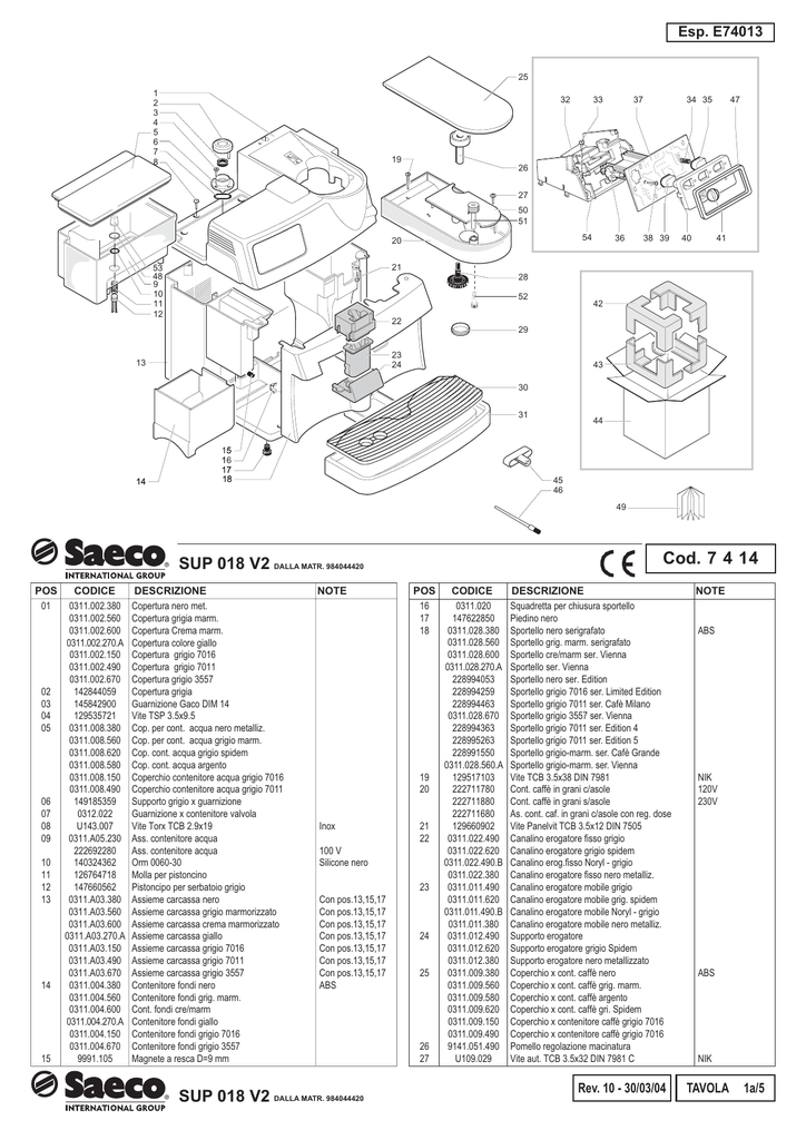 Esp. E74013 25 1 2 3 4 5 6 7 8 32 19 34 35 37 33 47 26 27 50 51 54 20 21 53 48 9 10 11 12 38 39 41 40 28 52 22 42 29 23 24 13 36 43 30 31 14 5 15 1 16 17 18 44 45 46 9 49 Cod. 7 4 14 SUP 018 V2 DALLA MATR. 984044420 POS 01 02 03 04 05 06 07 08 09 10 11 12 13 14 15 CODICE 0311.002.380 0311.002.560 0311.002.600 0311.002.270.A 0311.002.150 0311.002.490 0311.002.670 142844059 145842900 129535721 0311.008.380 0311.008.560 0311.008.620 0311.008.580 0311.008.150 0311.008.490 149185359 0312.022 U143.007 0311.A05.230 222692280 140324362 126764718 147660562 0311.A03.380 0311.A03.560 0311.A03.600 0311.A03.270.A 0311.A03.150 0311.A03.490 0311.A03.670 0311.004.380 0311.004.560 0311.004.600 0311.004.270.A 0311.004.150 0311.004.670 9991.105 DESCRIZIONE Copertura nero met. Copertura grigia marm. Copertura Crema marm. Copertura colore giallo Copertura grigio 7016 Copertura grigio 7011 Copertura grigio 3557 Copertura grigia Guarnizione Gaco DIM 14 Vite TSP 3.5x9.5 Cop. per cont. acqua nero metalliz. Cop. per cont. acqua grigio marm. Cop. cont. acqua grigio spidem Cop. cont. acqua argento Coperchio contenitore acqua grigio 7016 Coperchio contenitore acqua grigio 7011 Supporto grigio x guarnizione Guarnizione x contenitore valvola Vite Torx TCB 2.9x19 Ass. contenitore acqua Ass. contenitore acqua Orm 0060-30 Molla per pistoncino Pistoncipo per serbatoio grigio Assieme carcassa nero Assieme carcassa grigio marmorizzato Assieme carcassa crema marmorizzato Assieme carcassa giallo Assieme carcassa grigio 7016 Assieme carcassa grigio 7011 Assieme carcassa grigio 3557 Contenitore fondi nero Contenitore fondi grig. marm. Cont. fondi cre/marm Contenitore fondi giallo Contenitore fondi grigio 7016 Contenitore fondi grigio 3557 Magnete a resca D=9 mm NOTE POS 16 17 18 19 20 Inox 21 22 100 V Silicone nero 23 Con pos.13,15,17 Con pos.13,15,17 Con pos.13,15,17 Con pos.13,15,17 Con pos.13,15,17 Con pos.13,15,17 Con pos.13,15,17 ABS SUP 018 V2 DALLA MATR. 984044420 24 25 26 27 CODICE 0311.020 147622850 0311.028.380 0311.028.560 0311.028.600 0311.028.270.A 228994053 228994259 228994463 0311.028.670 228994363 228995263 228991550 0311.028.560.A 129517103 222711780 222711880 222711680 129660902 0311.022.490 0311.022.620 0311.022.490.B 0311.022.380 0311.011.490 0311.011.620 0311.011.490.B 0311.011.380 0311.012.490 0311.012.620 0311.012.380 0311.009.380 0311.009.560 0311.009.580 0311.009.620 0311.009.150 0311.009.490 9141.051.490 U109.029 DESCRIZIONE Squadretta per chiusura sportello Piedino nero Sportello nero serigrafato Sportello grig. marm. serigrafato Sportello cre/marm ser. Vienna Sportello ser. Vienna Sportello nero ser. Edition Sportello grigio 7016 ser. Limited Edition Sportello grigio 7011 ser. Cafè Milano Sportello grigio 3557 ser. Vienna Sportello grigio 7011 ser. Edition 4 Sportello grigio 7011 ser. Edition 5 Sportello grigio-marm. ser. Cafè Grande Sportello grigio-marm. ser. Vienna Vite TCB 3.5x38 DIN 7981 Cont. caffè in grani c/asole Cont. caffè in grani s/asole As. cont. caf. in grani c/asole con reg. dose Vite Panelvit TCB 3.5x12 DIN 7505 Canalino erogatore fisso grigio Canalino erogatore grigio spidem Canalino erog.fisso Noryl - grigio Canalino erogatore fisso nero metalliz. Canalino erogatore mobile grigio Canalino erogatore mobile grig. spidem Canalino erogatore mobile Noryl - grigio Canalino erogatore mobile nero metalliz. Supporto erogatore Supporto erogatore grigio Spidem Supporto erogatore nero metallizzato Coperchio x cont. caffè nero Coperchio x cont. caffè grig. marm. Coperchio x cont. caffè argento Coperchio x cont. caffè gri. Spidem Coperchio x contenitore caffè grigio 7016 Coperchio x contenitore caffè grigio 7016 Pomello regolazione macinatura Vite aut. TCB 3.5x32 DIN 7981 C Rev. 10 - 30/03/04 NOTE ABS NIK 120V 230V ABS NIK TAVOLA 1a/5 Esp. E74013 25 1 2 3 4 5 6 7 8 32 19 34 35 37 33 47 26 27 50 51 54 20 21 53 48 9 10 11 12 38 39 40 41 28 52 22 42 29 23 24 13 36 43 30 31 14 5 15 1 16 17 18 44 45 46 9 49 Cod. 7 4 14 SUP 018 V2 DALLA MATR. 984044420 POS 28 29 30 31 32 33 34 35 36 37 38 39 40 41 CODICE 146000850 9161.270 0311.010.490 0311.010.620 0311.010.380 0311.005.380 0311.005.560 0311.005.580 0311.005.620 0311.005.150 0311.005.490 0311.017.050 129517303 9161.220 0311.015.490 0311.015.620 0311.015.380 NE03.029 186076255 181565558 181565555 181554658 181554655 181565358 129660202 0311.014.490 0311.014.620 0311.014.380 0311.026.380 0311.026.560 0311.026.600 0311.026.270.A 0311.026.150 0311.026.490 0311.026.670 0311.026.560.A 0311.016.490 0311.016.620 DESCRIZIONE Ingr. x manopola regolazione Guarnizione x contenitore caffè Griglia Griglia grigio spidem Griglia nero metallizzato Vasca raccogli goccia nero Vasca raccogli goccia grig. marm. Vasca raccogli goccia argento Vasca raccogligocce grig. spidem Vasca raccogli goccia grigio 7016 Vasca raccogli goccia grigio 7011 Supporto x scheda elettronica Vite TCB 3.9x9.5 DIN 7981 Molla x tasto funzione Tasto funzione Tasto funzione grigio Spidem Tasto funzione nero metallizato Interruttore Rold CM E 1058 Interruttore Rola CMA1058 120V Scheda CPU M5000 230V Scheda CPU M5000 120V Scheda CPU M5000 230V Scheda CPU M5000 120V Scheda CPU M5000 230V Vite Panelvit TCB 3x12 DIN 7505 Tasto ON/OFF Tasto ON/OFF M5000 Gri/Spid Tasto on/off x nero metallizzato Frontalino serigrafato nero Frontalino serigrafato grig. marm. Frontalino crema marm. serig. Frontalino giallo serigrafato Frontalino grigio 7016 serigrafato Frontalino grigio 7011 serigrafato Frontalino grigio 3557 serigrafato Frontalino grigio marm. serigrafato nero Pomello regolazione DGE Pomello reg. dose grigio Spidem NOTE POS 41 42 43 44 ABS 45 46 47 48 49 NIK 50 51 52 53 54 CODICE 0311.016.380 175893900 175894000 178505000 178505100 178514600 142660259 127390100 145850100 140328461 0311.951 165891600 165932300 147755280 147715659 146001850 224640200 147756600 DESCRIZIONE Pomello reg. dose nero metal. Inserto doppio superiore Inserto doppio inferiore Scatola litografata saeco Vienna Scatola litograf