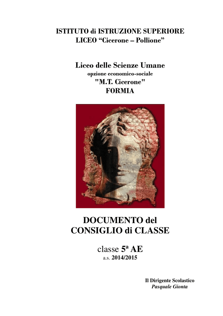 ISTITUTO di ISTRUZIONE SUPERIORE LICEO “Cicerone – Pollione” Liceo delle Scienze Umane opzione economico-sociale "M.T. Cicerone" FORMIA DOCUMENTO del CONSIGLIO di CLASSE classe 5a AE a.s. 2014/2015 Il Dirigente Scolastico Pasquale Gionta LICEO “CICERONE-POLLIONE” DOCUMENTO DEL CONSIGLIO DI CLASSE Anno scolastico 2014-2015 FORMIA Classe V sez. A Indirizzo Scienze Umane opz. Economico Sociale DOCUMENTO FINALE RELATIVO ALLE ATTIVITÀ EDUCATIVO-DIDATTICHE SVOLTE NELLA CLASSE VAE NELL'ANNO SCOLASTICO 2014-15 - Viste la legge del 11 gennaio 2007, n. 1; - visto il D.M. n. 5 del 15 gennaio 2010; - viste la C.M. n. 11 del 9 febbraio 2010; - visti i D.P.R. n. 323 del 23 luglio 1998, n. 356/98, 357/98 e 358/98; - vista la Programmazione educativo - didattica del Consiglio di Classe della V sez. A, indirizzo Scienze Umane, opz.economico-sociale, per l'anno scolastico 2014/2015; - visti i piani di lavoro formulati per l'anno scolastico 2014/2015 dai Docenti membri del Consiglio di Classe per le singole discipline previste dal piano di studi; - viste le attività educativo - didattico programmate dal Collegio dei Docenti di questo Liceo per l'anno scolastico 2014/2015; - vista il D. M. n. 39 del 29 gennaio 2015; - viste le attività curricolari ed extracurricolari effettivamente svolte dalla classe V sez. AE nell'anno scolastico 2014/2015; tenuto conto dei risultati conseguiti negli scrutini finali degli anni scolastici 2012/2013 e 2013/2014, nella riunione del 14 maggio 2015, il Consiglio di Classe all'unanimità DELIBERA di redigere il documento finale relativo alle attività educativo - didattiche svolte dalla classe Quinta, sez. AE, nell'anno scolastico 2014/2015, nella formula che di seguito si trascrive. 2/72 LICEO DOCUMENTO DEL CONSIGLIO DI CLASSE “CICERONE-POLLIONE” Anno scolastico 2014-2015 FORMIA Classe V sez. A Indirizzo Scienze Umane opz. Economico Sociale INDICE 1. CENNI STORICI SUL LICEO CICERONE-POLLIONE Pag. 4 2. FINALITA’ DELL’ISTITUTO E DELL’INDIRIZZO: ◊ Finalità educative quali obiettivi comportamentali ◊ Obiettivi generali dell’indirizzo Pag. 5 3. PRESENTAZIONE DELLA CLASSE ◊ Elenco alunni ◊ Elenco docenti con quadro indicativo della continuità nel corso del quinquennio e prospetto firme ◊ Relazione di presentazione della classe Pag. 8 4. PERCORSO FORMATIVO REALIZZATO SULLA BASE DELLA Pag. 12 PROGETTAZIONE COLLEGIALE: ◊ ◊ ◊ ◊ ◊ ◊ Piano degli studi del Liceo delle Scienze Umane, opzione economico-sociale Valutazione Criteri di attribuzione del credito scolastico Criteri di attribuzione del credito formativo Attività di recupero Attività extracirriculari, complementari ed integrative 5. ATTIVITA’ DISCIPLINARE E PROGRAMMI ◊ RELIGIONE ◊ ITALIANO ◊ STORIA ◊ FILOSOFIA ◊ INGLESE ◊ FRANCESE ◊ MATEMATICA ◊ FISICA ◊ STORIA DELL’ARTE ◊ SCIENZE MOTORIE E SPORTIVE ◊ SCIENZE UMANE ◊ DIRITTO ED ECONOMIA Pag. 18 . . 6. SCHEDE DI VALUTAZIONE (1^/2^/3^prova scritta, colloquio, griglia di corrispondenza tra voti in decimi, quindicesimi, trentesimi) Pag. 56 7. SIMULAZIONI DI TERZA PROVA Pag. 64 3/72 LICEO DOCUMENTO DEL CONSIGLIO DI CLASSE “CICERONE-POLLIONE” Anno scolastico 2014-2015 FORMIA Classe V sez. A Indirizzo Scienze Umane opz. Economico Sociale 1 Cenni storici sull’Istituzione Scolastica. A partire dal 1° settembre 2014, per effetto del D.D.G. n. 1/2013 che recepisce il D.G.R. n. 506 del 30.12.2013 della Regione Lazio avente per oggetto il Piano Regionale di Dimensionamento delle Istituzioni Scolastiche - Anno scolastico 2014/2015, è stato istituito a Formia l'Istituto di Istruzione Superiore Liceo "M. T. Cicerone - Pollione" mediante l'unificazione del Liceo Classico "Vitruvio Pollione" e del Liceo Linguistico e delle Scienze Umane "M. T. Cicerone". Il Liceo "M. T. Cicerone" di Formia è uno degli istituti superiori più antichi della città, ubicato in via Olivetani 24. Ha ottenuto la parifica con D.M. del 14.06.1947 e, successivamente, la statizzazione a partire dal 1.10.1961. All'inizio degli anni '90 l'Istituto comprendeva una popolazione scolastica di circa 500 allievi che nell'ultimo decennio è notevolmente aumentata. Nell'a.s. 1992-1993 furono introdotti due nuovi indirizzi: l'Indirizzo Pedagogico-Sociale e l'Indirizzo Linguistico, entrambi quinquennali, interessati dalla sperimentazione prevista dalla C.M. n. 27 dell'11.02.91. Essi affiancarono l'indirizzo tradizionale, un corso di studi quadriennale con la possibilità di frequentare un anno integrativo, che aderiva al Piano Nazionale di Informatica. Nell'a.s. 1998-1999 l'indirizzo tradizionale è stato abrogato ed è stato introdotto il nuovo e più moderno Indirizzo Sociale, di tipo quinquennale. Nell'a.s. 1999-2000 è entrato in vigore l'Indirizzo autonomo Pedagogico, in sostituzione dell'Indirizzo Pedagogico-Sociale (C.M. 27/91) che veniva comunque sostanzialmente richiamato, il quale prevedeva un'organizzazione con 30 ore settimanali con due di compresenza, in sostituzione delle precedenti 35 ore. Dall'a.s. 2010-2011 per effetto del D.P.R. 15 marzo 2010, n. 89 (Regolamento recante revisione dell'assetto ordinamentale, organizzativo e didattico dei licei a norma dell'articolo 64, comma 4, del decreto-legge 25 giugno 2008, n. 112, convertito, con modificazioni, dalla legge 6 agosto 2008, n. 133) la denominazione dell'istituto è mutata da "Istituto Magistrale" a "Liceo Linguistico-Liceo delle Scienze Umane - Liceo delle Scienze Umane con opzione economico sociale". Il continuo rinnovamento delle esigenze culturali e organizzative della comunità scolastica ha richiesto una didattica flessibile in relazione agli obiettivi formativi ed alle 4/72 LICEO DOCUMENTO DEL CONSIGLIO DI CLASSE “CICERONE-POLLIONE” Anno scolastico 2014-2015 FORMIA Classe V sez. A Indirizzo Scienze Umane opz. Economico Sociale esigenze dell'utenza; si è pertanto ritenuto opportuno introdurre anche percorsi di accesso e sostegno destinati agli studenti stranieri. Il Liceo "
