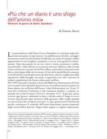 «Più che un diario è uno sfogo dell’animo mio» Memorie di guerra di Dante Guarducci di Simona Stacca L a memorialistica sulla Prima Guerra Mondiale si è arricchita negli ultimi decenni grazie al reperimento e la pubblicazione di diari, carteggi e documenti conservati dai familiari di ufficiali, ma anche di semplici soldati appartenenti al ceto borghese o popolare e con un certo grado di scolarizzazione. Ogni documento ha un suo valore e merita attenzione e studio. In particolare, i diari offrono un’occasione unica per riflettere sulla Grande Guerra attraverso i racconti di chi l’ha sofferta, provando la tremenda usura fisica e psicologica della vita in trincea. Si ha così la possibilità di conoscere in modo diretto vicende già narrate da altre fonti, come lo svolgimento delle operazioni e delle battaglie, ma anche e soprattutto vita, idee e pensieri di soldati e popolazioni che hanno subito quel conflitto. Nel 1999 Giancarlo Guarducci donò alla Biblioteca Roncioniana di Prato otto taccuini scritti dal padre durante la sua vita militare trascorsa prima sul fronte alpino, poi sul fronte dell’Isonzo. I diari di dimensioni cm. 10 per 15 sono ben conservati, l’inchiostro è solo raramente sbiadito, e coprono un periodo che va dal 10 marzo 1916 al 1 settembre 19171. Il giovane autore scriveva ogni giorno, indicando la data e talvolta anche il luogo in cui si trovava, descrivendo ogni momento della giornata, dalla sveglia quando era ancora buio fino al riposo notturno. Le date garantiscono l’autenticità perché consentono il controllo dell’esatta dimensione spazio-temporale degli eventi bellici descritti. Pagina dopo pagina si colgono impressioni, Simona Stacca, laureata magistrale in Scienze dell’Economia, cultrice di storia economica e sociale. 1 Biblioteca Roncioniana di Prato (da ora in poi B.R.Po), Manoscritti Roncioniani, 1196, Diari di guerra di Dante Guarducci: 1. Brevi cenni della mia vita militare, 10 marzo 1916 – 20 maggio 1916; 2. Ricordo dei ricordi, 21 maggio 1916 – 7 luglio 1916; 3. Diario, 8 luglio 1916 – 31 agosto 1916; 4. Diario, 31 agosto 1916 – 21 ottobre 1916; 5. Diario, 22 ottobre 1916 – 26 novembre 1916; 6. Diario, 28 novembre 1916 – 9 febbraio 1917; 7. Diario, 10 febbraio 1917 – 26 marzo 1917; 8. Diario, 25 maggio 1917 – 1 settembre 1917. 22 «Più che un diario è uno sfogo dell’animo mio» di Simona Stacca sentimenti, immagini, emozioni di come un giovane soldato visse i ritmi della guerra. Lo stile è chiaro, scorrevole e di facile lettura, segnato dalle interruzioni delle singole date, da molti pensieri, ricordi, descrizioni di paesaggi e della vita di Compagnia. Ogni giorno segnava una maturazione e una crescita umana, nella ricerca di uno stile di vita migliore, pur tra i rumori e le incertezze della guerra. Dante nacque il 6 gennaio 1887 alle 10 del mattino in una casa posta in via Palazzuolo (poi via Giuseppe Mazzini) al numero 294 da Veturia Vannucchi, attendente a casa, moglie di Donatello Donato Guarducci, negoziante2, della parrocchia di S. Maria delle Carceri. Fu battezzato in Cattedrale il 9 2 http://antenati.san.beniculturali.it/v/Archivio+di+Stato+di+Prato/Stato+civile+italiano/ Prato/Nati/1887/223+Parte+1/005121639_00912.jpg.html 23 gennaio 1887 con il nome Dante Luigi Maria3. Esaminando gli Stati d’anime della parrocchia del 1888, nella casa di famiglia di via Palazzuolo troviamo il piccolo Dante insieme ai genitori e alle sorelle maggiori, Bianca di sei anni e Brunetta di due4. Purtroppo non abbiamo notizie della sua adolescenza e degli studi fatti, possiamo solo dire che il giovane pratese, nel febbraio del 1905, fu iscritto nelle liste di leva della classe 1887 al numero d’ordine 286; dallo stesso documento risulta anche che Dante lavorava affiancando il padre, infatti leggiamo “condizione dell’inscritto: negoziante”5. Compì il servizio di leva a 20 anni, arruolandosi l’8 maggio 1907 nei Militari di Terza Categoria6. Il 26 ottobre 1912 sposò Ida Morelli7, figlia di Vittorio Morelli ed Elvira Nardi. Negli Stati d’anime di S. Maria delle Carceri del 1913 i giovani sposi risultavano conviventi con la famiglia di origine di Dante; Ida dichiarava come suo nome Adelaide e come età 22 anni8. Il loro primogenito, Gino, nacque il 22 luglio 1913. Scoppiata la guerra, Dante, nonostante fosse un cattolico convinto, si comportò da interventista, perché così volevano la sua giovane età e l’indirizzo morale della sua generazione. L’Italia giolittiana era in preda alle polemiche tra neutralisti e interventisti. Da una parte, i neutralisti sostenevano che il popolo italiano era poco incline alla vita militare, che aveva un esercito 3 Archivio Storico Diocesano di Prato (da ora in poi A.S.D.Po), Archivio del Capitolo, 2335, battesimi dal 20 aprile 1884 al 10 maggio 1887. 4 A.S.D.Po, Parrocchia di S. Maria delle Carceri, Stati d’Anime 17, numero comunitativo 294, parrocchiale 183, famiglia 390. 5 Archivio Generale del Comune di Prato (da ora in poi A.C.Po), Carteggio della leva militare, 24, fasc. 6, Elenco dei Giovani Inscritti nella lista di leva della classe dei nati nell’anno 1887. 6 A.C.Po, Ruoli matricolari, Ruolo matricolare dei Militari della Terza Categoria Classe 1887. 7 http://antenati.san.beniculturali.it/v/Archivio+di+Stato+di+Prato/Stato+civile+italiano/ Prato/Nati/1886/218+Parte+3/005121638_02852.jpg.html 8 A.S.D.Po, Parrocchia di S. Maria delle Carceri, Stati d’Anime 21 (1909-1914). 24 Annotazione personale su un ritaglio di giornale «Più che un diario è uno sfogo dell’animo mio» di Simona Stacca Materiale sanitario, collezione privata, nella recente mostra La Croce Rossa per i prigionieri di guerra pratesi mal preparato e che esistevano troppi contrasti civili. D’altra parte gli interventisti, che godevano dell’appoggio di giornali prestigiosi, pensavano che se l’Italia avesse scelto la neutralità, avrebbe rischiato di non esistere più. “Meglio vinti che neutrali