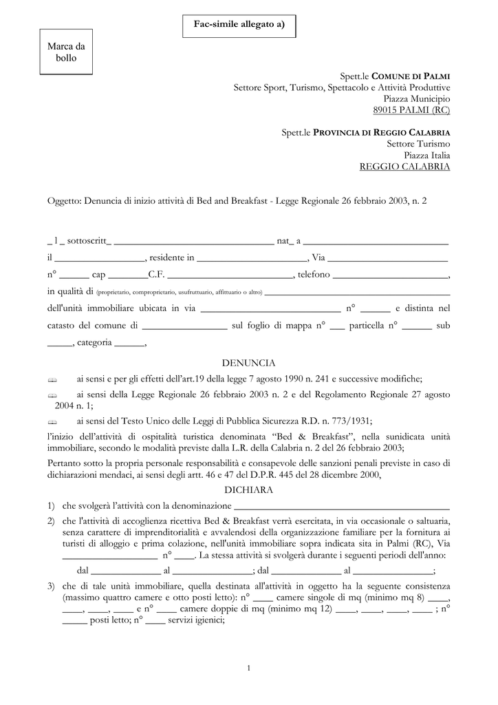 Fac-simile allegato a) Marca da bollo Spett.le COMUNE DI PALMI Settore Sport, Turismo, Spettacolo e Attività Produttive Piazza Municipio 89015 PALMI (RC) Spett.le PROVINCIA DI REGGIO CALABRIA Settore Turismo Piazza Italia REGGIO CALABRIA Oggetto: Denuncia di inizio attività di Bed and Breakfast - Legge Regionale 26 febbraio 2003, n. 2 _ l _ sottoscritt_ ________________________________ nat_ a _____________________________ il __________________, residente in ______________________, Via ________________________ n° ______ cap ________C.F. _________________________, telefono _______________________, in qualità di (proprietario, comproprietario, usufruttuario, affittuario o altro) _____________________________________ dell'unità immobiliare ubicata in via ____________________________ n° ______ e distinta nel catasto del comune di _________________ sul foglio di mappa n° ___ particella n° ______ sub _____, categoria ______, DENUNCIA ai sensi e per gli effetti dell’art.19 della legge 7 agosto 1990 n. 241 e successive modifiche; ai sensi della Legge Regionale 26 febbraio 2003 n. 2 e del Regolamento Regionale 27 agosto 2004 n. 1; ai sensi del Testo Unico delle Leggi di Pubblica Sicurezza R.D. n. 773/1931; l’inizio dell’attività di ospitalità turistica denominata “Bed & Breakfast”, nella sunidicata unità immobiliare, secondo le modalità previste dalla L.R. della Calabria n. 2 del 26 febbraio 2003; Pertanto sotto la propria personale responsabilità e consapevole delle sanzioni penali previste in caso di dichiarazioni mendaci, ai sensi degli artt. 46 e 47 del D.P.R. 445 del 28 dicembre 2000, DICHIARA 1) che svolgerà l’attività con la denominazione ___________________________________________ 2) che l'attività di accoglienza ricettiva Bed & Breakfast verrà esercitata, in via occasionale o saltuaria, senza carattere di imprenditorialità e avvalendosi della organizzazione familiare per la fornitura ai turisti di alloggio e prima colazione, nell'unità immobiliare sopra indicata sita in Palmi (RC), Via ___________________ n° ____. La stessa attività si svolgerà durante i seguenti periodi dell'anno: dal ______________ al ________________; dal ______________ al ________________; 3) che di tale unità immobiliare, quella destinata all'attività in oggetto ha la seguente consistenza (massimo quattro camere e otto posti letto): n° ____ camere singole di mq (minimo mq 8) ____, ____, ____, ____ e n° ____ camere doppie di mq (minimo mq 12) ____, ____, ____, ____ ; n° _____ posti letto; n° ____ servizi igienici; 1 4) che i locali destinati all’esercizio dell’attività di Bed & Breakfast possiedono le caratteristiche strutturali ed igienico – sanitarie previste dal Regolamento Edilizio del Comune di Palmi per i locali di civile abitazione e sono in regola dal punto di vista edilizio - urbanistico; 5) che il servizio ai turisti comprende, oltre ad alloggio e prima colazione, quest'ultima assicurata prevalentemente con cibi e bevande provenienti da produzioni calabresi, anche: - fornitura e cambio della biancheria compresa quella da bagno due volte la settimana e al cambio del cliente; - un servizio bagno autonomo rispetto alle esigenze della famiglia, con un rapporto non inferiore a quattro posti letto per ogni bagno; - la pulizia quotidiana dei locali; - la fornitura di energia elettrica, acqua calda e fredda e riscaldamento; 6) che le tariffe che si intendono praticare sono le seguenti: minime: € __________________________ massime: € _________________________ 7) che la permanenza degli ospiti non si protrarrà oltre i 60 giorni consecutivi; 8) che gli appartamenti per il servizio di alloggio sono stabilmente utilizzati dal sottoscritto o dagli altri soggetti del proprio nucleo familiare 9) che sussistono i requisiti soggettivi previsti dagli artt. 11 e 92 del T.U.P.S., approvato con R.D.L. del 18 giugno 1931 n° 773 e cioè: - di non avere riportato condanne a pene restrittive della libertà personale superiore ai tre anni per delitto non colposo e di non aver ottenuto la riabilitazione; - di non essere sottoposto a sorveglianza speciale o a misure di sicurezza personale o di non essere stato dichiarato delinquente abituale, professionale o per tendenza; - di non aver riportato condanne per delitti contro la personalità dello Stato o contro l’ordine pubblico, ovvero per delitti contro le persone commessi con violenza, o per furto, rapina o estorsione, sequestro di persona a scopo di rapina o di estorsione, o per violenza o resistenza all’autorità, o a chi non può provare la sua buona condotta; - di non essere stato condannato per reati contro la moralità pubblica e il buon costume, o contro la sanità pubblica o per giochi d’azzardo, o per delitti commessi in stato di ubriachezza o per contravvenzioni concernenti la prevenzione dell’alcolismo, o per infrazioni alla legge sul lotto, o per abuso di sostanze stupefacenti; 10) che non sussistono nei propri confronti “cause di divieto, di decadenza o di sospensione di cui all’art. 10 della legge 31 maggio 1965 n. 575” (antimafia); 11) di essere consapevole: - di essere tenuto a comunicare al Comune e alla Provincia l’inizio effettivo dell’attività; - che l’attività ha carattere saltuario e non continuativo e che pertanto dovrà essere interrotta per almeno 60 giorni nel corso dell’anno, anche frazionati; - di dover comunicare al Comune e alla Provincia, almeno semestralmente, su apposito modello ISTAT, il movimento degli ospiti ai fini della rilevazione statistica; - di dover comunicare al Comune e alla Provincia, entro il 30 settembre di ogni anno, per il periodo di apertura dell'attività, i prezzi minimi e massimi con validità dal 1° gennaio dell'anno successivo; - di dover esporre all'interno della struttura copia delle tariffe e all’esterno dell’ingresso principale il marchio B&B con l’indicazione della categoria attribuita; - che la mancata comunicazione delle tariffe entro il ter