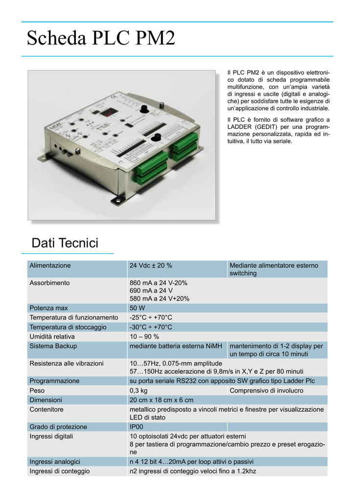 Scheda PLC PM2 Il PLC PM2 è un dispositivo elettronico dotato di scheda programmabile multifunzione, con un’ampia varietà di ingressi e uscite (digitali e analogiche) per soddisfare tutte le esigenze di un’applicazione di controllo industriale. Il PLC è fornito di software grafico a LADDER (GEDIT) per una programmazione personalizzata, rapida ed intuitiva, il tutto via seriale. Dati Tecnici Alimentazione 24 Vdc ± 20 % Assorbimento 860 mA a 24 V-20% 690 mA a 24 V 580 mA a 24 V+20% 50 W -25°C ÷ +70°C -30°C ÷ +70°C 10 – 90 % mediante batteria esterna NiMH Potenza max Temperatura di funzionamento Temperatura di stoccaggio Umidità relativa Sistema Backup Resistenza alle vibrazioni Programmazione Peso Dimensioni Contenitore Grado di protezione Ingressi digitali Ingressi analogici Ingressi di conteggio Mediante alimentatore esterno switching mantenimento di 1-2 display per un tempo di circa 10 minuti 10…57Hz, 0.075-mm amplitude 57…150Hz accelerazione di 9,8m/s in X,Y e Z per 80 minuti su porta seriale RS232 con apposito SW grafico tipo Ladder Plc 0,3 kg Comprensivo di involucro 20 cm x 18 cm x 6 cm metallico predisposto a vincoli metrici e finestre per visualizzazione LED di stato IP00 10 optoisolati 24vdc per attuatori esterni 8 per tastiera di programmazione/cambio prezzo e preset erogazione n 4 12 bit 4…20mA per loop attivi o passivi n2 ingressi di conteggio veloci fino a 1.2khz Uscite digitali 10 uscite statiche alimentate separatamente - Tensione di alimentazione delle uscite: 14÷33 Vdc - Corrente di alimentazione massima delle uscite: 6 A - Corrente massima per uscita: 0,5 A protetta contro il cortocircuito Porte di comunicazione Porta seriale RS-485 Porte seriale RS232 Fibra Ottica n1 per il collegamento dei displays n1 per la programmazione n2 per la comunicazione con sistemi Host o convertitori di protocollo Sezione display (opzionale - max. 4) Tipo display LCD a tre linee con caratteri di altezza di 30mm Comunicazione RS485 multidrop con indirizzo programmabile mediante dip switch Tensione di alimentazione 24vdc +/- 10% Massimo assorbimento 190 mA con retroilluminazione Temperatura di funzionamento -25…+70 °C Temperatura di stoccaggio -30….+70°C Contatore elettromeccanico a 7 digit con controllo di funzionamento Retro illuminazione mediante diodi Led di colorazione arancio ambra Numero visori n1 per importo totale 9999,99 n1 per quantità erogata 999,99 n1 per importo unitario 999,99 Graf S.p.A. Italy - Via Galileo Galilei 32/36 - 41015 Nonantola (MO) tel. 059545111 - fax 059544120 - www.grafspa.it - [email protected]