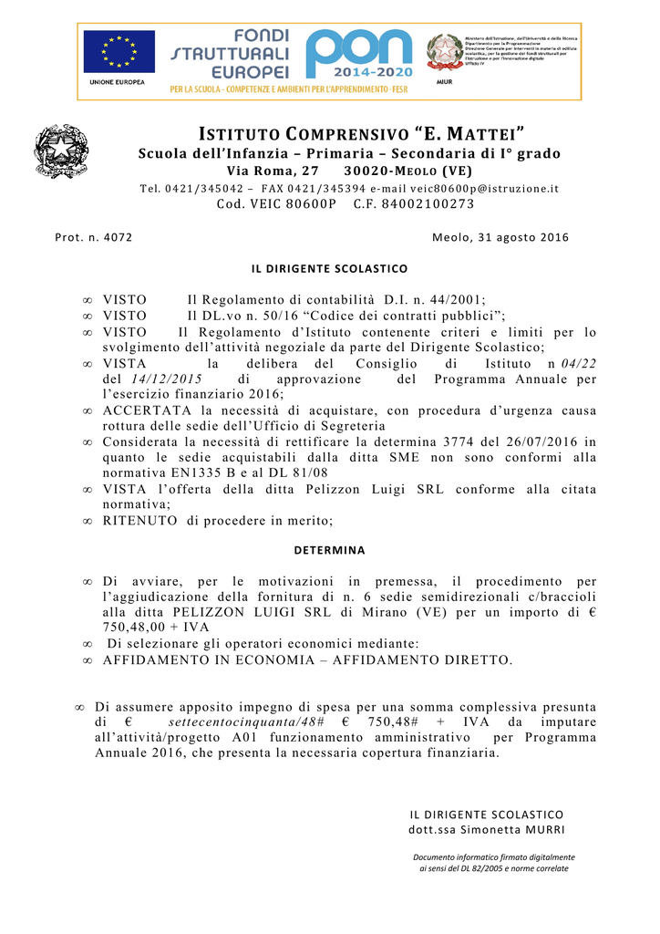 I STITUTO C OMPRENSIVO “E. M ATTEI ” Scuola dell’Infanzia – Primaria – Secondaria di I° grado Via Roma, 27 30020 E O L O (VE) 30020-M T el . 0 42 1/ 3 45 04 2 – F A X 0 42 1/ 3 45 39 4 e- ma i l v ei c 80 60 0 p @is t ruz io n e. it Cod. VEIC 80600P C.F. 84002100273 Prot. n. 4072 Meolo, 31 agosto 2016 IL DIRIGENTE SCOLASTICO • • • • • • • • VISTO Il Regolamento di contabilità D. I. n. 44/2001; VISTO Il DL.vo n. 50/16 “Codice dei contratti pubblici”; pubblici VISTO Il Regolamento d’Istituto contenente criteri e limiti per lo svolgimento dell’attività negoziale da parte del Dirigente Scolastico; VISTA la delibera del Consiglio di Istituto n 04/22 del 14/12/2015 di approvazione del Programma rogramma Annuale per l’esercizio finanziario 2016; 201 ACCERTATA la necessità necessit di acquistare, con procedura d’urgenza caus a rottura delle sedie dell’Ufficio di Segreteria Considerata la necessità di rettificare la determina 3774 del 26/07/2016 in quanto le sedie acquistabili dalla ditta SME non sono conformi alla normativa EN1335 B e al DL 81/08 VISTA l’offerta della ditta Pelizzon Luigi SRL conforme alla citat a normativa; RITENUTO di procedere in merito; DETERMINA • • • • Di avviare, per le motivazioni in premessa, il procedimento per l’aggiudicazione della fornitura di n. 6 sedie semidirezionali c/braccioli alla ditta PELIZZON LUIGI SRL di Mirano (VE) per un importo di € 750,48,00 + IVA Di selezionare gli operatori economici mediante: AFFIDAMENTO IN ECONOM IA – AFFIDAMENTO DIRETTO. DIRETTO Di assumere apposito impegno di spesa per una somma complessiva presunta di € settecentocinquanta settecentocinquanta/48# € 750,48# + IVA da imputare all’attività/progetto A01 funzionamento amministrativo per Programma Annuale 2016,, che presenta la necessaria copertura finanziaria. IL DIRIGENTE SCOLAST ICO dott.ssa Simonetta M URRI Documento informatico firmato digitalmente ai sensi del DL 82/2005 e norme correlate
