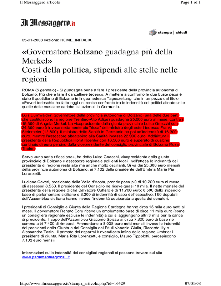 Il Messaggero articolo Page 1 of 1 stampa | chiudi 05-01-2008 sezione: HOME_INITALIA «Governatore Bolzano guadagna più della Merkel» Costi della politica, stipendi alle stelle nelle regioni ROMA (5 gennaio) - Si guadagna bene a fare il presidente della provincia autonoma di Bolzano. Più che a fare il cancelliere tedesco. A mettere a confronto le due buste paga è stato il quotidiano di Bolzano in lingua tedesca Tageszeitung, che in un pezzo dal titolo «Poveri tedeschi» ha fatto oggi un ironico confronto tra le indennità dei politici altoatesini e quelle delle massime cariche istituzionali in Germania. Luis Durnwalder, governatore della provincia autonoma di Bolzano (una delle due parti che costituiscono la regione Trentino-Alto Adige) guadagna 25.600 euro al mese, contro i 19.300 di Angela Merkel. La vicepresidente della giunta provinciale Luisa Gnecchi con 24.300 euro è invece nettamente più "ricca" del ministro degli esteri tedesco Frank Steinmeier (12.800). Il ministro della Sanità in Germania ha poi un'indennità di 16.300 euro, mentre l'assessore altoatesino alla Sanità incassa 22.900 euro. Addirittura il presidente della Repubblica Horst Koehler con 16.583 euro è superato di qualche centinaio di euro persino dalla vicepresidente del consiglio provinciale di Bolzano Rosa Thaler. Serve «una seria riflessione», ha detto Luisa Gnecchi, vicepresidente della giunta provinciale di Bolzano e assessore regionale agli enti locali. nell'attesa le indennità dei presidente di regione resta alte ma anche molto oscillanti. Si va dai 25.600 euro mensili della provincia autonoma di Bolzano, ai 7.102 della presidente dell'Umbria Maria Pia Lorenzetti. Luciano Caveri, presidente della Valle d'Aosta, prende poco più di 10.200 euro al mese, gli assessori 8.558. Il presidente del Consiglio ne riceve quasi 10 mila. Il netto mensile del presidente della regione Sicilia Salvatore Cuffaro è di 11.700 euro: 8.500 dello stipendio base di parlamentare siciliano e 3.200 di indennità di capo dell'esecutivo. I 90 deputati dell'Assemblea siciliana hanno invece l'indennità equiparata a quella dei senatori. I presidenti di Consiglio e Giunta della Regione Sardegna hanno circa 15 mila euro netti al mese. Il governatore Renato Soru riceve un emolumento base di circa 11 mila euro (come un consigliere regionale escluse le indennità) a cui si aggiungono altri 3 mila per la carica di presidente. Il capo dell'Assemblea Giacomo Spissu ai circa 7.300 euro di base ne somma altri 7.400 di rimborsi. Ammontano a 8.038 euro netti mensili invece le indennità dei presidenti della Giunta e del Consiglio del Friuli Venezia Giulia, Riccardo Illy e Alessandro Tesini. Il primato dei risparmi è rivendicato infine dalla regione Umbria: i presidenti di giunta, Maria Rita Lorenzetti, e consiglio, Mauro Tippolotti, percepiscono 7.102 euro mensili. Informazioni sulle indennità dei consiglieri regionali si possono trovare sul sito www.parlamentiregionali.it http://www.ilmessaggero.it/stampa_articolo.php?id=16429 07/01/08