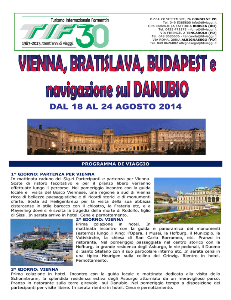 P.ZZA XX SETTEMBRE, 26 CONSELVE PD Tel. 049 5385800 [email protected] C.to Comm.le LA FATTORIA BORSEA (RO) Tel. 0425 471172 [email protected] VIA FIRENZE, 2 TENCAROLA (PD) Tel. 049 8685636 - [email protected] VIA ROMA, 208/A ALBIGNASEGO (PD) Tel. 049 8626882 [email protected] DAL 18 AL 24 AGOSTO 2014 PROGRAMMA DI VIAGGIO 1° GIORNO: PARTENZA PER VIENNA In mattinata raduno dei Sig.ri Partecipanti e partenza per Vienna. Soste di ristoro facoltativo e per il pranzo libero verranno effettuate lungo il percorso. Nel pomeriggio incontro con la guida locale e visita del Bosco Viennese, una regione a sud di Vienna ricca di bellezze paesaggistiche e di ricordi storici e di monumenti d’arte. Sosta ad Heiligenkreuz per la visita della sua abbazia cistercense in stile barocco con il chiostro, la Frateria etc, e a Mayerling dove si è svolta la tragedia della morte di Rodolfo, figlio di Sissi. In serata arrivo in hotel. Cena e pernottamento. 2° GIORNO: VIENNA Prima colazione in hotel. In mattinata incontro con la guida e panoramica dei monumenti (esterno) lungo il Ring: l’Opera, I Musei, la Hofburg, il Municipio, la Votivkirche, la chiesa di San Carlo Borromeo, etc. Pranzo in ristorante. Nel pomeriggio passeggiata nel centro storico con la Hofburg, la grande residenza degli Asburgo, le vie pedonali, il Duomo di Santo Stefano con il suo particolare interno etc. In serata cena in una tipica Heurigen sulla collina del Grinzig. Rientro in hotel. Pernottamento. 3° GIORNO: VIENNA Prima colazione in hotel. Incontro con la guida locale e mattinata dedicata alla visita dello Schonnbrunn, la splendida residenza estiva degli Asburgo attorniata da un meraviglioso parco. Pranzo in ristorante sulla torre girevole sul Danubio. Nel pomeriggio tempo a disposizione dei partecipanti per visite libere. In serata rientro in hotel. Cena e pernottamento. 4° GIORNO: VIENNA – BRATISLAVA – navigazione – BUDAPEST Prima colazione in hotel. In mattinata imbarco sul battello veloce che navigando sul Danubio vi porterà in circa un’ora e mezza a Bratislava. Arrivo a Bratislava (Repubblica Slovacca), incontro con la guida locale e visita della città. Pranzo in ristorante. Nel pomeriggio si raggiungerà Budapest, la capitale Ungherese, nata nel 1873 dall’unione delle città di Buda, Obuda e Pest. Incontro con la guida e visita di Pest: il quartiere neogotico, barocco e liberty della città, toccando viale Andrassy, patrimonio dell’Umanità, la scenografica Piazza degli Eroi, gli esterni della basilica di Santo Stefano e il Parlamento. Sistemazione in hotel. Cena e pernottamento 5° GIORNO: BUDAPEST – Escursione ANSA DEL DANUBIO Prima colazione in hotel. Intera giornata dedicata all’ escursione all’Ansa del Danubio in vista delle belle località che si affacciano sul fiume: Szetendre la città delle arti, Visegrad, antica sede reale da dove si apre un meraviglioso panorama sulla Valle del Danubio. Pranzo in ristorante. In serata cena caratteristica con spettacolo folcloristico in ristorante. Pernottamento in hotel. 6° GIORNO: BUDAPEST – Escursione nella PUSTZA Prima colazione in hotel. In mattinata escursione nella Putsza, la grande pianura ungherese e partenza per la Valle di Domonyvolgy dove assisteremo ad uno spettacolo equestre in un tipico villaggio di mandriani. Pranzo in ristorante. Nel pomeriggio rientro a Budapest dove continua la visita guidata con Buda la città vecchia medioevale sulla collina. Si visiterà la chiesa di re Mattia, l’edificio sacro piu’ importante della città, il panoramico bastione dei Pescatori, la piazza della Santissima Trinità, l’esterno del Palazzo Reale e la Cittadella. Rientro in hotel per la cena e il pernottamento. 7° GIORNO: BUDAPEST - rientro Prima colazione in hotel. Partenza per Maribor dove si arriverà per il pranzo in ristorante. Partenza per il rientro. Soste lungo il percorso. Arrivo a destinazione in serata. FINE DEL VIAGGIO E DEI SERVIZI Nota bene: per un miglior svolgimento la direzione si riserva di invertire l’ordine delle visite pur mantenendo inalterata la sostanza delle visite stesse. QUOTA DI PARTECIPAZIONE SUPPLEMENTO CAMERA SINGOLA Riduzione bambini fino a 12 anni n.c. in 3° letto € 850,00 € 180,00 € 680,00 Il viaggio verrà confermato al raggiungimento di 25 adesioni LA QUOTA COMPRENDE: • Viaggio in pullman G.T. dotato di ogni confort • Pedaggi autostradali, vitto e alloggio dell’autista • Sistemazione in hotel 4 stelle in camere doppie con bagno • Trattamento di pensione completa dalla cena del primo giorno al pranzo dell’ultimo giorno • Navigazione da Vienna a Bratislava • Le guide locali per tutte le visite indicate nel programma • Assicurazione medica Elvia Assistance • Accompagnatore specializzato TIF Viaggi per tutta la durata del viaggio LA QUOTA NON COMPRENDE: • Gli ingressi a monumenti o musei • Le bevande ai pasti • L’assicurazione facoltativa annullamento al viaggio da richiedere al momento della prenotazione. Il costo è pari al 5% del costo complessivo del viaggio • Le mance, gli extra di carattere personale e quanto non espressamente indicato alla voce “La quota comprende” MONUMENTI E MUSEI Il costo degli ingressi (non compreso nella quota) è di circa € 45,00 per persona e comprende a Vienna: Castello di Schonnbrunn, Cripta dei Cappuccini; Mayerling Palazzina; a Budapest: Chiesa di Mattia, Bastione dei Pescatori, Chiesa di Santo Stefano, Palazzo Rinascimentale di Re Mattia, Chiesa di Szetendre. Tariffa soggetta a riconferma. DOCUMENTI Carta d’identità in corso di validità. I minorenni devono avere il proprio passaporto PARTENZE PREVISTE BRUSEGANA - Fermata Pollicino / ALBIGNASEGO – P.le Donatore / CONSELVE - Agenzia Viaggi TIF / ROVIGO Hotel Cristallo Gli orari di partenza verranno comunicati con i documenti di viaggio. PRENOTAZIONI PRENOTAZIONI FINO AD ESAURIMENTO DEI POSTI DISPONIBILI PRESSO LE SUDDETTE AGENZIE. SI CONSIGLIA LA PRENOTAZIONE CON LARGO ANTICIPO. Acconto di 