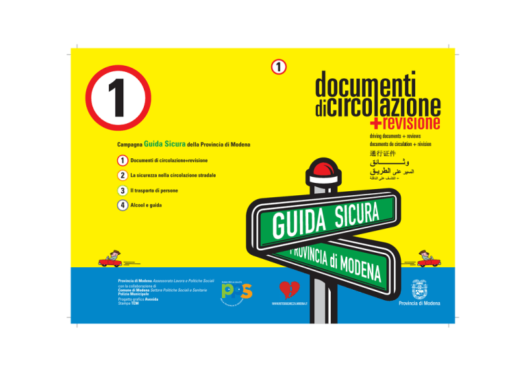 driving documents + reviews documents de circulation + révision Campagna Guida Sicura della Provincia di Modena Documenti di circolazione+revisione La sicurezza nella circolazione stradale Il trasporto di persone Alcool e guida Provincia di Modena Assessorato Lavoro e Politiche Sociali con la collaborazione di Comune di Modena Settore Politiche Sociali e Sanitarie Polizia Municipale Progetto grafico Avenida Stampa TEM WWW.RETEDISICUREZZA.MODENA.IT Provincia di Modena I DOCUMENTI CHE BISOGNA AVERE COSA BISOGNA FARE • Patente • Certificato di Assicurazione • Carta d’identità o Passaporto Documento di Identità • Carta di Circolazione per le Auto Libretto Quando si è alla guida, bisogna sempre avere con sé questi documenti, in originale, non in fotocopia. A richiesta di un organo di Polizia, bisogna far vedere il documento. oppure • Certificato di idoneità tecnica per i ciclomotori Librettino ASSICURAZIONE • Le auto devono sempre essere assicurate, anche se vengono tenuti fermi per molto tempo. • Il contrassegno dell’assicurazione deve sempre essere esposto sul vetro davanti delle auto e non in altre parti. • Per le moto non è necessario esporlo, ma bisogna averlo sempre con sé. TARGHETTA CICLOMOTORI Contrassegno di identificazione • La targhetta deve essere sempre esposta • Deve essere sempre visibile: non coprirla con adesivi o altre cose. • Se si cambia residenza bisogna andare all’Ufficio Anagrafe del Comune della nuova residenza per comunicare i dati della targhetta. PATENTE A PUNTI PATENTE DI GUIDA STRANIERA RILASCIATA DA PAESI EXTRA UE Quando si è alla guida, bisogna sempre avere con sé: • il documento originale • una traduzione ufficiale in lingua italiana, che viene rilasciata dal Consolato in Italia del paese di origine. Dopo un anno dall’acquisizione della residenza in Italia bisogna prendere la patente italiana. PATENTE LIBRETTO • Se si cambia residenza bisogna andare all’Ufficio Anagrafe del Comune della nuova residenza per comunicare i dati della patente e dell’auto, se la si possiede. • Se si modifica l’auto (per esempio se si installa l’impianto a metano o un gancio di traino per roulotte), è necessario fare aggiornare il libretto. • Chi compra un’auto deve comunicarlo al PRA (Pubblico Registro Automobilistico) entro 60 giorni. Al momento del rilascio della patente viene attribuito un punteggio di 20 punti che subisce decurtazioni ad ogni violazione che preveda la sospensione della patente di guida e/o di una violazione tra le norme comportamentali che lo prevedano. L’indicazione del punteggio relativo ad ogni violazione deve risultare dal verbale di contestazione per un massimo di 15 punti, salvo siano state commesse violazioni che prevedano la sospensione o la revoca della patente di guida. revisione per auto, moto e ciclomotori: che cos’è e cosa si deve fare La revisione serve per controllare che i mezzi possano circolare in condizioni di sicurezza. La revisione si può fare presso: • Officine autorizzate • Uffico Provinciale del Dipartimento Trasporti Terrestri, a Modena in via Galileo Galilei, 204. Quando si deve fare la revisione delle auto: • Bisogna guardare sul libretto la data della prima immatricolazione. • La prima revisione va fatta dopo 4 anni dalla data di prima immatricolazione. • Successivamente, la revisione va fatta ogni 2 anni. Quando si deve fare la revisione delle moto e dei ciclomotori: • Questa data viene stabilita di anno in anno; per sapere cosa bisoga fare ci si può informare presso l’Uffico Provinciale del Dipartimento Trasporti Terrestri, a Modena in via Galileo Galilei, 204. DOCUMENTS WHICH MUST BE CARRIED AT ALL TIMES • • • • Driver’s license Proof of Insurance ID card or passport (Document of Identity) Driving card for car Logbook (Libretto) or • Certificate of qualification for moped Logbook (Librettino) WHAT NEEDS TO BE DONE When driving one should always carry these documents, the originals not photocopies. One must present these documents when asked to do so by a police officer. FOREIGN DRIVER’S LICENSE ISSUED BY NON-EU COUNTRIES When driving, one should always carry: • the original document; • an official Italian translation of the document, which is issued by the consulate of the country of origin in Italy. One year after obtaining residence in Italy, one is required to get an Italian driver’s license. LICENSE LOGBOOK • If changing residence, one must go to the local Registration office of the new residence to update the information on the driver’s license and car (if one is owned). • If the car is modified (i.e. installation of a methane system or trailer attachment), the logbook should be updated. • When buying a car, one should inform the PRA (Public Automobile Registrar) within 60 days. INSURANCE • Cars must always be insured, even if parked for a long period of time. • The Insurance card must always be displayed in the front windshield, it is not valid anywhere else. • For moped and motorcycle owners it is not necessary to display the insurance card, however it must always be carried. MOTORCYCLE LICENSE PLATES Identification card • The license plate must always be displayed. • It must always be visible, it must not be covered by adhesives or anything else. • If changing residence, one must go to the local Community Registration Office of the new residence to register the license plate numbers. DRIVER’S LICENSE POINTS When the driver’s license is issued 20 points are provided. With each violation points are taken away, which can result in the suspension of the driver’s license and/or in a violation of the driving code. The amount of points taken for each offense must be shown in the notification report up to a maximum of 15 points, unless the violations committed require the suspension or revocation of the driver’s license. reviews of cars, mopeds and motorcycles: what it is, and what must be done Reviews ar