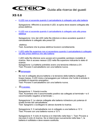 Guida alla ricerca dei guasti XS 0.8 • Il LED non si accende quando il caricabatterie è collegato solo alla batteria Spiegazione: Affinché si accenda il LED, la spina deve essere collegata alla presa elettrica. • Il LED non si accende quando il caricabatterie è collegato solo alla presa elettrica Spiegazione: Uno dei LED nella fila inferiore si deve accedere quando il caricabatterie è collegato alla presa120 elettrica. Test: Accertarsi che la presa elettrica funzioni correttamente. • I LED nella fila superiore non si accendono quando il caricabatterie è collegato sia alla presa elettrica che alla batteria I LED nella fila inferiore sono accesi ed è possibile cambiare modalità di ricarica. Non è acceso nessun LED nella fila superiore indicante lo stato di ricarica. Spiegazione: La batteria potrebbe avere una tensione inferiore a 2V. Test: Provare il caricabatterie con una batteria nuova. • lampeggia Se non è collegata alcuna batteria o la tensione della batteria collegata è troppo bassa, il LED inizia a lampeggiare per indicare che l'unità è entrata in modalità di risparmio energetico. Test: Provare il caricabatterie con una batteria nuova. • è acceso Spiegazione 1: Polarità invertite. Test: Accertarsi che il cavo/morsetto positivo sia collegato al terminale + e il cavo/morsetto negativo al terminale –. Spiegazione 2: Le utenze collegate alla batteria richiedono più potenza di quella fornita dal caricabatterie. Test: Spegnere o scollegare le utenze durante la ricarica. Spiegazione 3: Il caricabatterie non è collegato a una batteria a 12 V. Test: Provare con una batteria nuova a 12 V. Spiegazione 4: Il ciclo di ricarica si è interrotto nella fase 1. Test: Provare a riavviare il ciclo di ricarica. Se si interrompe nuovamente nella fase 1, la batteria è solfatata e deve essere sostituita. Guida alla ricerca dei guasti Spiegazione 5: Il ciclo di ricarica si è interrotto nella fase 4. Test: Provare a riavviare il ciclo di ricarica. Se si interrompe nuovamente nella fase 4, la batteria non può essere ricaricata e deve essere sostituita. Guida alla ricerca dei guasti XC 0.8 • Il LED non si accende quando il caricabatterie è collegato solo alla batteria Spiegazione: Affinché si accenda il LED, la spina deve essere collegata alla presa elettrica. • Il LED non si accende quando il caricabatterie è collegato solo alla presa elettrica Spiegazione: Affinché si accenda il LED, il caricabatterie deve essere collegato alla batteria. • Il LED non si accende quando il caricabatterie è collegato sia alla presa elettrica che alla batteria Spiegazione: La batteria potrebbe avere una tensione inferiore a 4V. Test: Riprovare con una batteria nuova. • Il caricabatterie non passa da alla carica di mantenimento Spiegazione 1: Alla batteria sono collegate più utenze che consumano molta potenza. Test: Scollegare le utenze dalla batteria e riprovare. Spiegazione 2: Batteria difettosa. Test: Se possibile, misurare la tensione sulla batteria al termine della ricarica. Se la tensione è inferiore a 7 V, probabilmente la batteria è difettosa. Test: Provare il caricabatterie con una batteria nuova. • e si accendono (lampeggiando rapidamente) simultaneamente e viene emesso un ticchettio Spiegazione 1: Collegamento errato. Test: Separare i morsetti e accertarsi che il connettore Comfort Connect sia collegato correttamente. Spiegazione 2: Il caricabatterie è in fase di desolfatazione. Test: Lasciare in funzione il caricabatterie per altre 24 ore (verificandolo regolarmente). Se la ricarica non si avvia (non si accende uno dei LED) entro 24 ore, la batteria è in pessime condizioni. • passa a dopo l'interruzione della ricarica Spiegazione: Al riavvio del caricabatterie, viene verificata la tensione della batteria. Se la tensione della batteria è superiore a 6,5V, la ricarica non si avvia. Quando la tensione è compresa tra 6,5 e 7,2 V, la batteria è considerata completamente carica. La ricarica si riavvierà automaticamente quando la tensione della batteria scenderà al di sotto di 6,5V. Guida alla ricerca dei guasti • Il LED di errore si accende Spiegazione: Polarità invertite. Test: Accertarsi che il cavo/morsetto positivo sia collegato al terminale + e il cavo/morsetto negativo al terminale –. XS 800 • Il LED non si accende quando il caricabatterie è collegato solo alla batteria Spiegazione: Affinché si accenda il LED, la spina deve essere collegata alla presa elettrica. • Il LED non si accende quando il caricabatterie è collegato solo alla presa elettrica Spiegazione: Affinché si accenda il LED, il caricabatterie deve essere collegato alla batteria. • Il LED non si accende quando il caricabatterie è collegato sia alla presa elettrica che alla batteria Spiegazione: La batteria potrebbe avere una tensione inferiore a 6V. Test: Riprovare con una batteria nuova. • Il caricabatterie non passa da alla carica di mantenimento Spiegazione 1: Alla batteria sono collegate più utenze che consumano molta potenza. Test: Scollegare le utenze dalla batteria e riprovare. Spiegazione 2: Batteria difettosa. Test: Se possibile, misurare la tensione sulla batteria quando la ricarica avrebbe dovuto essere stata completata. Se la tensione è inferiore a 7 V, probabilmente la batteria è difettosa. Test: Provare il caricabatterie con una batteria nuova. • e si accendono (lampeggiando rapidamente) simultaneamente e viene emesso un ticchettio Spiegazione 1: Collegamento errato. Test: Separare i morsetti e accertarsi che il connettore Comfort Connect sia collegato correttamente. Spiegazione 2: Il caricabatterie è in fase di desolfatazione. Test: Lasciare in funzione il caricabatterie per altre 24 ore (verificandolo regolarmente). Se la ricarica non si avvia (non si accende uno dei LED) entro 24 ore, la batteria è in pessime condizioni. • passa a dopo l'interruzione della ricarica Guida alla ricerca dei guasti Spiegazione: Al riavvio del caricabatterie, viene verificata 
