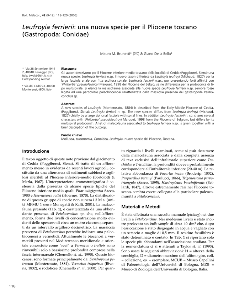 Boll. Malacol., 42 (9-12): 118-120 (2006) Leufroyia ferrierii: una nuova specie per il Pliocene toscano (Gastropoda: Conidae) Mauro M. Brunetti* () & Giano Della Bella# * Via 28 Settembre 1944 2, 40040 Rioveggio (BO), Italy, [email protected], () Coresponding Author # Via dei Cedri 93, 40050 Monterenzio (BO), Italy Riassunto Gli autori descrivono per il Pliocene inferiore-medio toscano della località di Cedda (Poggibonsi, Siena) una nuova specie: Leufroyia ferrierii n.sp. Il nuovo taxon differisce da Leufroyia leufroyi (Michaud, 1827) per la larga fasciola anale con fitta scultura spirale. Leufroyia ferrierii n.sp., pur presentando forti affinità con ‘Philbertia’ pseudoleufroyi Marquet, 1998 del Pliocene del Belgio, se ne differenzia per la protoconca di tipo multispirale. Si elenca la malacofauna associata alla nuova specie Leufroyia ferrierii n.sp. sembra fosse legata ad una particolare paleobiocenosi caratterizzata dalla massiccia presenza del gasteropode Petaloconchus sp. Abstract A new species of Leufroyia (Monterosato, 1884) is described from the Early-Middle Pliocene of Cedda, (Poggibonsi, Siena): Leufroyia ferrierii n. sp. The new species differs from Leufroyia leufroyi (Michaud, 1827) chiefly by a large siphonal fasciole with spiral lines. In addition Leufroyia ferrierii n. sp. shares several characters with ‘Philbertia’ pseudoleufroyi Marquet, 1998 from the Pliocene of Belgium, but differs by its multispiral protoconch. A list of malacofauna associated to Leufroyia ferrierii n.sp. is given together with a brief description of the outcrop. Parole chiave Mollusca, tassonomia, Conoidea, Leufroyia, nuova specie del Pliocene, Toscana. Introduzione Il taxon oggetto di queste note proviene dal giacimento di Cedda (Poggibonsi, Siena). Si tratta di un affioramento messo in evidenza da recenti lavori agricoli, costituito da una alternanza di sedimenti sabbiosi e argillosi riferibili al Pliocene inferiore-medio (Bortolotti & Merla, 1967). L’interpretazione cronostratigrafica è sostenuta dalla presenza di alcune specie tipiche del Pliocene inferiore-medio quali: Pitar subgigantea Sacco, 1900 e Hoernesarca rollei (Hoernes, 1870). La distribuzione di questo gruppo di specie non supera i 3 M.a. (unità MPMU 1 sensu Monegatti & Raffi, 2001). La malacofauna presente (Tab. 1), è caratterizzata da una abbondante presenza di Petaloconchus sp. che, nell’affioramento, forma due livelli di concentrazione molto evidenti dello spessore di circa un metro ciascuno, separati da un intervallo argilloso decimetrico. La massiccia presenza di Petaloconchus potrebbe indicare una paleobiocenosi a vermetidi. Attualmente le biocenosi a vermetidi presenti nel Mediterraneo meridionale e orientale conosciute come “reef” a Vermetus o trottoir sono rinvenibili solo a bassissime profondità comprese nella fascia intermareale (Chemello et. al., 1990). Queste biocenosi sono formate principalmente da: Dendropoma petraeum (Monterosato, 1884), Vermetus triquetrus (Bivona, 1832), e rodoficee (Chemello et. al., 2000). Per quan- 118 to riguarda i livelli esaminati, come si può desumere dalla malacofauna associata e dalla completa assenza di taxa esclusivi dell’infralitorale superiore come Trochiidae e Tricoliidae, la profondità doveva probabilmente corrispondere all’infralitorale inferiore (20-40 m). La relativa abbondanza di Favartia incisa (Broderip, 1832), Purpurellus veranyi (Paulucci, 1866), Trigonostoma parvotriangula (Sacco, 1895), Haedropleura bucciniformis (Bellardi, 1847), altrove estremamente rari nel Pliocene toscano, sembra essere collegata alla particolare paleocomunità a Petaloconchus. Materiali e Metodi È stata effettuata una raccolta manuale (picking) nei due livelli a Petaloconchus. Nei medesimi livelli è stato inoltre prelevato un bulk-sample di circa 40 dm3 che, dopo l’essiccazione è stato disgregato in acqua e vagliato con un setaccio a maglie di 0,5 mm. Il residuo fossilifero è stato determinato e contato. In Tab. 1 si riportano solo le specie più abbondanti nell’associazione studiata. Per la nomenclatura ci si è attenuti a Taylor et. al. (1993). Sono usate le seguenti abbreviazioni: H = altezza della conchiglia, D = diametro massimo dell’ultimo giro, coll. = collezione, es. = esemplare, MCUB = Museo Capellini di Paleontologia dell’Università di Bologna, MZB = Museo di Zoologia dell’Università di Bologna, Italia. Trigonostoma ampullaceum (Brocchi, 1814) Bittium deshayesi Cerulli-Irelli, 1912 Trigonostoma parvotriangula (Sacco, 1894) Turritella tricarinata tricarinata (Brocchi, 1814) Conus pyrula Brocchi, 1814 Turritella vermicularis (Brocchi, 1814) Conus mercati Brocchi, 1814 Archimediella varicosa (Brocchi, 1814) Clavatula interrupta (Brocchi, 1814) Rissoina pusilla (Brocchi, 1814) Clavatula (Trachelochetus) romana (Defrance, 1826) Aporrhais sp. Haedropleura bucciniformis (Bellardi, 1847) Petaloconchus sp. Crassispira leonardiana Della Bella & Scarponi, 2003 Cochlis raropunctata (Sasso, 1827) Leufroyia ferrierii n. sp. Neverita olla (De Serres, 1829) Strioterebrum reticulare (Pecchioli in Sacco, 1891) Niso cfr. eburnea (Risso, 1826) Nuculana cfr. pella (Linneo, 1767)* Purpurellus veranyi (Paulucci, 1866) Arca noae Linneo, 1758 Favartia incisa (Broderip, 1832) Anadara pectinata minor (Fontannes, 1879) Muricopsis cristata (Brocchi, 1814) Barbatia modioloides (Cantraine, 1835)* Ocinebrina imbricata (Brocchi, 1814) Hoernesarca rollei (Hoernes, 1870)* Ocinebrina ingloria (Crosse, 1865) Ostrea edulis Linneo, 1758 Heteropurpura polymorpha (Brocchi, 1814) Acanthocardia sp. Buccinulum corneum (Linneo, 1758) Bornia confusa Della Bella & Tabanelli, 2006 Pollia dorbignyi (Payraudeau, 1826) Tellina nitida (Poli, 1791) Fasciolaria cfr. fimbriata (Brocchi, 1814) Tellina sp. Fusinus rostratus (Olivi, 1792) Pitar subgigantea Sacco, 1900 Fusinus etruscus (Pecchioli, 1862) Venus foliaceolamellosa (Dillwyn, 1817) Nassarius olivii (Bellardi, 1882) Chamelea aff. gallina (Linneo, 17