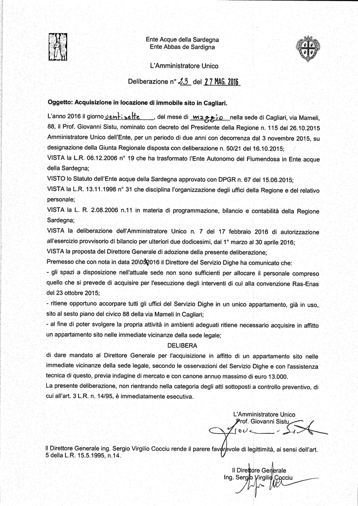 VISTO lo Statuto dell'Ente acque della Sardegna approvato con DPGR n. 67 del 15.06.2015;