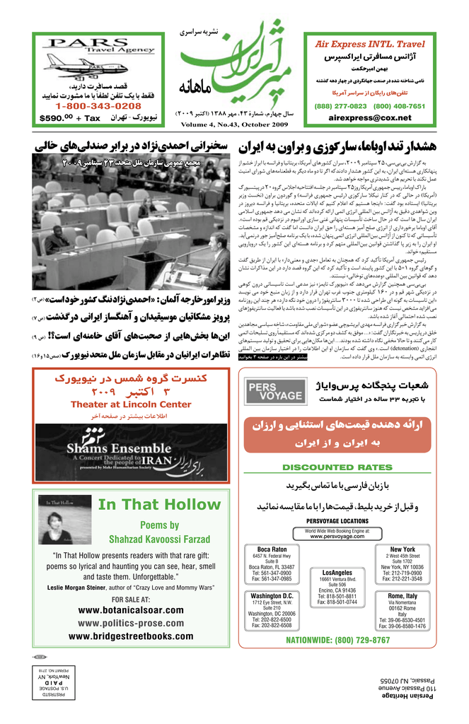 Èd�«d� t�dA� Air Express INTL. Travel آژاﻧﺲ ﻣﺴﺎﻓﺮﺗﻰ اﻳﺮاﻛﺴﭙﺮس ،ﻗﺼﺪ ﻣﺴﺎﻓﺮت دارﻳﺪ ﻓﻘﻂ ﺑﺎ ﻳﻚ ﺗﻠﻔﻦ ﻟﻄﻔ ًﺎ ﺑﺎ ﻣﺎ ﻣﺸﻮرت ﳕﺎﻳﻴﺪ 1-800-343-0208 $590.00 + Tax ﺗﻬﺮان- ﻧﻴﻮﻳﻮرك t�U�U� t��cÖ t�œ —UNÇ —œ Èœd~�UN� XFM —œ Áb� t��UM� v�U� ﺗﻠﻔﻦﻫﺎى راﻳﮕﺎن از ﺳﺮاﺳﺮ آﻣﺮﻳﻜﺎ (888) 277-0823 (800) 408-7651 ©≤∞∞π d���«® ±≥∏∏ dN� ¨¥≥ ÁÏ —UL� ¨Â—UNÇ ‰U� [email protected] Volume 4, No.43, October 2009 v�U� ÈU�v�bM� d�«d� —œ œ«ó�ÈbL�« v�«dM�� ≤∞∞π d��U�á� ≤≥ ¨b��� qK� ÊU�“U� v�uL� lL�� ©≤ ’® XLJ�dO�« sLN� åX�« œu� —uA� @M� œ«ó�ÈbL�«ò ∫ÊUL�¬ t�—U�—u�« d�“Ë X�cÖ—œ v�«d�« “U�~M�¬ Ë Ê«bOIO�u� ÊUO�UJA� e�ËdÄ °øX�« È«tM�U� ÈU�¬ ÈU�X�� “« v�U�g�� U�s�« „—u�uO� b��� qK� ÊU�“U� q�UI� —œ ÊUO�«d�« «d�UE� ©∑ ’® ©π ’® ©±∂ Ë ±µ h�® Ê«d�« t� ÊË«d� Ë È“u�—U� ¨U�U�Ë« bM� —«bA� “« rA� “«d�« U� t��«d� Ë UO�U��d� ¨UJ�d�¬ ÈU�—uA� Ê«d� ¨≤∞∞π d��U�á� ≤µ ¨v�v�v� ‘—«eÖ t� XOM�« È«—u� ÈU�t�UMFD� t� d~�œ ÁU� Ëœ U� dÖ« t�b�œ«œ —«bA� —uA� s�« t� ¨Ê«d�« È«t��� È—UJ�UNMÄ Æb� b�«u� t�«u� Èd�b�b� ÈU� r�d�� U� bMJ� qL� ¯—u���OÄ —œ ≤∞ ÁËdÖ ”ö�« tO�U���« t�K� —œ d��U�á� ≤µ“Ë— UJ�d�¬ È—uNL� fO�— ¨U�U�Ë« „«—U� d�“Ë X���® ÊË«d� ÊËœ—uÖ Ë ©t��«d� È—uNL� fOz—® È“u�—U� öJO� —UM� —œ t� v�U� —œ ©UJ�d�¬® —œ “Ëd�œ t��«d� Ë UO�U��d� ¨Áb��� ôU�« t� rOM� Âö�« t� rO��� U�M�«ò ∫XHÖ œu� ÁœU���« ©UO�U��d� v�ö�« È—uNL� b�œ v� ÊUA� t� b�«Áœd� tz«—« vL�« È˛d�« vKKL�« sO� f�«˛¬ t� oO�œ Èb�«u� s�Ë ÆåX�« Áœu� r� vJ�œe� —œ ÂuO�«—Ë« È“U� vM� v�UNMÄ U�O�Q� X�U� ‰U� —œ t� X�« U� ‰U� Ê«d�« UB�A� Ë Á“«b�« t� XHÖ U�« X��«œ Ê«d�« o� «— È«t��� eO�¬ `K� È˛d�« “« È—«œ—u�d� U�U�Ë« ÈU�¬ Æb�¬vL�—œ —u� eO�¬`K� t�U�d� p� U� ¨Áb� ÊUNMÄ vL�« È˛d�« vKKL�«sO� f�«˛¬ “« ÊuM� U� t� v�U�O�Q� v�Ë—U�Ë—ò p� «— —uA� s�« È«t��� t�U�d� Ë œd� rN�� vKKL�«sO� sO�«u� s��«cÖ UÄ d�“ t� «— Ê«d�« Ë« Æb�«u� årOI��� XHÖ o�d� “« Ê«d�« U� å—«œvMF� Ë Èb�ò q�UF� t� ÊUMâL� t� œd� bO�Q� UJ�d�¬ È—uNL� fOz— ÊUA� «d�«c� s�« —œ œ—«œ bB� ÁËdÖ s�« t� œd� bO�Q� Ë X�« bM��UÄ —uA� s�« U� µ´± ÁËdÖ ÈU�uÖ Ë ÆbM��O� åv�U�u� ÈU�Áb�Ëò vKKL�« sO� sO�«u� t� b�œ v�u� ÊË—œ v�U�O�U� X�« v�b� eO� åeL�U� „—u�uO�ò t� b�œv� ‘—«eÖ sOMâL� v�v�v� b��u� v� œu� l�M� ÊU�“ “« Ë œ—«œ —«d� Ê«dN� »d� »uM� Èd��uKO� ±∂∞ —œ Ë r� dN� vJ�œe� —œ t�U�“Ë— s�« bMÇ d� 圗«œ t~� œu� ÊË—œ «— ˛uH�d��U� ≥∞∞∞ U� Áb� v�«d� È« t�uÖ t� U�O�U� s�«ò ÈU�˛uH�d��U� XO�UF� U� b�U� Áb� VB� U�O�Q� s�« —œ È˛uH�d��U� “uM� t� X�O� h�A� b�«e�«v� Æb�U� Áb� “U�¬ v�UL��« Áb� VB� s�b�U�� v�UO� t�U� ¨åX�ËUI� vK� È«—u�ò uC� vÇrA�d�« ÈbN� t��«d� È—«eÖd�� ‘—«eÖ t� vL�« U�OK�� ÈË— ÎULOI��� t� b�«Áb� Èe�d� Ëœ nA� t� o�u� ÆÆÆò ∫XHÖ Ê«—U~�d�� t� f�—UÄ —œ oK� ÈU�r��O� bO�u� Ë oOI�� È«d� v�U�ÊUJ� U�s�« ÆÆÆb�œu� Áb� t��«œ ÁU~� vH�� ôU� U� Ë bMM�v� —U� vKKL�« sO� ÊU�“U� —UO��« —œ «— U�ö�« s�« Ë« ÊU�“U� t� XHÖ ÈË åÆX�« ©detonation® È—U�H�« ÆX�« Áœ«œ —«d� qK� ÊU�“U� t� t���«Ë vL�« È˛d�« bO�«u�� ≥ t�H� —œ Á—U� s�« —œ d�AO� „—u�uO� —œ fL� ÁËdÖ d�M� ٢٠٠٩ اﻛﺘﺒﺮ٣ ˛U�«Ë”dÄ t�U~�MÄ U�F� X�UL� —UO��« —œ t�U� ≥≥ t�d& U� Theater at Lincoln Center d�¬ t�H� —œ d�AO� U�ö�« Ê«“—« Ë v�UM���« ÈU�XLO� ÁbM�œ tz«—« Ê«d�« “« Ë Ê«d�« t� DISCOUNTED RATES b�dO~� ”U9 U� U� v�—U� ÊU�“ U� In That Hollow bOzU/ t��UI� U� U� «— U�XLO� ¨jOK� b�d� “« q�� Ë PERSVOYAGE LOCATIONS Poems by Shahzad Kavoossi Farzad “In That Hollow presents readers with that rare gift: poems so lyrical and haunting you can see, hear, smell and taste them. Unforgettable.” World Wide Web Booking Engine at: www.persvoyage.com Boca Raton Boca Raton, FL 33487 Tel: 561-347-0900 Fax: 561-347-0985 Leslie Morgan Steiner, author of “Crazy Love and Mommy Wars” FOR SALE AT: www.botanicalsoar.com www.politics-prose.com www.bridgestreetbooks.com New York 6457 N. Federal Hwy Suite B Washington D.C. 1712 Eye Str