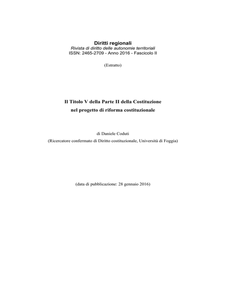 Diritti regionali Rivista di diritto delle autonomie territoriali ISSN: 2465-2709 - Anno 2016 - Fascicolo II (Estratto) Il Titolo V della Parte II della Costituzione nel progetto di riforma costituzionale di Daniele Coduti (Ricercatore confermato di Diritto costituzionale, Università di Foggia) (data di pubblicazione: 28 gennaio 2016) SOMMARIO: 1. Premessa. – 2.1. Le riforme inerenti alle Regioni: il riparto della potestà legislativa. – 2.1.1. Segue: la c.d. clausola di supremazia. – 2.1.2. Segue: la potestà regolamentare. – 2.2. Segue: il regionalismo differenziato e le Autonomie speciali. – 2.3. Segue: gli artt. 118 e 119 Cost. – 2.4. Segue: i controlli statali. – 3. La riforma del sistema degli enti locali. – 4. Conclusioni. 1. Premessa Il progetto di riforma costituzionale che, al momento in cui si scrive, è in discussione in Parlamento1 contempla delle modifiche particolarmente penetranti del Titolo V della Parte II della Costituzione, che pongono in discussione parte delle innovazioni introdotte con le riforme costituzionali del 1999 e del 20012. Mentre con riferimento al superamento del bicameralismo paritario la proposta di riforma appare profondamente innovativa, proponendosi di superare una delle scelte fondamentali dell’Assemblea costituente anche alla luce di un dibattito politico e scientifico sul ruolo del Senato che ha attraversato gran parte della storia repubblicana3, l’ipotizzata novella del Titolo V si presenta come una “riforma della riforma”4 o, forse, come una vera e propria “controriforma”5 del sistema dei rapporti tra centro e periferia. Al fine di esaminarle con il dovuto dettaglio, le modifiche ipotizzate nel disegno di legge costituzionale possono essere schematicamente suddivise in due parti: quelle che riguardano le 1 Si tratta del d.d.l. cost. A.C. 2613-B, XVII Legislatura. 2 Il riferimento è alle leggi costituzionali 22 novembre 1999 n. 1, 31 gennaio 2001 n. 2 e 18 ottobre 2001 n. 3. 3 Sul punto sembra sufficiente rinviare a G. RIVOSECCHI, Art. 55, in AA.VV., Commentario alla Costituzione, a cura di R. Bifulco, A. Celotto, M. Olivetti, II, Torino 2006, 1099 ss., per avere una panoramica del dibattito dai lavori dell’Assemblea costituente sino alla riforma costituzionale del 2005, bocciata dal referendum del 25 e 26 giugno 2006. 4 Così, ad es., S. GAMBINO, Una nuova riforma costituzionale per il Titolo V: soluzione intricata e compromesso difficile fra riassetto istituzionale ed esigenze in conflitto, in www.osservatorioaic.it, novembre 2015, 4. 5 In questi termini, ad es., M. CECCHETTI, Legge costituzionale n. 1 del 2012 e Titolo V della Parte II della Costituzione: profili di contro-riforma dell’autonomia regionale e locale, in www.federalismi.it, 24/2012, 1 ss. 217 Diritti regionali - Rivista di diritto delle autonomie territoriali (ISSN: 2465-2709) - 2016/2 Regioni e quelle inerenti agli enti locali. E in quest’ordine saranno ricostruite ed esaminate nelle prossime pagine. 2.1. Le riforme inerenti alle Regioni: il riparto della potestà legislativa Partendo dalle novità che riguardano le Regioni, il cuore della riforma del Titolo V è rappresentato dalla modifica dell’art. 117 Cost., nei commi che definiscono il riparto della potestà legislativa tra Stato e Regioni. Tratto caratterizzante della proposta di riforma costituzionale è la scomparsa della potestà legislativa concorrente, prevista sia dal vigente art. 117 Cost. sia dal testo costituzionale approvato nel 1947. Il “nuovo” art. 117 Cost., infatti, prevede nel co. 2 un elenco di materie rimesse alla potestà legislativa esclusiva dello Stato e nel co. 3 un elenco di materie la cui competenza spetta alle Regioni, oltre alla precisazione che la competenza delle Regioni si esercita «in ogni materia non espressamente riservata alla competenza esclusiva dello Stato». In questo modo, l’ipotizzata riforma pare volta a risolvere alcuni dei problemi emersi dopo la novella costituzionale del 2001. Innanzitutto, il disegno di legge costituzionale corregge quelli che sono stati considerati dei veri e propri errori nella definizione del riparto della potestà legislativa operata nel 20016, ad esempio, riportando nella competenza legislativa statale alcune materie per le quali sembra opportuna una disciplina uniforme sul territorio nazionale: commercio con l’estero (lett. q); produzione, trasporto e distribuzione nazionali dell’energia (lett. v); infrastrutture strategiche e grandi reti di trasporto e di navigazione di interesse nazionale e relative norme di sicurezza; porti e aeroporti civili, di interesse nazionale e internazionale (lett. z). In secondo luogo, come si è già anticipato, il “nuovo” art. 117 Cost. elimina la potestà legislativa concorrente tra Stato e Regioni, che, con la sua indeterminata distinzione tra norme statali di principio e norme regionali di dettaglio è spesso considerata tra le principali cause dell’aumento del contenzioso tra Stato e Regioni dinanzi alla Corte costituzionale7. Tuttavia, la 6 In proposito, A. D’ATENA, Diritto regionale, Torino 2010, 143-144, parla di «evidenti errori materiali». 7 Le critiche comunemente rivolte alla potestà ripartita per giustificarne la soppressione rappresentano un “argomento specioso” secondo A. RUGGERI, Una riforma che non dà ristoro a Regioni assetate di autonomia, in Le 218 Diritti regionali - Rivista di diritto delle autonomie territoriali (ISSN: 2465-2709) - 2016/2 soluzione ipotizzata è probabilmente meno idonea a ridurre la conflittualità tra Stato e Regioni di quanto possa prima facie apparire8. Infatti, nella “nuova” potestà legislativa statale rimangono alcuni ambiti di competenza la cui “trasversalità” consente di incidere comunque sulle materie regionali9 (è il caso, ad esempio, dei “livelli essenziali delle prestazioni concernenti i diritti civili e sociali che devono essere garantiti su tutto il territorio nazionale”, lett. m) e in taluni c
