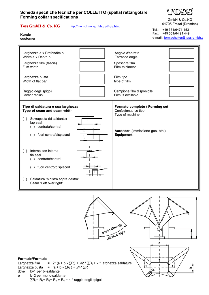 Scheda specifiche tecniche per COLLETTO (spalla) rettangolare Forming collar specifications Toss GmbH & Co. KG GmbH & Co.KG 01705 Freital (Dresden) http://www.hmw-gmbh.de/fsde.htm Tel.: +49 351/6471-153 Fax.: +49 351/64 91 449 e-mail: [email protected] Kunde customer Larghezza a x Profondita b Width a x Depth b Angolo d'entrata Entrance angle Larghezza film (fascia) Film width Spessore film Film thickness Larghezza busta Width of flat bag Film tipo type of film Raggio degli spigoli Corner radius Campione film disponibile Film is available Tipo di saldatura e sua larghezza Type of seam and seam width Formato completo / Forming set Confezionatrice tipo: Type of machine: ( ) Sovraposta (bi-saldante) lap seal ( ) centrata/central ( ) fuori centro/displaced Accessori (immissione gas, etc.): Equipment: ( ) Interno con interno fin seal ( ) centrata/central ( ) fuori centro/displaced ( ) Saldatura "sinistra sopra destra" Seam "Left over right" Formule/Formula Larghezza film = 2* (a + b - ∑Ri) + π/2 * ∑Ri + k * larghezza saldature Larghezza busta = (a + b - ∑Ri ) + π/4* ∑Ri dove k=1 per bi-saldante e k=2 per mono-saldante ∑Ri = R1+ R2+ R3 + R4 = 4 * raggio degli spigoli