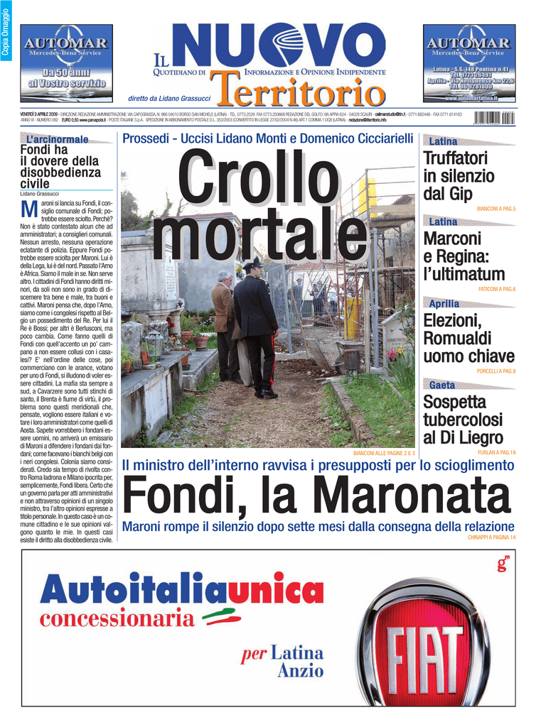 Copia Omaggio diretto da Lidano Grassucci VENERDÌ 3 APRILE 2009 - DIREZIONE REDAZIONE AMMINISTRAZIONE:VIA CAPOGRASSA, N. 966 04010 BORGO SAN MICHELE (LATINA) - TEL. 0773.2539 FAX 0773.250668 REDAZIONE DEL GOLFO:VIA APPIA 624 - 04028 SCAURI - [email protected] - 0771.682446 - FAX 0771.614163 ANNO VI - NUMERO 092 EURO 0,50 www.parvapolis.it - POSTE ITALIANE S.p.A. SPEDIZIONE IN ABBONAMENTO POSTALE D.L. 353/2003 (CONVERTITO IN LEGGE 27/02/2004 N.46) ART.1 COMMA 1 DCB (LATINA) - [email protected] L’ a rc i n o r m a l e F ondi ha i l do vere della disobbedienza civile Lidano Grassucci aroni si lancia su Fondi, il consiglio comunale di Fondi; potrebbe essere sciolto.Perchè? Non è stato contestato alcun che ad amministratori; a consiglieri comunali. Nessun arresto, nessuna operazione eclatante di polizia. Eppure Fondi potrebbe essere sciolta per Maroni. Lui è della Lega, lui è del nord.Passato l'Arno è Africa. Siamo il male in se. Non serve altro. I cittadini di Fondi hanno diritti minori, da soli non sono in grado di discernere tra bene e male, tra buoni e cattivi. Maroni pensa che, dopo l’Arno, siamo come i congolesi rispetto al Belgio un possedimento del Re. Per lui il Re è Bossi; per altri è Berlusconi, ma poco cambia. Come fanno quelli di Fondi con quell'accento un po’ campano a non essere collusi con i casalesi? E' nell’ordine delle cose, poi commerciano con le arance, votano per uno di Fondi, si illudono di voler essere cittadini. La mafia sta sempre a sud, a Cavarzere sono tutti stinchi di santo, il Brenta è fiume di virtù, il problema sono questi meridionali che, pensate, vogliono essere italiani e votare i loro amministratori come quelli di Aosta. Sapete vorrebbero i fondani essere uomini, no arriverà un emissario di Maroni a difendere i fondani dai fondani; come facevano i bianchi belgi con i neri congolesi. Colonia siamo considerati. Credo sia tempo di rivolta contro Roma ladrona e Milano ipocrita per, semplicemente, Fondi libera. Certo che un governo parla per atti amministrativi e non attraverso opinioni di un singolo ministro, tra l’altro opinioni espresse a titolo personale.In questo caso è un comune cittadino e le sue opinioni valgono quanto le mie. In questi casi esiste il diritto alla disobbedienza civile. M Prossedi - Uccisi Lidano Monti e Domenico Cicciarielli Crollo mortale L at ina Truffatori in silenzio dal Gip BIANCONI A PAG.5 L at ina Marconi e Regina: l’ultimatum FATICONI A PAG.6 Aprilia Elezioni, Ro m u a l d i uomo chiave PORCELLI A PAG.8 Gaeta Sospetta tubercolosi al Di Liegro BIANCONI ALLE PAGINE 2 E 3 FURLAN A PAG.19 Il ministro dell’interno ravvisa i presupposti per lo scioglimento Fondi, l a M a r o n a t a Maroni rompe il silenzio dopo sette mesi dalla consegna della relazione CHINAPPI A PAGINA 14 2 Incidente sul lavoro Tragedia ieri alle 13 nel cimitero di Prossedi. Ha ceduto parte della chiesa in fase di ristrutturazione Il Nuovo Territorio Venerdì 3 Aprile 2009 Crolla il campanile, 2 morti Due operai Lidano Monti di 52 anni e Domenico Cicciarelli di 46 anni hanno perso la vita. Indaga la Procura Dove ha ceduto il campanile Non ha retto la parte posteriore della chiesa dove sorgeva il campanile. La chiesa del cimitero Gli operai avevano lavorato lì per due mesi senza alcun problema, poi la tragedia. L’arrivo dei soccorsi La bara Domenico Cicciarelli ha tentato di scappare, ma è stato travolto dalle rovine Le salme sono a disposizione dell’autorità giudiziaria.Domani l’autopsia al Goretti Daniela Bianconi C ipressi, tanta umidità, del fango sull'asfalto della via che porta al cimitero di Prossedi. C'è ancora uno spiraglio di sole ma tutto intorno è buio, come mai è stato."Solo nella seconda Guerra Mondiale - ha raccontato Franco Solli, assessore al personale del Comune di Prossedi - abbiamo vissuto una simile tragedia. Una bomba travolse e uccise una famiglia che stava raccogliendo le cipolle". Solo le grida di dolore, e quel maledetto senso di impotenza completavano il quadro di un pomeriggio che nessuno avrebbe mai voluto vivere. Lidano Monti 52enne anni di Prossedi e operario della ditta di costruzione di Armando Monti stava lavorando alla ristrutturazione della chiesa - così aveva stabilito un anno e mezzo fa la stessa amministrazione comunale per riqualificare la strutture del 1700 nel cuore del cimitero cittadino quando è salito sul ponteggio che circonda il campanile. Con Lui Domenico Cicciarelli, 46anni anche lui residente a Prossedi. Poco dopo le 13, per cause che solo i carabinieri della compagnia di Terracina e il pubblico ministero Luigia Spinelli titolare dell'inchiesta potranno chiarire, il campanile è crollato. Lidano Monti,conosciutissimo come un bravo lavoratore, sposato e padre di Riccardo di 23 anni e Simona di 17 è morto sotto le macerie, forse senza nemmeno rendersi conto di quanto stava accadendo. Domenico Cicciarelli, e questo, se mai fosse possibile, rende ancora più atroce la sua morte, ha avuto il tempo di capire che la struttura stava per cedere. Ha provato a scappare, ma è stato del tutto inutile. Dopo qualche istante di agonia il suo cuore ha smesso di battere. Un'anziana donna del posto che era andata a far visita ad un suo parente scomparso ha visto il campanile crollare e quindi ha chiamato i soccorritori. Dalla centrale Ares del 118 sono partire due autoambulanze e un'eliambulanza, ma è stato tutto inutile. I due operai erano già morti. Da due mesi lavoravano ai resti della bella chiesa, mai nessun problema. Ma perché la struttura ieri mattina è crollata? Un ingegnere dei Vigili del Fuoco, sopraggiunto poco dopo i colleghi, ha svolto un primo sopralluogo. Al momento, fermo restando che bisognerà attendere l'esito delle perizie tecniche, l'ipotesi più probabile è che la pioggia battente degli ultimi giorni e le forte raffiche di vento di mercoledì abbiano causato un indebolimento della struttura. Con il passare dei minuti sono arrivati la moglie di Monti, Domenica e i suoi 