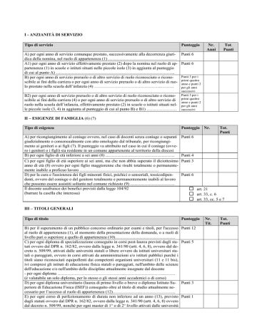 I - ANZIANITÀ DI SERVIZIO Tipo di servizio Punteggio Nr. Anni Tot. Punti A) per ogni anno di servizio comunque prestato, successivamente alla decorrenza giuri- Punti 6 dica della nomina, nel ruolo di appartenenza (1) ………………………………………… A1) per ogni anno di servizio effettivamente prestato (2) dopo la nomina nel ruolo di ap- Punti 6 partenenza (1) in scuole o istituti situati nelle piccole isole (3) in aggiunta al punteggio di cui al punto A) ……………………………………………………………………….. Punti 3 per i B) per ogni anno di servizio preruolo o di altro servizio di ruolo riconosciuto o riconoquattro scibile ai fini della carriera o per ogni anno di servizio preruolo o di altro servizio di ruo- primi anno e punti 2 lo prestato nella scuola dell’infanzia (4) ………………………………………..……… per gli anni B2) per ogni anno di servizio preruolo o di altro servizio di ruolo riconosciuto o riconoscibile ai fini della carriera (4) o per ogni anno di servizio preruolo o di altro servizio di ruolo nella scuola dell’infanzia, effettivamente prestato (2) in scuole o istituti situati nelle piccole isole (3, 4) in aggiunta al punteggio di cui al punto B) e B1) ………………… successivi Punti 3 per i primi quattro anno e punti 2 per gli anni successivi II – ESIGENZE DI FAMIGLIA (6) (7) Tipo di esigenza Punteggio Nr. A) per ricongiungimento al coniuge ovvero, nel caso di docenti senza coniuge o separati giudizialmente o consensualmente con atto omologato dal tribunale, per ricongiungimento ai genitori o ai figli (7). Il punteggio va attribuito nel caso in cui il coniuge (ovvero i genitori o i figli) sia residente in un comune appartenente al territorio della diocesi B) per ogni figlio di età inferiore a sei anni (8) ...…………….………………………… C) per ogni figlio di età superiore ai sei anni, ma che non abbia superato il diciottesimo anno di età (8) ovvero per ogni figlio maggiorenne che risulti totalmente o permanentemente inabile a proficuo lavoro ………………………………………………. D) per la cura e l'assistenza dei figli minorati fisici, psichici o sensoriali, tossicodipendenti, ovvero del coniuge o del genitore totalmente e permanentemente inabili al lavoro che possono essere assistiti soltanto nel comune richiesto (9) …………………………. Il docente usufruisce dei benefici previsti dalla legge 104/92 (barrare la casella che interessa) Punti 6 Tot. Punti Punti 4 Punti 3 Punti 6 art. 21 art. 33, c. 6 art. 33, cc. 5 e 7 III – TITOLI GENERALI Tipo di titolo Punteggio B) per il superamento di un pubblico concorso ordinario per esami e titoli, per l'accesso al ruolo di appartenenza (1), al momento della presentazione della domanda, o a ruoli di livello pari o superiore a quello di appartenenza (10)…………………………………… C) per ogni diploma di specializzazione conseguito in corsi post-laurea previsti dagli statuti ovvero dal DPR n. 162/82, ovvero dalla legge n. 341/90 (artt. 4, 6, 8), ovvero dal decreto n. 509/99, attivati dalle università statali o libere ovvero da istituti universitari statali o pareggiati, ovvero in corsi attivati da amministrazioni e/o istituti pubblici purché i titoli siano riconosciuti equipollenti dai competenti organismi universitari (11 e 11 bis), ivi compresi gli istituti di educazione fisica statali o pareggiati, nell'ambito delle scienze dell'educazione e/o nell'ambito delle discipline attualmente insegnate dal docente - per ogni diploma ………………………………………..………………………..……. (è valutabile un solo diploma, per lo stesso o gli stessi anni accademici o di corso) D) per ogni diploma universitario (laurea di primo livello o breve o diploma Istituto Superiore di Educazione Fisica (ISEF)) conseguito oltre al titolo di studio attualmente necessario per l’accesso al ruolo di appartenenza (12)……………….……………………. E) per ogni corso di perfezionamento di durata non inferiore ad un anno (13), previsto dagli statuti ovvero dal DPR n. 162/82, ovvero dalla legge n. 341/90 (artt. 4, 6, 8) ovvero dal decreto n. 509/99, nonché per ogni master di 1° o di 2° livello attivati dalle università Punti 12 Punti 5 Punti 3 Punti 1 Nr. Tit. Tot. Punti statali o libere ovvero da istituti universitari statali o pareggiati (11 bis), ivi compresi gli istituti di educazione fisica statali o pareggiati nell'ambito delle scienze dell'educazione e/o nell'ambito delle discipline attualmente insegnate dal docente (14) - per ogni corso……………………………………….…………………………………. (è valutabile un solo corso, per lo stesso o gli stessi anni accademici) F) per ogni diploma di laurea con corso di durata almeno quadriennale (ivi compreso il Punti 5 diploma di laurea in scienze motorie), per ogni diploma di laurea magistrale (specialistica), di accademia di belle arti, di conservatorio di musica, conseguito oltre al titolo di studio attualmente necessario per l'accesso al ruolo di appartenenza (12) ……………….. G) per il conseguimento del titolo di "dottorato di ricerca” …………………………….. Punti 5 (si valuta un solo titolo) H) per la sola scuola primaria, per la frequenza del corso di aggiornamento-formazione Punti 1 linguistica e glottodidattica compreso nei piani attuati dal ministero, con la collaborazione degli Uffici scolastici provinciali, delle istituzioni scolastiche, degli istituti di Ricerca (ex IRRSAE-IRRE, BDP-INDIRE, CEDE, oggi, rispettivamente, ANSAS, INVALSI) e dell'università …………………………………………………………………………… N.B.: I titoli relativi a C), D), E), F), G), H), anche cumulabili tra di loro, sono valutati fino ad un massimo di Punti 10. Per le note si rinvia all’Allegato D del CCNI 20.12.2007. Punteggio complessivo (riservato alla se