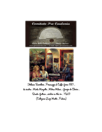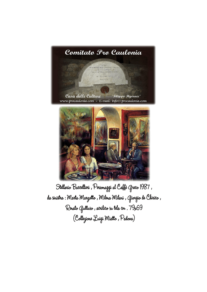 COMITATO << PRO CAULONIA >> COMITATO CITTADINO PER LA TUTELA E LA SALVAGUARDIA DEL PATRIMONIO STORICO , ARTISTICO, ARCHITETTONICO, CULTURALE ED AMBIENTALE DEL CENTRO STORICO E DEL TERRITORIO DÌ CAULONIA Codice Fiscale : 90025260804 – Indirizzo : Via Porta Allaro – s.n.c. – 89041 Caulonia (RC) – E-mail: info@procaulonia-comSito:www.procaulonia.com Al Dott. Giovanni Riccio Sindaco del Comune di Caulonia OGGETTO : Conferimento cittadinanza onoraria di Caulonia al Maestro Stellario Baccellieri “Il Pittore del Caffè Greco”.- Per il raggiungimento dei Suoi scopi istituzionali che riguardano principalmente la tutela e la valorizzazione del patrimonio storico, artistico, culturale ed ambientale di Caulonia, questo Comitato, costituitosi in data 05.07.2010 per iniziativa di alcuni cittadini cauloniesi, pure con gravi difficoltà tenuto conto delle scarse risorse economiche di cui si può avvalere,cerca di svolgere varie attività. Tra queste, in particolare, quella tendente allo studio e ricerca di figure e personaggi che nel passato e nel periodo attuale si sono significatamente distinti nei campi di loro attività, ottenendone chiari riconoscimenti, e che er ragioni varie (nascita – frequentazioni – impegni di lavoro e quanto altro) hanno avuto in qualche modo rapporti con CauloniaNell’ambito di tale ricerca meritevole di tale attenzione è subito apparsa la figura del Maestro Stellario Baccellieri, meglio noto come “il Pittore del Caffè Greco” (A. D. 1760 di Roma) e dei caffè antichi d’Italia quali , il Florian di Venezia, il Pedrocchi di Padova , il Bar Posta di Cortina, la Piazzetta di Capri ed altri ancora. Comunque il suo habitat naturale è stato e rimane, anche se in questi ultimi anni sono sempre più frequenti i suoi ritorni in Calabria, il Caffè Greco che incominciò a frequentare fin dal suo arrivo a Roma, prima saltuariamente e poi in maniera stabile, lasciando la sua Calabra. Così ben presto il Caffè Greco diventò la sua sede fissa di vita e lavoro, specie dopo un magico incontro proprio al Caffè Greco con il grande Giorgio De Chirico cui fece alcuni ritratti che gli piacquero tanto da interessarlo al suo lavoro da artista e a spingerlo ed incoraggiarlo a continuare , suggerendogli tra l’altro, di non lasciare il Caffè Greco. L’antico caffè divenne il “paesaggio” di elezione, come agli stesso ebbe a dire in una sua intervista, “con la sua straordinaria atmosfera, i suoi spettri di un passato glorioso, il fascino unico ed irripetibile. Un paesaggio che emana cultura da ogni tavolo, da ogni parete, da ogni angolo”. In tale contesto, in vero il Maestro si trova sempre più a suo agio e ne diventa quasi un elemento di arredo, tra velluti rossi, specchi opalescenti e cornici dorate, immancabilmente seduto al suo tavolino… di lavoro con i suoi pennelli, colori e tavolozze, sempre intento ad osservare, scrutare e dipingere persone, oggetti, incontri, amori, addii e storie di ogni genere e varia umanità. Questa, ovviamente per lui, è anche occasione di conoscere e farsi conoscere (con molti instaura, data la sua innata simpatia e semplicità, veri e propri rapporti di amicizia sinceri e duraturi nel tempo)da personaggi più o meno illustri della Cultura in ambito della pittura (come Guttuso, Warhol, Schifano, Sughi ecc.), del cinema (come Pampanini, Lollobrigida, Valentina Cortese, Elsa Martinelli, Fellini e Masina, Linda Christian, Ettore Scola, Melina Mercuri ecc.). Sandro Pertini ogni sabato mattina, prima di sorbire la sua tazzina di caffè cercava il maestro (“dove è il nostro maestro”? ripeteva con la sua inconfondibile voce) per salutarlo e scambiare con lui qualche impressione e spesso gradiva l’omaggio di qualche suo quadro, premi nobel , re e regine, principi e principesse , alti prelati ed ovviamente tanti anonimi turisti provenienti da ogni parte d’Italia e del mondo, attratti dalla sempre splendida bellezza di Roma e desiderosi di vivere per il tempo possibile l’atmosfera del mitico caffè. E molti vanno via portando con sé un quadro più o meno grande a ricordo di quella sosta più o meno breve e di un incontro sicuramente indimenticabile con un personaggio singolare e di altri tempi come “il Pittore del Caffè Greco” che dipinge … dal vero. Nell’Arte del Maestro non sono certo mancati nel tempo riconoscimenti ed apprezzamenti com’è dimostrato dai positivi giudizi espressi dai più famosi critici di arte (che vedono nei suoi dipinti tratti e colori di Toulouse Lautrec – assonanze con De Pisis ecc.), dalle numerose mostre di arte cui ha partecipato o appositamente organizzate per lui (il Consiglio Regionale della Calabria, qualche anno fa ha ritenuto di organizzare una sua “Personale” proprio nei saloni dell’Assemblea per rendere doveroso omaggio alla sua apprezzata bravura di artista ed alla sua “calabresità”, come d’altra parte non sono mancati riconoscimenti nella sua vita civile (Oscar Luigi Scalfato lo nomina Cavaliere e da qualche anno è Commendatore della Repubblica Italiana per nomina di Giorgio Napolitano). Ma che c’entra tutto quanto detto e “Stellario” , come lui ama essere chiamato con Caulonia? C’entra ed anche molto perché Stellario ha insegnato per circa una diecina di anni (dal 1970 al 1980) nella Scuola Media di Caulonia “Disegno ed Educazione artistica” spostandosi ogni giorno dalla Sua Reggio Calabria con il mezzo da lui preferito :”Autostop” con la pioggia, con il sole, con il freddo e con il caldo, con e senza vento. L’arrivo a Caulonia, al “Baglio”, dove era la sede della Scuola, era ogni volta una vera conquista di libertà ed un momento di vera ed intima felicità come spesso ama ricordare. Di lui si ricordano ancora con stima e simpatia suoi ex colleghi ed ex allievi che spesso nelle ore di lezione accompagnava nei vicoli, nelle piazzette e nella campagna di Caulonia per insegnare loro il disegno e la pittura … dal vivo) , tante famiglie a