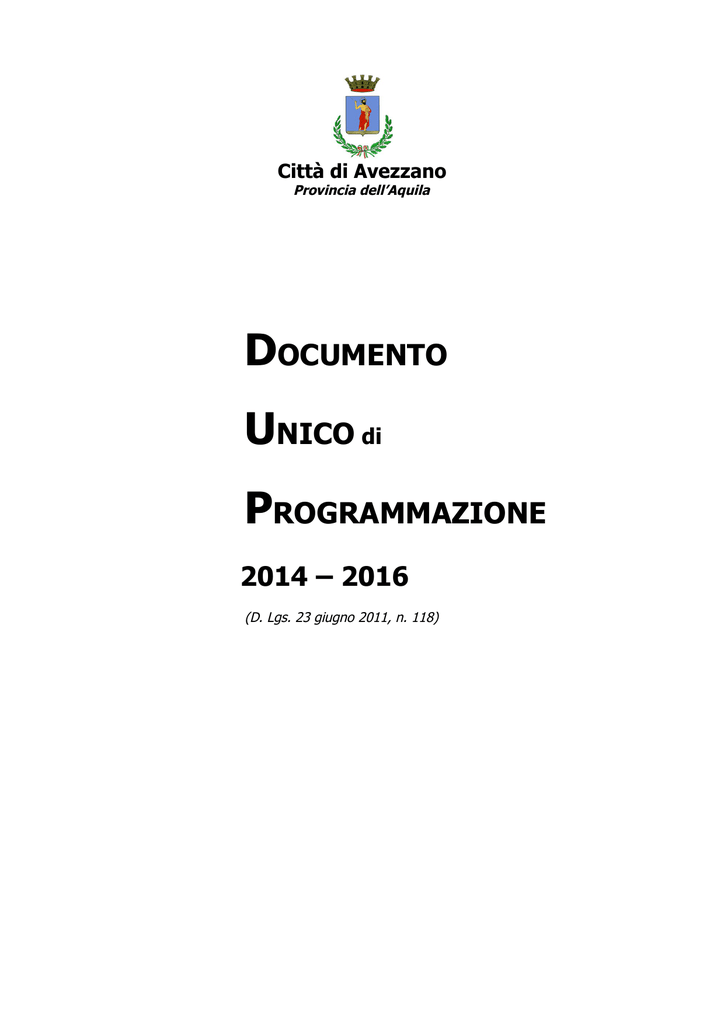 Città di Avezzano Provincia dell’Aquila DOCUMENTO UNICO di PROGRAMMAZIONE 2014 – 2016 (D. Lgs. 23 giugno 2011, n. 118) 2 INDICE PREMESSA A) Sezione Strategica..........................................................................................pag. 7 Linee programmatiche di mandato....................................................................pag. 11 Analisi delle condizioni esterne..........................................................................pag. 28 1) obiettivi individuati dal governo....................................................................pag. 28 2) valutazione della situazione socio-economica del territorio................................pag. 29 a) caratteristiche generali della popolazione....................................................pag. 29 b) caratteristiche generali del territorio...........................................................pag. 30 c) strutture e attrezzature............................................................................pag. 31 3) parametri economici................................................................................... pag. 32 a) indicatori finanziari..................................................................................pag. 32 b) indici di pre-dissesto................................................................................pag. 33 c) criteri di virtuosità...................................................................................pag. 33 Analisi delle condizioni interne...........................................................................pag. 34 1) organizzazione e modalità di gestione dei servizi pubblici locali.........................pag. 34 2) organismi interni e partecipazioni..................................................................pag. 35 3) indirizzi generali di natura strategica.............................................................pag. 36 a) investimenti e realizzazione di opere pubbliche..............................................pag. 36 b) programmi e progetti di investimento in corso...............................................pag. 40 c) tributi e tariffe dei servizi pubblici................................................................pag. 41 d) spesa corrente e in conto capitale................................................................pag. 45 e) risorse finanziarie......................................................................................pag. 46 f) gestione del patrimonio..............................................................................pag. 49 g) risorse straordinarie e in conto capitale.........................................................pag. 49 h) indebitamento...........................................................................................pag. 49 i) equilibri correnti, generali e di cassa............................................................pag. 50 4) risorse umane.............................................................................................pag. 54 5) patto di stabilità interno...............................................................................pag. 57 B) Sezione Operativa.........................................................................................pag. 58 I numeri del Bilancio di Previsione 2014 e del Bilancio Pluriennale 2014-2016...............pag. 60 Missione Missione Missione Missione Missione Missione Missione Missione Missione Missione Missione Missione Missione Missione Missione Missione Missione Missione Missione Missione 1 1 1 1 1 1 1 2 3 4 4 5 5 6 6 7 8 9 9 9 – – – – – – – – – – – – – – – – – – – – programma programma programma programma programma programma programma programma programma programma programma programma programma programma programma programma programma programma programma programma 1 2 3 4 5 6 7 1 1 1 2 1 2 1 2 1 1 2 3 4 – Organi istituzionali.......................................................pag. 62 – Segreteria generale......................................................pag. 64 - Gestione economica finanziaria, programmazione, provveditorato...pag. 66 - Gestione delle entrate tributarie e servizi fiscali..............................pag. 70 - Gestione dei beni demaniali e patrimoniali.......................pag. 72 – Ufficio tecnico..............................................................pag. 74 - Elezioni e consultazioni elettorali – Anagrafe e stato civile..pag. 78 – Giustizia – Uffici giudiziari.............................................pag. 82 - Polizia locale e amministrativa........................................pag. 84 - Istruzione pre-scolastica...............................................pag. 88 - Altri ordini di istruzione.................................................pag. 90 – Valorizzazione dei beni di interesse storico......................pag. 92 - Attività culturali e interventi diversi nel settore culturale....pag. 94 - Sport e tempo libero.....................................................pag. 98 – Giovani.....................................................................pag. 100 - Sviluppo e valorizzazione del turismo............................pag. 102 - Urbanistica e assetto del territorio................................pag. 104 - Tutela, valorizzazione e recupero ambientale..................pag. 106 – Rifiuti.......................................................................pag. 108 - Servizio idrico integrato...............................................pag. 110 3 Missione 9 – prog. 5 - Aree protette, parchi naturali, protez. Naturalist. e forestazione.pag. 112 Missione 10 – programma 5 – Viabilità e infrastrutture stradali.................................pag. 114 Missione 11 – programma 1 - Sistema di protezione civile........................................pag. 118 Missione 12 – programma 1 - Interventi per l’infanzia e i minori e per asili nido..........pag. 120 Missione 12 – programma 2 - Interve