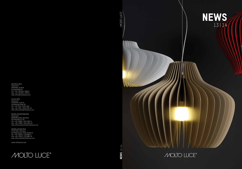 NEWS 13 | 14 Zentrale Wels Showroom 4600 Wels, Austria Europastraße 45 Tel.: +43 / [0]7242 / 698-0 Fax: +43 / [0]7242 / 60376 mail: [email protected] Filiale Wien Showroom 1230 Wien, Austria Vorarlberger Allee 28 Tel.: +43 / [0]1 / 616 0 300 Fax: +43 / [0]1 / 616 0 300-40 mail: [email protected] Niederlassung München Showroom 80636 München, Germany Arnulfstraße 37-39 Tel.: +49 / [0]89 / 452 0 565-0 Fax: +49 / [0]89 / 452 0 565-20 mail: [email protected] Niederlassung Köln 51107 köln, Germany Gut Maarhausen, Eiler Straße 3v Tel.: +49 / [0]221 / 222 882-0 Fax: +49 / [0]221 / 222 882-20 mail: [email protected] NEWS 13 | 14 www.moltoluce.com Hängeleuchten Pendants ESILE 16-17 LAMELLA 06-11 SOFT 12-13 Wand-/ Deckenleuchten Wall / ceiling luminaires BALANCE 18-19 BORN 2B LED 34-55 SOFT 14-15 SYSTEM 01 62-63 Stehleuchten Stand luminaires PURIST 56-57 SYSTEM 01 58-59 Aussenleuchten Outdoor luminaires Einbauleuchten Recessed luminaires Schienenleuchten & Systeme Track luminaires & systems BALANCE 18-19 SYSTEM 01 60-61 LEGENDE / LEGEND OBERFLÄCHENFARBEN / SURFACE COLOURS BALANCE 18-19 BORN 2B LED LINEAR 32-33 ILLUMINI 64-71 BORN 2B LED 34-55 FINE LINE 20-23 UNO 24-31 AE Aluminium eloxiert / aluminium anodized C chrom / chrome P perlchrom / pearl chrome S silbergrau / silver grey WO weiß opal / white opal W weiß / white S schwarz / black GB graubraun / grey beige R Rot / red E Eternit / Eternit LED FARBEN / LED COLOURS CLIP 72-75 TRATTO 76-77 W3 LED warmweiß / warm white W4 LED neutralweiß / neutral white = Produkt nur mit LED-Technologie erhältlich = Product only available with LED-technology = Produkt mit LED- oder konventioneller Leuchtmitteltechnologie erhältlich = Product available with LED- or conventional lamp technology TECHNISCHE INFO / TECNICAL INFO 33º Ausstrahlwinkel / beam angle INFO: Eternitleuchtenserien SOFT & CLIP Jeder einzelne Leuchtenschirm wird per Hand aus Faserzement geformt. Jede Leuchte ist somit ein Unikat.Der Faserzement wird aus natürlichen Rohstoffen umweltschonend hergestellt. Seine unvergleichlich einzigartige Materialstruktur verleiht der Leuchte ein langlebiges, unverwechselbares und vor allem ausdruckstarkes Erscheinungsbild. Die Eigenschaften hart und zäh machen Faserzement zu einem witterungsbeständigen Werkstoff, der für die Verwendung im Außenbereich sehr gut geeignet ist. Die unbehandelte Oberfläche ist wasserdicht und verursacht keine umweltschädliche Auswaschungen. dreh- und schwenkbar / pivoting and twistable drehbar / pivoting schwenkbar/ twistable starr / fixed 04 INHALT / CONTENT INFO: Eternit luminaire series SOFT & CLIP Each individual luminaire shade is shaped manually from fibre cement. Hence each luminaire is unique. The fibre cement is produced eco-friendly from natural resources. Its unique surface structure provides for a long lasting, incomparable and particularly expressive appearance. The characteristics hard and tough make fibre cement a weather-proof material which is most suitable for outdoor applications. The untreated surface is waterproof and does not wash out any polluting substances. 05 06 LAMELLA Design: March Gut 07 Sospensione con lamelle in metallo verniciate. Colori standard: nero, bianco, beige, rosso orientale. 1 x QPAR16 · GU10 · 230V · max. 50W oder/or LED RETROFIT · GU10 592-11034 S 592-1105 W 592-11033 GB 592-11038 R 80mm 4,5kg 31mm Pendant luminaire with lamellas made from varnished steel. Each model is available in jet black, white, grey beige, or oriental red. LAMELLA FRAGOLA Hängeleuchte / LAMELLA FRAGOLA pendant max. 1500mm Hängeleuchte mit Lamellen in drei Modellen erhältlich, jedes Model gibt es in 4 Farben. IP 20 347mm Suspension avec lamelles métalliques lacqué. Couleurs standard: noir, blanc, beige, rouge orient. Ø 347mm LAMELLA MELA Hängeleuchte / LAMELLA MELA pendant 592-1205 W 592-12033 GB 592-12038 R 80mm 7,5kg 426mm S max. 1500mm 592-12034 31mm 1 x A60-ECO · E27 · 230V · max. 47W oder/or LED RETROFIT · E27 08 LAMELLA Design: March Gut Ø 526mm 09 Hängeleuchte mit Lamellen in drei Modellen erhältlich, jedes Model gibt es in 4 Farben. LAMELLA PESCA Hängeleuchte / LAMELLA PESCA pendant Pendant luminaire with lamellas made from varnished steel. Each model is available in jet black, white, grey beige, or oriental red. 592-14034 S 592-1405 W 592-14033 GB 592-14038 R 31mm 80mm 6,0kg max. 1500mm Sospensione con lamelle in metallo verniciate. Colori standard: nero, bianco, beige, rosso orientale. 1 x A60-ECO · E27 · 230V · max. 47W oder/or LED RETROFIT · E27 IP 20 250mm Suspension avec lamelles métalliques lacqué. Couleurs standard: noir, blanc, beige, rouge orient. Ø 620mm 10 LAMELLA Design: March Gut 11 1 x A60-ECO · E27 · 230V · max. 47W oder/or LED RETROFIT · E27 588-100 80mm E 320mm Sospensione con schermo in Eternit disponibile in due dimensioni, rosetta in grigio, cavo di sospensione L 1500mm incluso. 2,5kg 31mm Pendant luminaire with shade from Eternit. Available in two dimensions, canopy silver, including 1500mm suspension. SOFT S Hängeleuchte / SOFT S pendant max. 1500mm Hängeleuchte mit Schirm aus Eternit, in zwei Größen erhältlich, Baldachin silber, inkl. 1500mm Abhängung Suspension avec abat-jour en Eternit, disponible en deux tailles, boîtier en saillie en gris, câble de suspension L 1500 inclus. 220mm IP20 SOFT L Hängeleuchte / SOFT L pendant 1 x A60-ECO · E27 · 230V · max. 47W oder/or LED RETROFIT · E27 5,0kg 365mm 31mm 80mm E max. 1500mm 588-200 440mm 12 SOFT Design: Rainer Mutsch 13 Wandleuchte mit Schirm aus Eternit, Direkt-/ indirekt strahlend Wall luminaire with shade from Eternit, direct- / indirect beam SOFT Wandleuchte / SOFT wall luminaire 1 x A60-ECO · E27 · 230V · max. 47W oder/or LED RETROFIT · E27 588-300 E 220 mm m 4m 11 Applique diretta/indiretta con schermo in Eternit IP20 320mm Applique dirècte/indir`cte avec abat-jour en Eternit 140 mm 14 SOFT Design: Rainer Mutsch 70mm 15 COMING SOON! 5 mm LED Hängeleuchte direkt-/