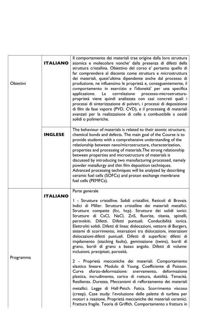 Obiettivi Il comportamento dei materiali trae origine dalla loro struttura ITALIANO atomica e molecolare nonche’ dalla presenza di difetti della struttura cristallina. Obiettivo del corso e’ pertanto quello di far comprendere al discente come struttura e microstruttura dei materiali, quest’ultima dipendente anche dal processo di produzione, ne influenzino le proprietà e, conseguentemente, il comportamento in esercizio e l'idoneità' per una specifica applicazione. La correlazione processo-microstrutturaproprietà viene quindi analizzata con casi concreti quali i processi di sinterizzazione di polveri, i processi di deposizione di film da fase vapore (PVD, CVD), e il processing di materiali avanzati per la realizzazione di celle a combustibile a ossidi solidi o polimeriche. INGLESE The behaviour of materials is related to their atomic structure, chemical bonds and defects. The main goal of the Course is to provide students with a comprehensive understanding of the relationship between nano/microstructure, characterization, properties and processing of materials.The strong relationship between properties and microstructure of materials is discussed by introducing two manufacturing processed, namely powder metallurgy and thin film deposition techniques. Advanced processing techniques will be analyzed by describing ceramic fuel cells (SOFCs) and proton exchange membrane fuel cells (PEMFCs). Parte generale ITALIANO Programma 1 - Strutture cristalline. Solidi cristallini. Reticoli di Bravais. Indici di Miller. Strutture cristalline dei materiali metallici. Strutture compatte (fcc, hcp). Strutture dei solidi ionici. Strutture di CsCl, NaCl, ZnS, fluorite, titania, spinelli, perovskiti. Difetti. Difetti puntuali. Conducibilità ionica. Elettroliti solidi. Difetti di linea: dislocazioni, vettore di Burgers, sistemi di scorrimento, interazioni tra dislocazioni, interazioni dislocazioni-difetti puntuali. Difetti di superficie: difetti di impilamento (stacking faults), geminazione (twins), bordi di grano, bordi di grano a basso angolo. Difetti di volume: inclusioni, precipitati, porosità. 2 - Proprietà meccaniche dei materiali. Comportamento elastico lineare. Modulo di Young. Coefficiente di Poisson. Curva sforzo-deformazione: snervamento, deformazione plastica, incrudimento, carico di rottura, duttilità. Tenacità. Resilienza. Durezza. Meccanismi di rafforzamento dei materiali metallici. Legge di Hall-Petch. Fatica. Scorrimento viscoso (creep). Case study: l’evoluzione delle palette di turbina per motori a reazione. Proprietà meccaniche dei materiali ceramici. Frattura fragile. Teoria di Griffith. Comportamento a frattura in termini statistici (Weibull). Materiali polimerici. Polimeri amorfi e semi-cristallini. Temperatura di transizione vetrosa. Comportamento viscoelastico. Reticolazione. Materiali compositi. Proprietà meccaniche dei compositi. Condizioni di isosforzo e isodeformazione per compositi con fibre continue allineate. Compositi rinforzati con particelle. Cermet. Compositi a matrice metallica (MMC). Parte specialistica 3 - Processi di sinterizzazione di polveri. Principi fondamentali. Equazione di Laplace. Stadi della sinterizzazione. Evoluzione della microstruttura. Tecniche di misura del grado di avanzamento della sinterizzazione. Additivi di sinterizzazione: principi di funzionamento. Sinterizzazione con fase liquida. Diagramma di German. Processi di sinterizzazione pressure-assisted (HIP). Case study: la sinterizzazione del carburo di tungsteno cementato (WC-Co). 4 - Rivestimenti avanzati da fase vapore. Processi di deposizione fisica (PVD): evaporazione, sputtering, magnetron sputtering, processi ad arco, arco filtrato. Processi di deposizione chimica da vapore (CVD). CVD termico, CVD assistito da plasma, Hot Filament CVD. Parametri di processo, microstruttura dei rivestimenti e proprietà. Case study: deposizione di film di diamante micro- e nano-strutturati. 5 - Materiali per celle a combustibile a ossidi solidi (SOFC) e polimeriche (PEMFC): scelta, proprietà e processing degli elettrodi e dell’elettrolita. INGLESE Crystal structures and defects.Bravais lattice. Lattice planes and directions. Miller indices. Unit cell contents, crystal densities and formulae. Descriptive crystal chemistry: metals and alloys (bcc, fcc & hcp structures). Ionic structures: CsCl, NaCl, ZnS, fluorite, titania, spinel, perovskite. Point defects. Nonstoichiometry. The Arrhenius equation for ionic conductivity. Extended defects. Dislocations, Edge and Screw Dislocations. The Burgers Vector. The Burgers Circuit. Slip Systems. Critical resolved shear stress (Schmid's Law). Grain boundaries, lowangle boundary, stacking faults, twins. Volume defects. Mechanical behaviour of solids. Definitions of Stress, Strain and Stiffness. Energy-Separation Curves for Inter-atomic Bonds. Hooke's law. Young's modulus. Poisson's ratio. Effect of temperature on stiffness. Thermal expansion of materials. Dislocation Glide as an Explanation of the Low Yield Stresses of Metals. Force on a Dislocation. Elastic Strain Energy stored in a Dislocation. Frank’s Rule. Dislocation Densities. Attraction and Repulsion between Dislocations. Cross-slip of Screw Dislocations. Dislocation climb. Annihilation, Rearrangement and Intersections. Work Hardening Effects. Precipitates as obstacles to Dislocations. Hall-Petch Law. Fatigue. The Paris law for fatigue crack growth rates. Creep. Stages of creep. Case study: the evolution of Ni-base superalloy turbine blades. Brittle fracture. Crack-initiated fracture. Griffith theory. Fracture statistics of brittle materials: Weibull distribution. Deformation of polymers. Amorphous and semi-crystalline polymers. Glass transition temperature. Viscoelastic behaviour. Cross-linking. Composite materials. Stiffness of long fibre composites. Axial loading: Voigt model. Transverse loading: Reuss model. Strength of composites. Cermets. Metal matrix composites (MMC). Sintering theory and practi